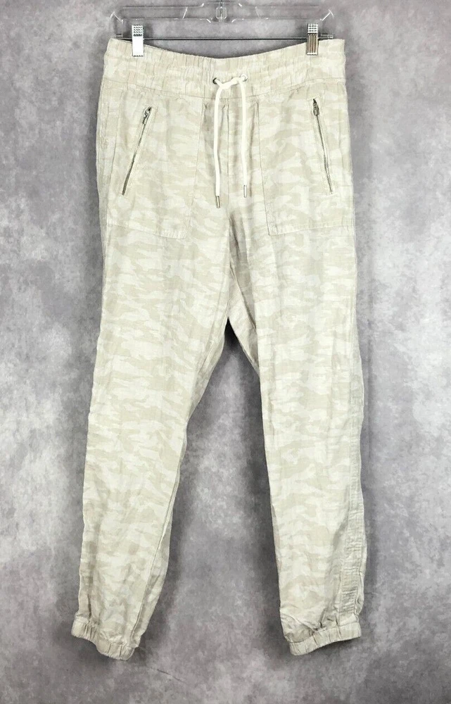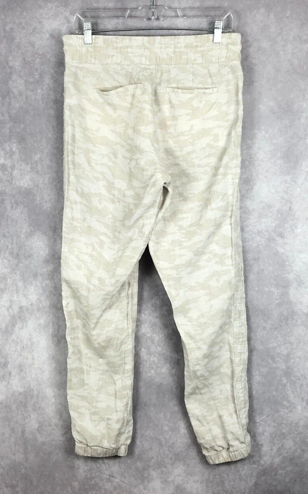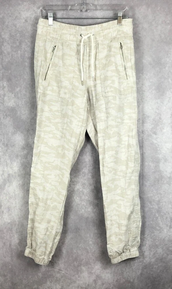 Athleta Cabo Tide Linen Camo Jogger Pants Size 4 Front zipper pockets. Drawstring. Elastic waist band. Back pockets. 100% linen Measures approximately: Waist 30" (unstretched & untied) Inseam 28" Excellent preowned condition. (N)