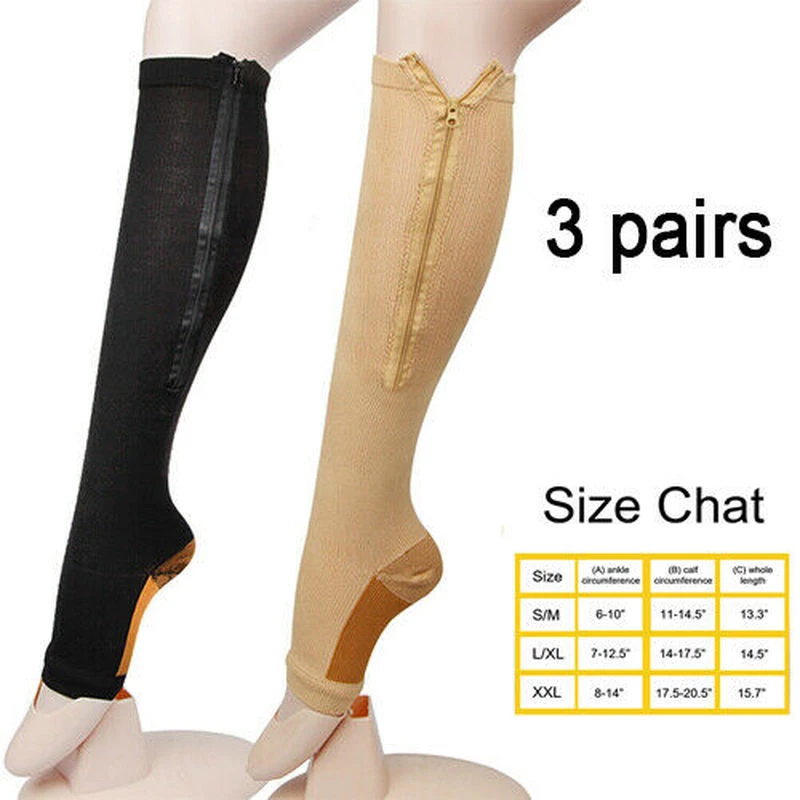 Zippered Compression Socks Support your ankle, foot-arch, and shin with these high quality zippered compression socks with medical-grade gradual compression. Whether you are suffering from Plantar Fascitiis, Varicose Veins, Swollen Feet or Swollen Ankles, these Zippered Compression Socks can provide superior support and compression where you need it the most. Each sock features a zipper to apply compression exactly where you need it. Support yourself in style regardless of your required size with our Beige or Black selections. Don't be fooled by the cheap, low-quality, and thin socks offered by our competitors. We pride ourselves in the quality and effectiveness of our Zippered Compression Socks. Take advantage of our 3 Pair specials on our Zippered Compression Socks and save! Dense structure excellently supports the varicose veins. Optimal compression increases blood flow during a long flight and prevents swelling. Flat seams secure comfort when worn. The heel zone is strengthened additionally that extends the service life of the products. Shoes Sizing Chart: --S/M Women's Shoe size 6 - 9, Men's Shoe Size 5 - 8.5 --L/XL Women's Shoe Size 9.5 -12.5, Men's Shoe Size 9 -11.5 Helps to: Protection of veins during traveling or sporting Chronic venous insufficiency Lower limb varicose veins Varicose veins during pregnancy Rehabilitation Specifications: Colors: Black/Beige Material: Nylon, Microfiber, Spandex; Machine Wash, Hang Dry Varicose Vein Stimulation of blood circulation Soothes and relieves achy feet Reduction in swelling Directions of Use 1. Flight Socks are designed to be worn in place of normal socks throughout your entire journey. 2. Always wear both socks and ensure they are pulled up to just below the knee (Depending on Your Height It may not reach well below knee level). ALL- DAY ENERGY Our advanced design supports critical muscles and tendons,and our proprietary blend of materials wicks moisture for a comfortable fit that goes the distance.Whether you need the best compression socks for running,walking,or for everyday comfort, we have two pair for you.For all-day energy,support,and comfort. WILL DO A LOT MOR E! The benefits of wearing Zipper Compression socks are immeasurable.Our Copper graduated compression socks put pressure in just the right spots to increase blood flow, calf Compression or other leg swelling issues. provide you with comfortable support, prevent cramping, fatigue, swelling and helps in muscle recovery. COMFORTAB LE The compression technology (15-20mmHg) provides the ideal compression to provide the maximum boost to your blood circulation. Stimulates blood flow and improves oxygen delivery to your muscles. This equals faster recovery and better performance. Reduces foot and leg swelling, lactic acid production and cramping. Package Contents: 1/3 Pairs Zipper C ompression Socks Shipping detail : All item are shipped within 1 business days once full payment is settled. If you can't get your items in time, please feel free to tell us first, we will check and solve it for you soon. In normal, it will be delivered within 2-7 days by USPS. Payment: *We accept all creditcards / echecks / credit or debitcards with PayPal. *you can take your time in 7 days to pay it. If you have problems of payment, feel free to contact us. If you have any other question about the product ,please feel free to contact us.