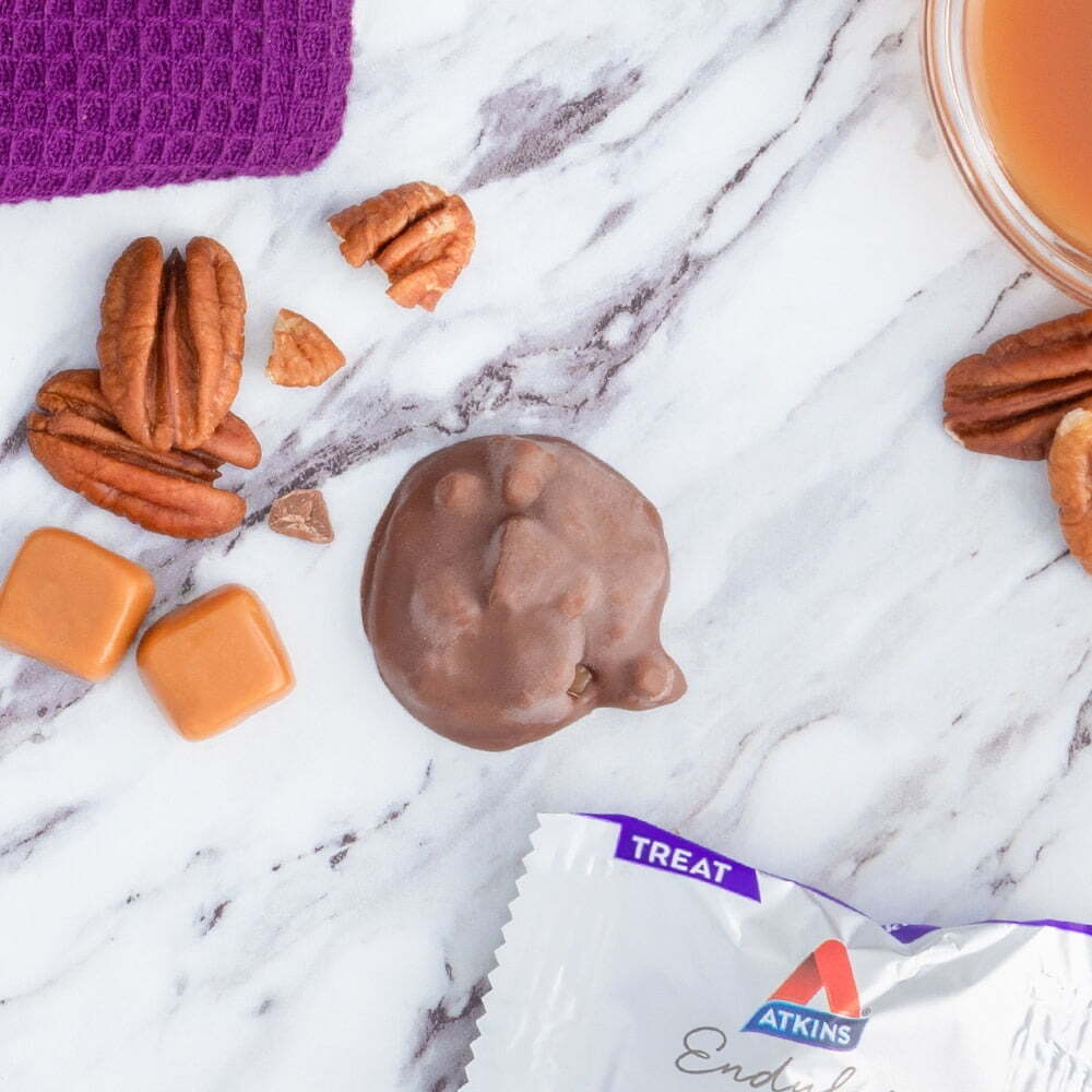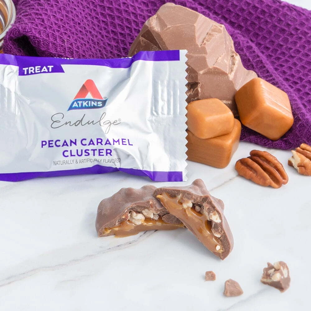 About this item Product details Satisfy your sweet tooth with Atkins Endulge Treats! Our decadent Pecan Caramel Clusters are sweet with 1g of sugar and 2g net carbs. Enjoy Atkins Endulge treats whenever you want sweets on your terms. Atkins Endulge Treat Pecan Caramel Clusters, 10-count. The Atkins Lifestyle – The Atkins Diet and Lifestyle is the original leading low-carb plan that provides quick, effective, and balanced weight loss my limiting carbs and sugar to help the body burn fat for fuel and keep your energy steady. Over 80 published clinical studies support that the science behind the principles of the Atkins Diet produces effective weight loss and long-term health benefits. Say goodbye to counting calories and say hello to today’s Atkins. Treats to satisfy your sweet tooth – Atkins Endulge Treats are decadent and sweet indulgences you can enjoy any time. They’re candies and sweets without all the sugar. Who doesn’t like the sound of that? PECAN CARAMEL CLUSTERS. Enjoy indulgent caramel and real roasted pecans wrapped in a rich chocolatey coating to satisfy your sweet tooth. The Atkins Endulge Treats delight your taste buds while keeping you true to your lifestyle. STAY ON TRACK. Stay true to the Atkins Diet and Lifestyle* with our Pecan Caramel Clusters. They provide 1 gram of protein and 8 grams of fiber per serving to help you achieve your daily goals. And, with 2 grams of net carbs and 2 grams of sugar per serving, this treat is perfect for a keto-friendly* lifestyle. *When used with Atkins ketogenic programs ALL TASTE. NO GUILT. A decadent chocolatey coating with indulgent caramel and real pecans delivers all the taste you crave with none of the guilt. SMART SNACKING. Atkins’ delicious and nutritious treats strike the perfect balance of indulgence and smart snacking. SOMETHING FOR EVERYONE. Atkins Endulge Treats have their own unique textures and flavors, offering the variety needed to satisfy all your cravings and help support your lifestyle.