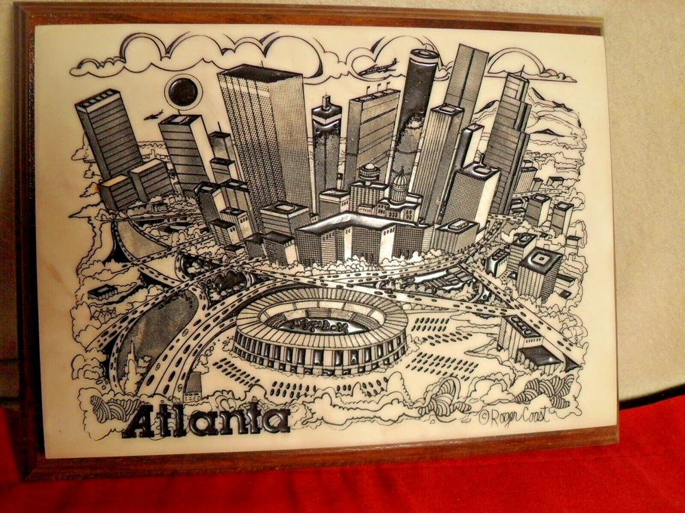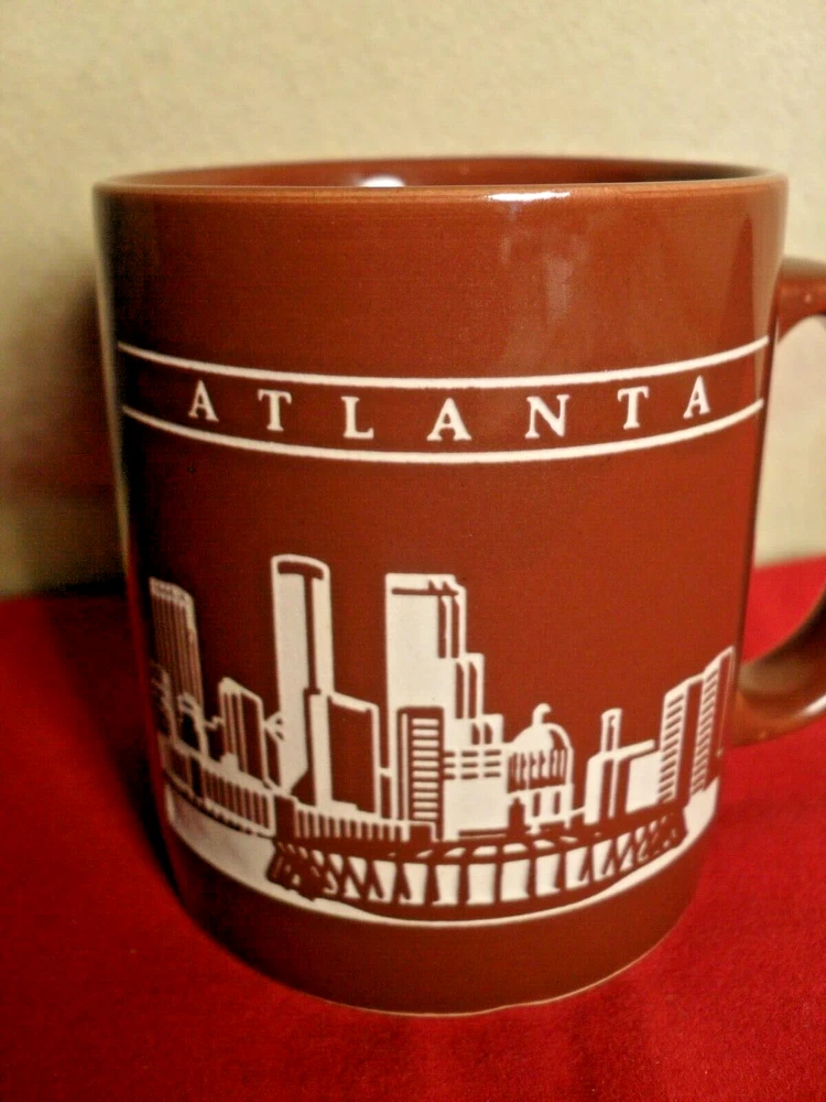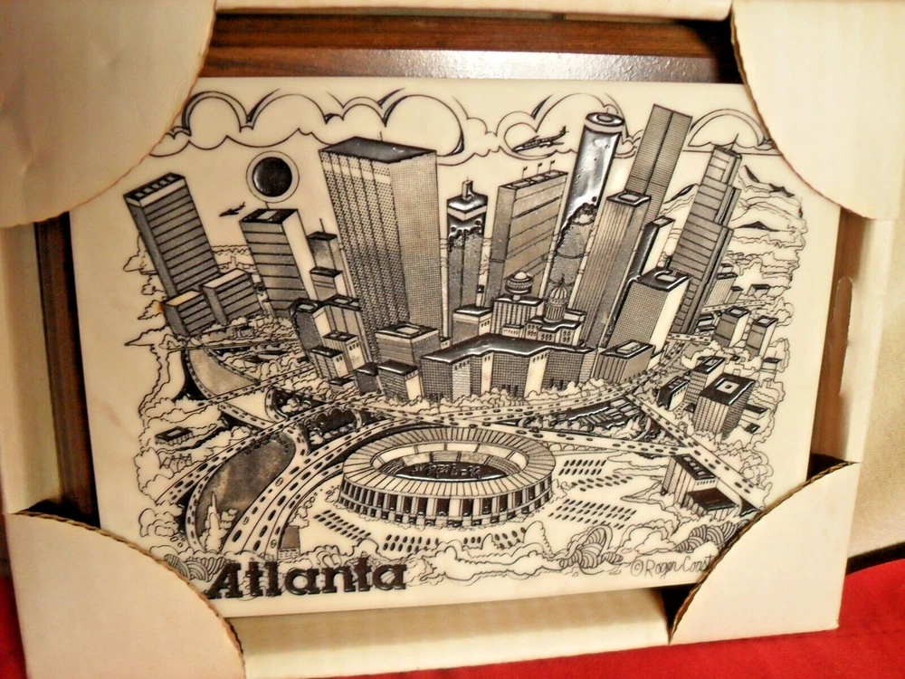 I own an advertising specialty company - now in our 45th year I am happy to report - and worked in the industry for many years prior to establishing my own firm. Over the years I collected many over-run samples, one-or-a-kind spec samples and the like. We are now in semi-retirement and offering some of those on eBay. Recently while searching through boxes of old samples I happened upon these three items related to Atlanta, Georgia. Due to the boxes and where i found them, I believe these to be from the 1990's. However, while somewhat old, all are in pristine as new condition - as evidenced by my photos. And here is what I found: * There was a very famous artist named Roger Coast. Unfortunately Mr. coast passed away last year at a respectably old age. In the 1990's the city of Atlanta commissioned Mr. Coast to create a stylized art version of Atlanta. In it he was to portray local landmarks. Among these were the old Atlanta Fulton County stadium, along with several notable hotels and office buildings - many of which are now gone. Thank you progress... One of our suppliers took this creative piece of art and created a lasting memento. This supplier manufactures items in synthetic marble. The material was very much like genuine marble, but allowed a better surface for etching. Although synthetic, it was very real looking, and in some respects superior to the genuine thing. The "marble" was then custom etched and color filled, usually in black, although they did other colors as well. That was then mounted on a pressed wood, suitable for hanging. The beautiful plaque is 8" x 6" and impressive. Very striking in appearance, and still in it's original gift box. Never hung nor even shown to customers. * The next Atlanta gift is a beautiful etched ceramic coffee mug. It is in a brown color with the design actually etched into the surface of the ceramic mug - not merely screened. The technique gives the mug a 3-D appearance. It really stands out! The design is also a stylized artist rendition of Atlanta. Again, many local landmarks are depicted, including the State Capitol. This nice mug was made in Korea, and decorated in the U.S.A. * The beautiful old fashioned glass too is etched for a more distinctive look. It carries the same design as the mug, and in fact was made by the same custom decorator. The glass and decoration are made in the U.S.A. As mentioned, although old, all three pieces have never been used and are in as new condition. Only $25.00 for all three samples!!! From a smoke-free, pet-free climate controlled environment. PLUS you will receive a free personalized hand drawn in ink Thank You note! With 1550+ feedback's and 100% positive responses you can buy from me with confidence! For my international buyers, contact me for details. Thanks for looking..