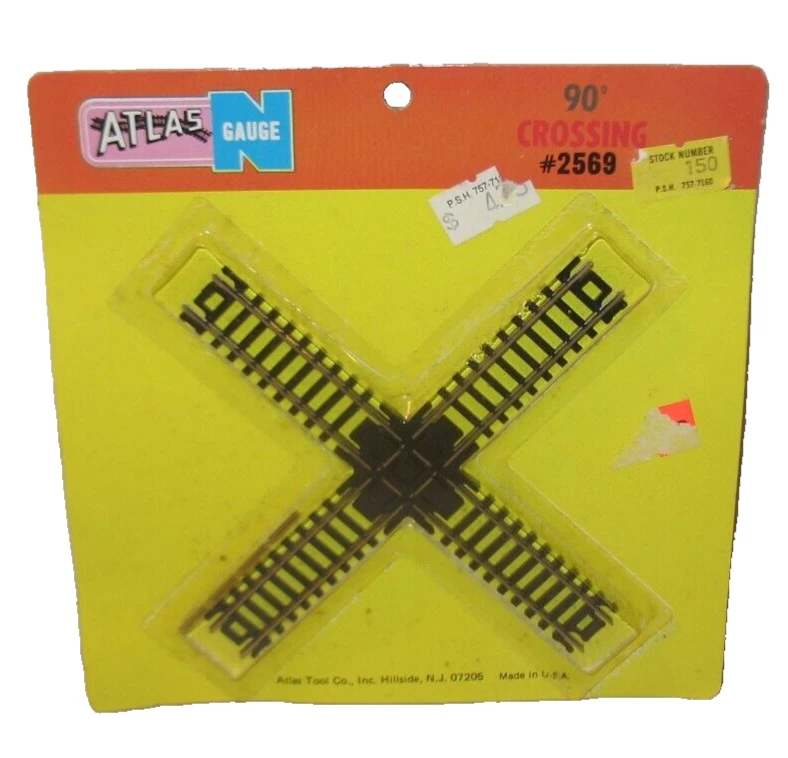 The Atlas N gauge Code 80 Nickel Silver Track 90 degree crossing 2569 is a model railroad track piece designed for N scale layouts. This crossing track is part of the Atlas brand, known for its quality in the model railroads and trains category. The track is in black and silver colors and is made of plastic and steel materials, suitable for use in a Two-Rail System with DC power. The 90-degree crossing design allows for the creation of more intricate and realistic track layouts in N scale model railroads. Please look at pictures as they are part of description....Any questions please ask.