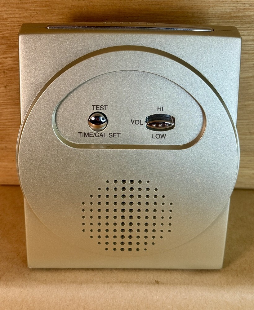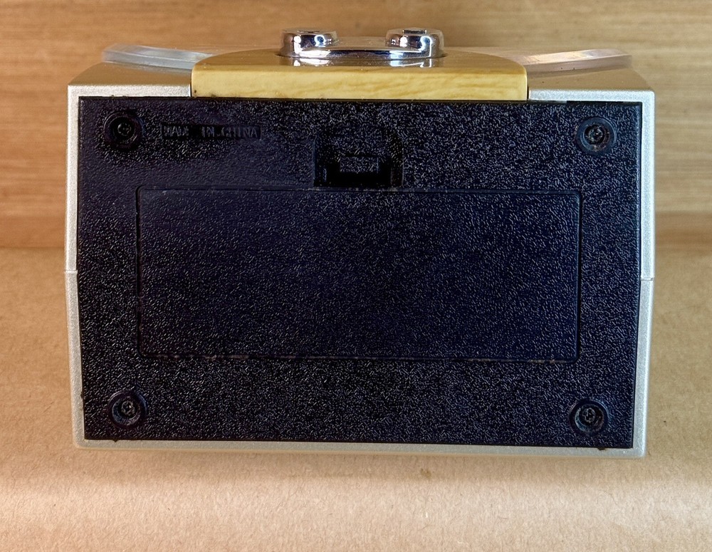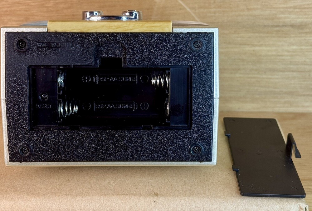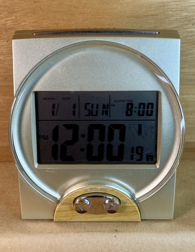 This Talking Atomic Alarm Clock is a modern, battery-operated timepiece that features a sleek silver design with a faux wood finish. It tells time in a unique way, with a talking voice that announces the date and time. The clock is powered by a quartz movement and operates digitally, with a 24-hour display and alarm functions. Its compact dimensions make it suitable for use in any room, adding a touch of style and functionality to your home decor. Made of durable plastic, this talking alarm clock is both practical and visually appealing. This item is pre owned, TESTED and WORKING. When you put two AA batteries in (batteries not included) the screen comes on and displays information and a voice talks to you and provides you with information.