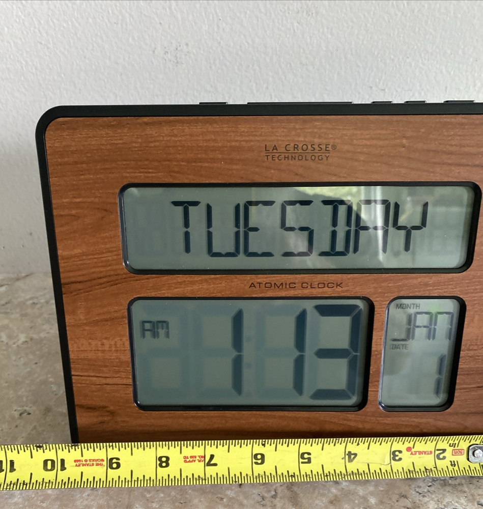 The Atomic Large Full Digital Calendar Clock by La Crosse Technology is a contemporary desk clock that combines both analog and digital displays. It features a silent quartz movement, battery operation, and a sleek wooden design with a matte finish. The clock includes features such as atomic/radio control, day/date display, and a 12-hour calendar. Its large display and easy-to-read Arabic numerals make it ideal for teens, adults, and kids to use in any room. This original piece of home décor is a stylish and functional addition to any space.