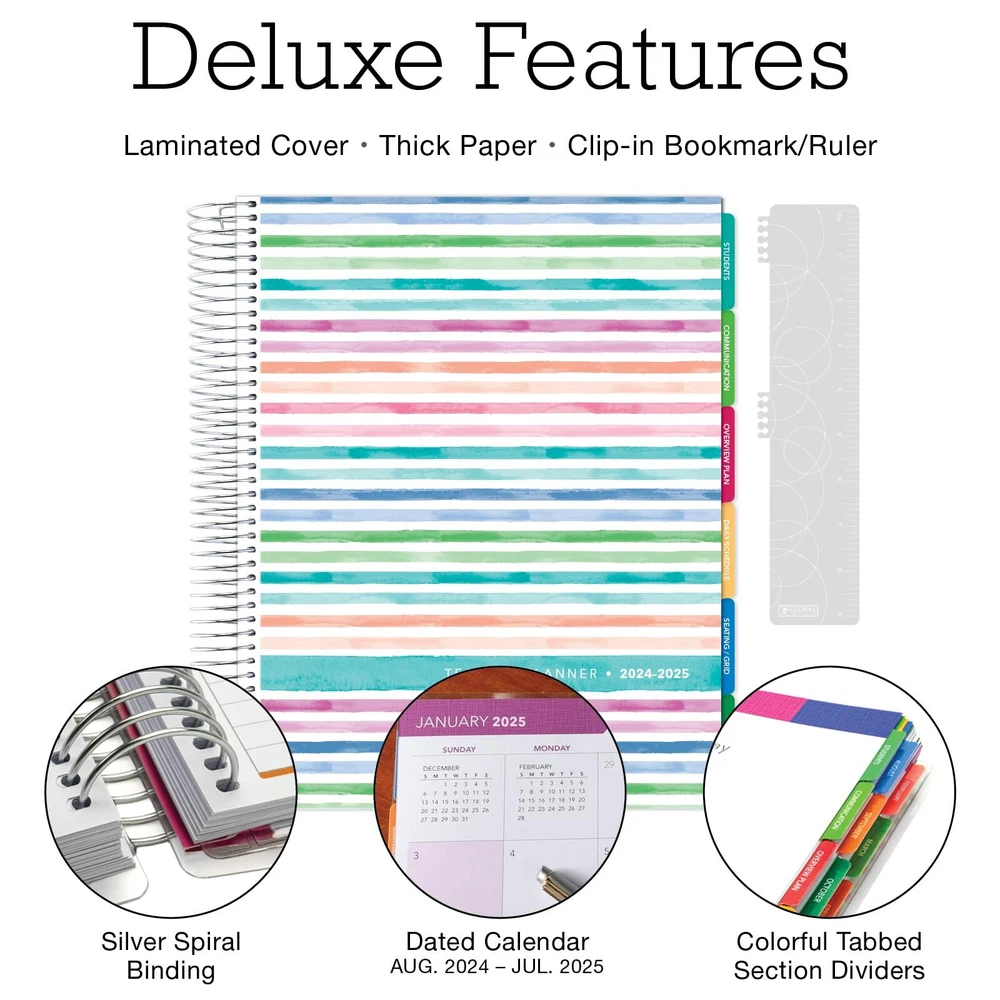 Aug 2024-Jul 2025 Deluxe Teacher Planner Notebook 8.5x11 Daily Weekly Monthly Organizers with 7 Periods, Pocket Folder, Dated Calendar, Page Tabs, Bookmark and Planning Stickers (Seaside Watercolors) DELUXE TEACHER PLANNER: 8.5"x11", Full color, 9 Tabbed sections, 5 Sticker Sheets, Bookmark and Pocket Folder DATED: August 2024 - August 2025. Contains planning pages for 52 weeks. 5 days across the top and 7 periods down the side. There are 14 log pages for grades/attendance (or 7 double-page spreads). Each page has 35 rows and 20 columns. FASHIONABLE DESIGN: High quality, durable and built to last the entire school year. INCLUDES: Monthly Calendar Planning Pages, Weekly Calendar Planning Pages, Student List, Communications Log, Yearly Overview Plan, Daily Schedule Charts, Seating Charts and Grids, Log for Grades and/or Attendance, and Notes Pages. GUARANTEED QUALITY: High quality heavy-duty and BUILT TO LAST! Made by Excello Global Products. We are a family owned USA company and we have been making quality products for over 50 years DELUXE TEACHER PLANNER: 8.5"x11", Full color, 9 Tabbed sections, 5 Sticker Sheets, Bookmark and Pocket Folder DATED: August 2024 - August 2025. Contains planning pages for 52 weeks. 5 days across the top and 7 periods down the side. There are 14 log pages for grades/attendance (or 7 double-page spreads). Each page has 35 rows and 20 columns. FASHIONABLE DESIGN: High quality, durable and built to last the entire school year. INCLUDES: Monthly Calendar Planning Pages, Weekly Calendar Planning Pages, Student List, Communications Log, Yearly Overview Plan, Daily Schedule Charts, Seating Charts and Grids, Log for Grades and/or Attendance, and Notes Pages. GUARANTEED QUALITY: High quality heavy-duty and BUILT TO LAST! Made by Excello Global Products. We are a family owned USA company and we have been making quality products for over 50 years Shipping from the USA All of our products are shipped from the USA, ensuring quick delivery to your destination. Payment We offer the following payment methods: PayPal, credit card, bank transfer, and eBay's secure payment system. Free Shipping & Free Returns Shipping within the USA is FREE. Additionally, any return is absolutely free for you. Risk-Free Purchase You have the option to return an item within 30 days without any justification. We cover the return shipping costs! Fast Shipping We ship immediately upon receipt of payment. Generally, the package is delivered within 2-3 days in the USA. If it takes longer, we will contact you. Quality and Costs Made in Europe, USA, China No customs fees or additional charges Total satisfaction guarantee Invoice with declared VAT available upon request in .pdf format Feedback Your feedback is very important to us. After you pay for your purchase, you will automatically receive positive feedback from us.