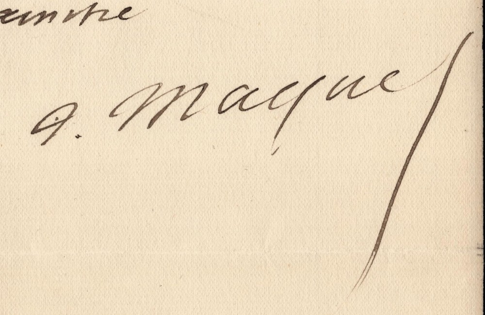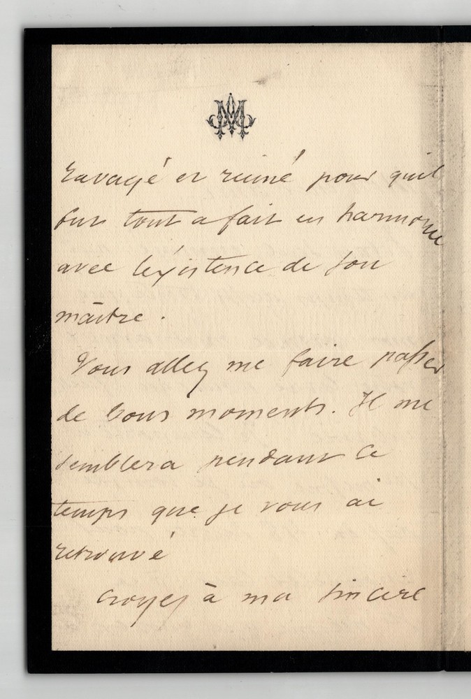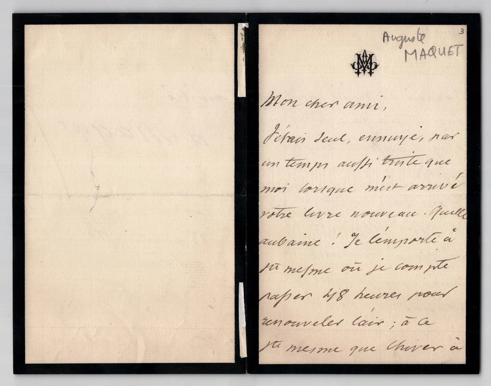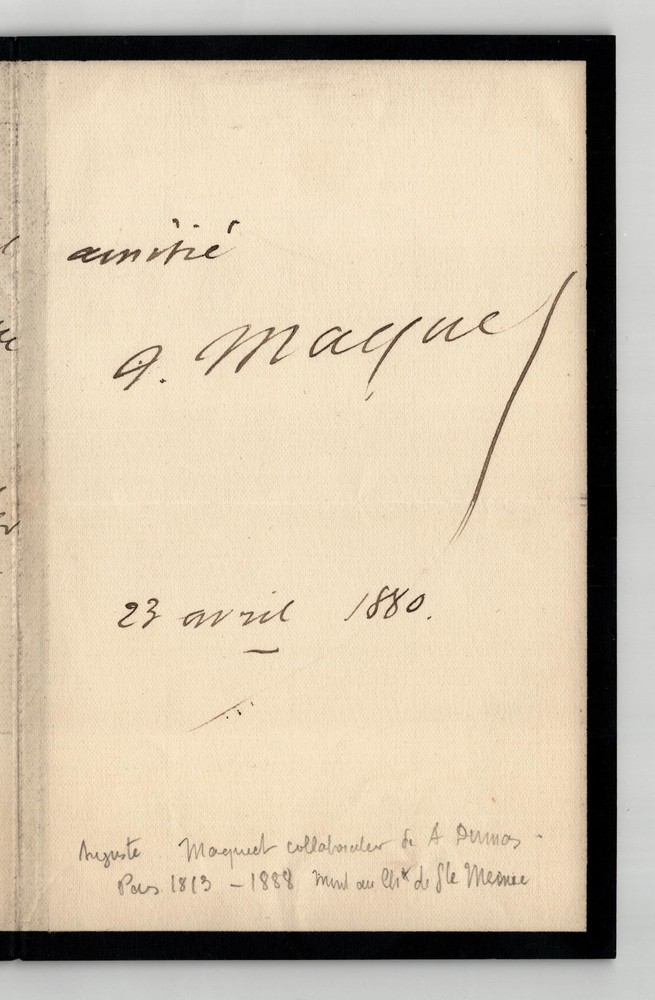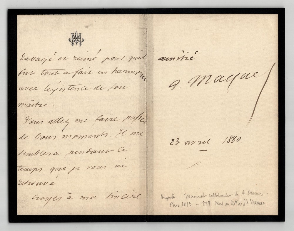 Free eBay listing template designed by dewiso.com Auguste Maquet - Signed Autograph Letter "A Time As Sad As Me" 1880 The description of this item has been automatically translated. If you have any questions, please feel free to contact us. Auguste Maquet. Autograph letter signed, 1880 French novelist and playwright, Collaborator of Alexandre Dumas Autograph letter signed by Auguste Maquet, dated April 23, 1880. Written in brown ink on a double sheet of watermarked laid paper with 6 mm mourning border. “My dear friend, I was alone, bored, in weather as sad as I was when your new book arrived. What a bargain! I'm taking it to Ste Mesme where I plan to spend 48 hours to freshen up the air; to this Holy Same who was ravaged and ruined by winter so that he was completely in harmony with the existence of his master. You're going to make me have a good time. It will seem to me during this time that I have found you again Believe in my sincere friendship. April 23, 1880 » Dimensions: 21 x 27 cm State : Traces of tabs on the back, otherwise good condition. See photos for details. Number of pages: 2 pages Auguste Maquet Auguste Maquet, born in Paris on September 13, 1813 and died in Sainte-Mesme on January 8, 1888, is a French novelist and playwright, best known for his collaboration with Alexandre Dumas. Wikipedia Contact us Autograph letters, old papers, old books, photographs, engravings, stamps... We appraise and/or buy your letters, collections of letters and old books throughout France. A question? Any clarification? Do not hesitate to contact me Payment Payments by eBay, PayPal, transfer or check are accepted. Sending Careful delivery in rigid, waterproof packaging within three days. Allow for the usual postal delays in addition. Back Satisfaction guaranteed or your money back. If you are not completely satisfied, return at the seller's expense for Europe. At the buyer's expense for the rest of the world. Autograph letter signed by Auguste Maquet, dated April 23, 1880. Written in brown ink on a double sheet of watermarked laid paper with 6 mm mourning border.