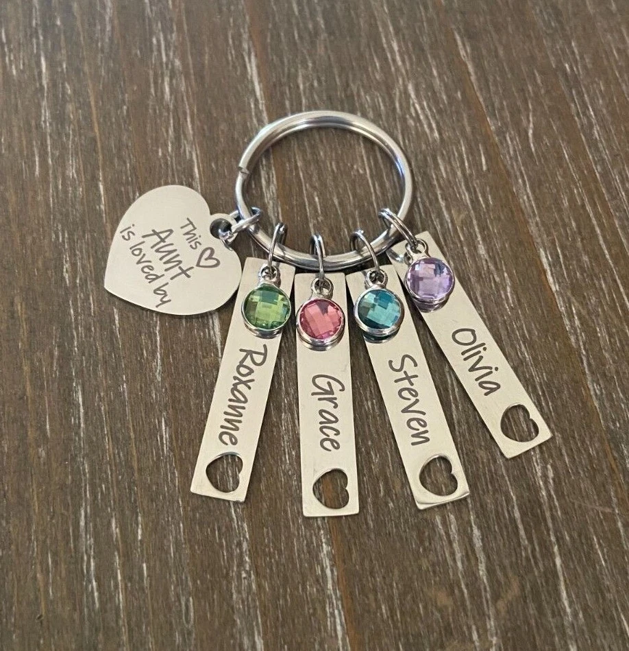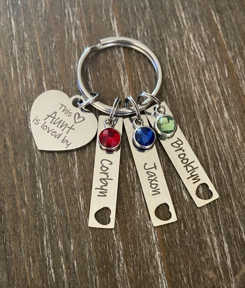 Listing is for Completed custom Name Necklace Keychain includes Heart charm with your choice of engraving ( up to 24 characters ) and custom cutout heart Bar Name charms with your choice of Names ( up to 10 characters, capital letters count as 2 spaces ) and birthstones. Keyring is stainless Steel Custom bar charms are 1 1/4" Stainless Steel Heart charm is 3/4 Stainless Steel Keychain will come in Gift box ready to Gift :) *IMPORTANT* Please be sure to include Names and Birth months in notes to seller during check out or in messages :) If requests not left for heart this will come as This Aunt is loved by :) Stainless Steel doesn't need polished, will not tarnish and doesn't stain the surrounding skin. It's properties are hypoallergenic for those with metal allergies. Please be sure to check messages after purchase in case of any questions I may have so your order is not slowed :)