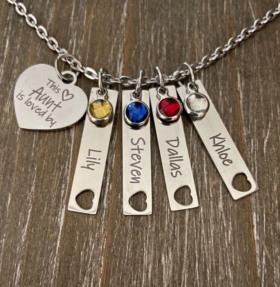 Listing is for Completed custom Name Necklace Necklace includes Heart charm with your choice of engraving ( up to 24 characters ) and custom cutout heart Bar Name charms with your choice of Names ( up to 10 characters, capital letters count as 2 spaces ) and birthstones. Chain is 18" Stainless Steel. I do also have 24" available upon request. Custom bar charms are 1 1/4" Stainless Steel Heart charm is 3/4 Stainless Steel Necklace will come in Gift box ready to Gift :) *IMPORTANT* Please be sure to include Names and Birth months in notes to seller during check out or in messages :) If requests not left for heart this will come as This Aunt is loved by :) Stainless Steel doesn't need polished, will not tarnish and doesn't stain the surrounding skin. It's properties are hypoallergenic for those with metal allergies. Please be sure to check messages after purchase in case of any questions I may have so your order is not slowed :)