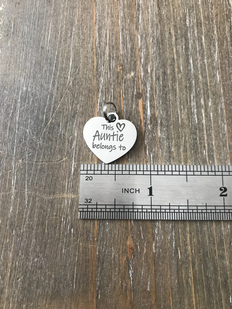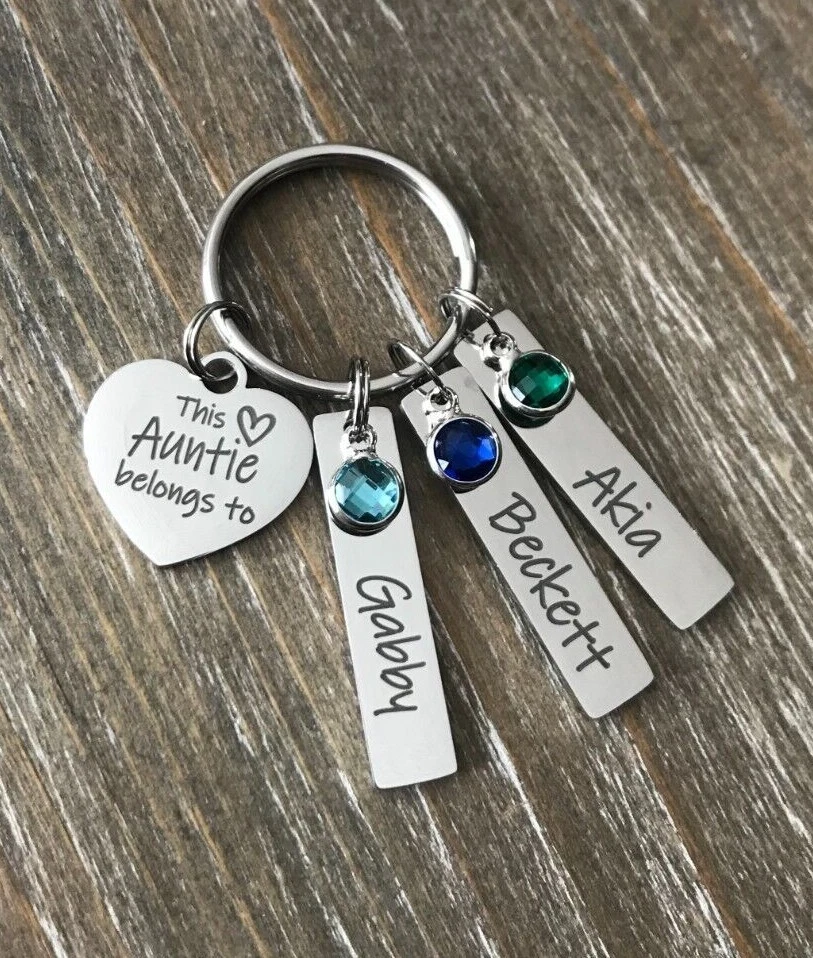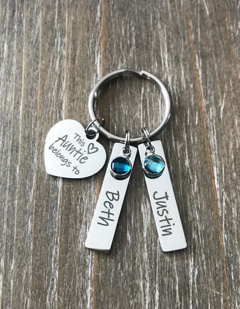 Listing is for Completed custom Name Keychain, Keychain includes heart charm with your choice of wording ( Up to 24 Characters ) and custom Bar Name charms with your choice of Names engraved ( up to 11 characters, capital letters count as 2 characters each ) and birthstones. Custom bar charms are 1 1/4" Stainless Steel heart charm is 3/4 Stainless Steel Key ring is 1" Stainless Steel Keychain will come in Gift box ready to Gift :) *IMPORTANT* Please be sure to include Names and Birth months in notes to seller during check out or in messages, if wording not requested this will come with This Auntie belongs to :) Stainless Steel doesn't need polished, will not tarnish and doesn't stain the surrounding skin. It's properties are hypoallergenic for those with metal allergies. Please be sure to check messages after purchase in case of any questions I may have so your order is not slowed :)