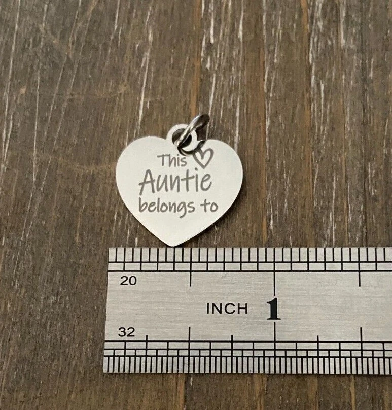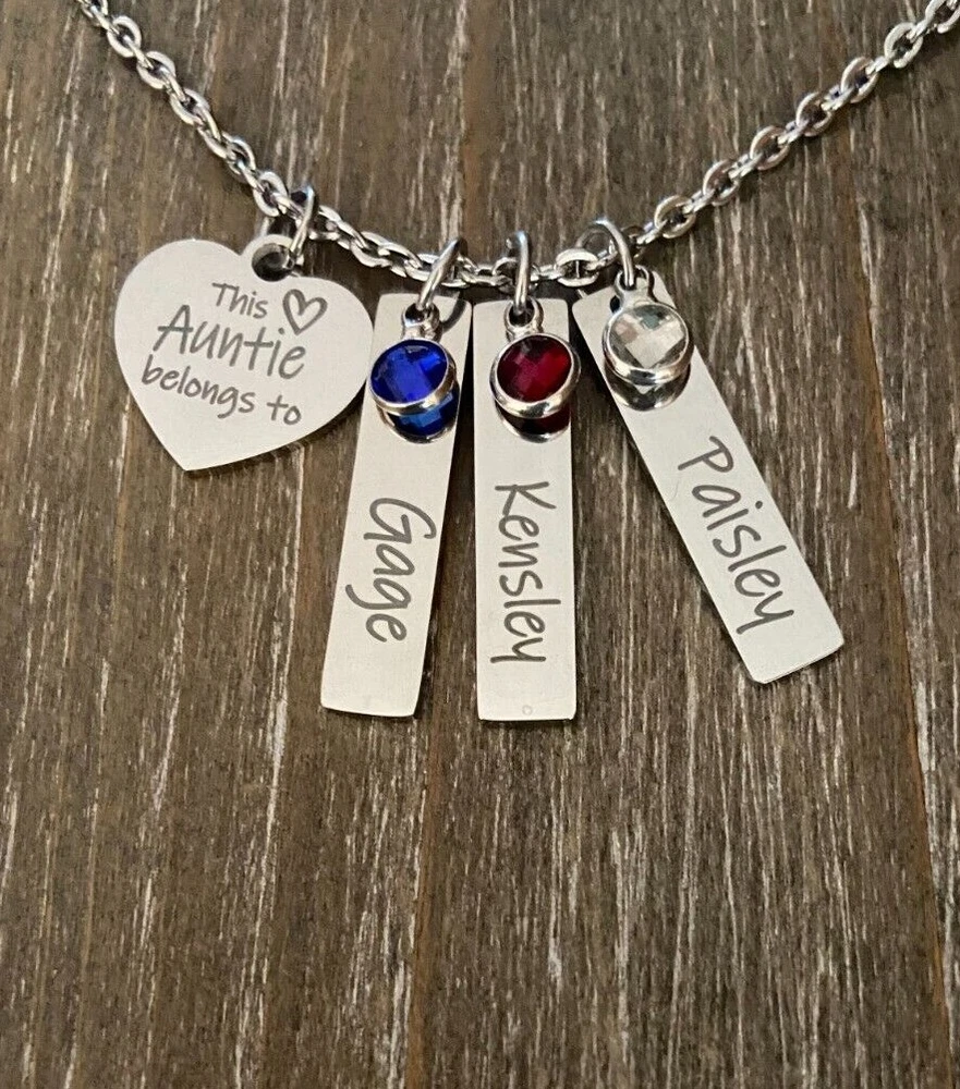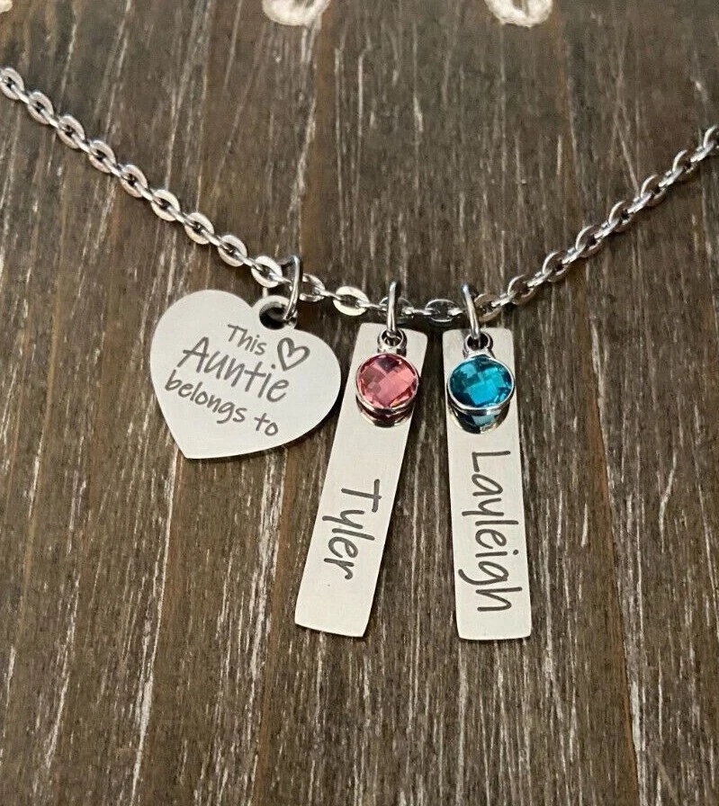 Necklace comes heart charm with your choice of wording ( up to 24 characters ) and your choice of customized bars with Names ( up to 11 characters, Capital letters are 2 Characters each ) and choice of Crystal birthstones. Pendants come on a 18 inch chain, I do have 24 by request. Please leave message with the names you would like on each bar chosen and birth month choices in notes to seller or messages so I can link to your order :) heart Charm is 3/4" Stainless Steel Custom name bar is approx. 1 1/4 inch chain is also Stainless Steel *IMPORTANT Please leave message with the names you would like on each bar chosen and birth month choices :) Please also leave personal requests for heart or this will come as pictured This Auntie belongs to Necklace will come complete with Gift Box :) With it's bright silver finish and it's resistance to tarnish, stainless steel has become increasingly popular for jewelry, it's hardness makes it surface less readily to scratch. Stainless steel retains it's shape and beauty under stress of regular wear or an active lifestyle, made for those who prefer a low-maintenance but beautiful jewelry. Stainless steel will not tarnish or stain the surrounding skin plus it's property make it hypoallergenic to those with metal allergies Font is only available in the English Alphabet as shown.