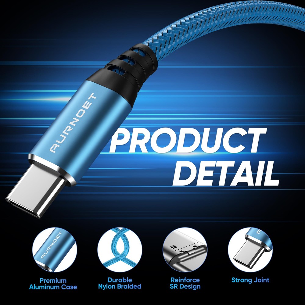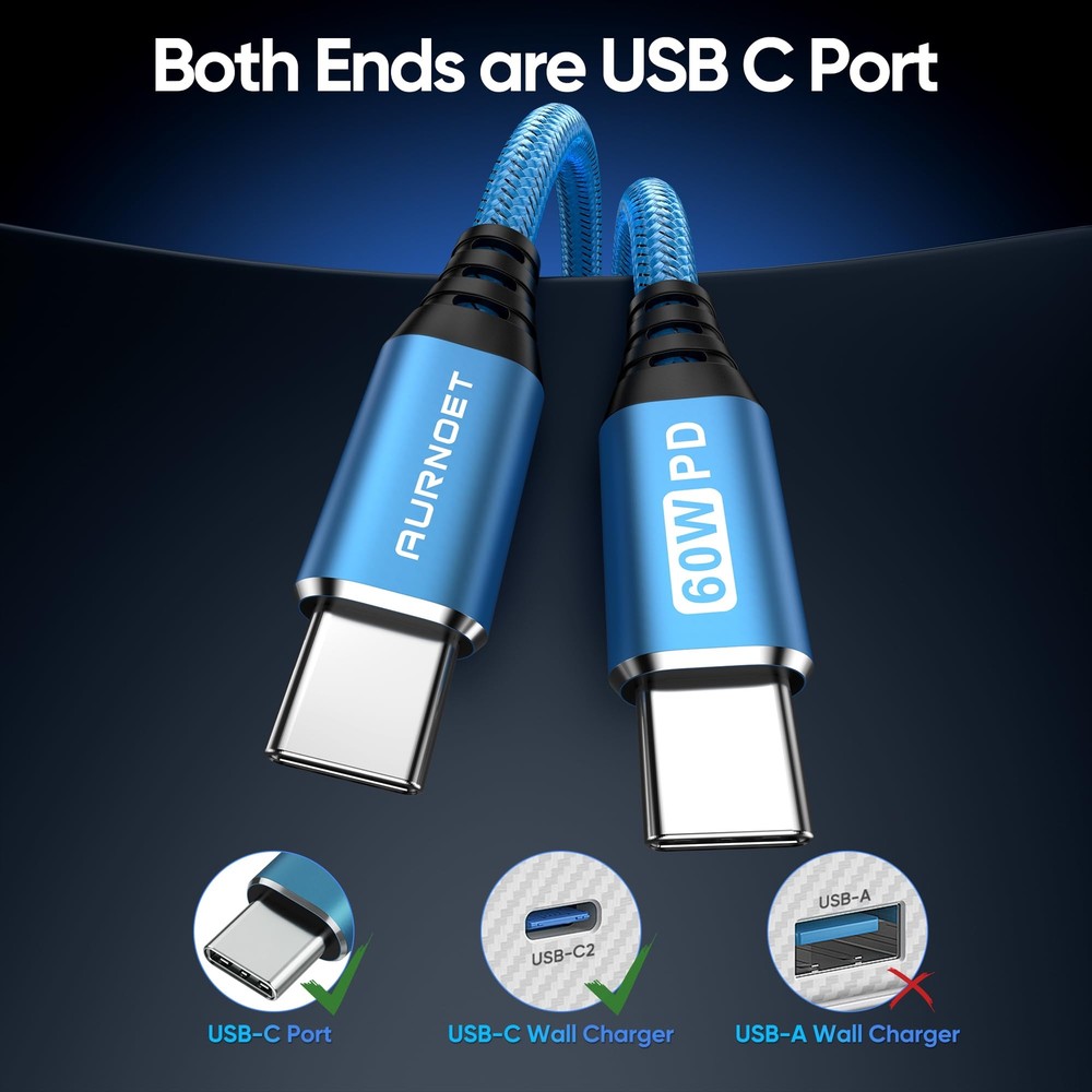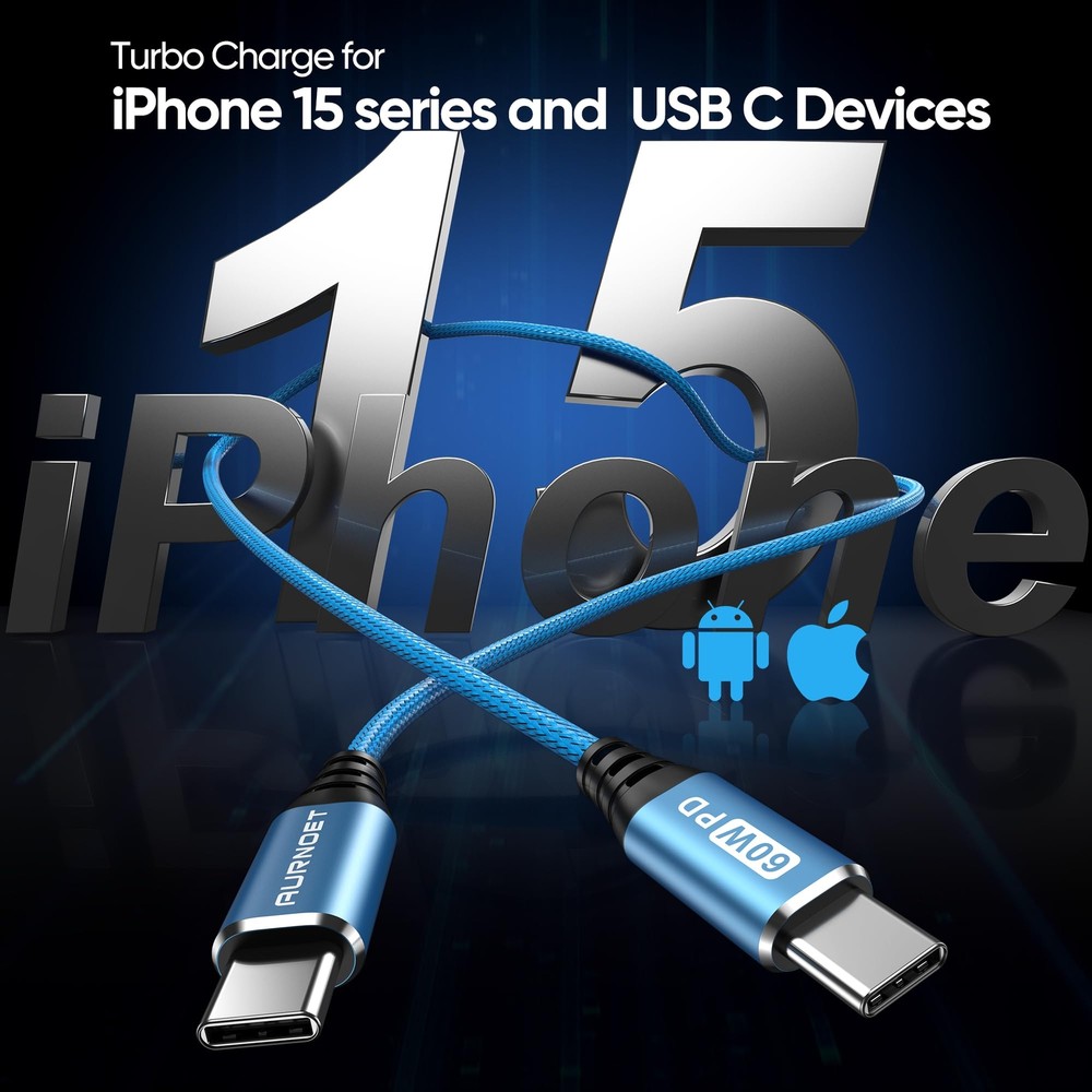 Aurnoet USB C to USB C Cable, 6FT 5-Pack Type C to Type C Charger Cable Fast Charging Cord 60W for iPhone 15/15 Pro/15 Plus/15 Pro Max, Samsung Galaxy S23 S22 S21 Ultra Aurnoet USB C to USB C Cable, 6FT 5-Pack Type C to Type C Charger Cable Fast Charging Cord 60W for MacBook Pro, iPhone 15/15 Pro/15 Plus/15 Pro Max, Samsung Galaxy S23 S22 S21 Ultra. Equipped with a USB-C to C type port support PD3.0/QC3.0/QC4.0 fast charging up to 60W Max (20V/3A), and data transfer speeds up to 480Mbps. 【High Speed Charging and Sync】Equipped with a USB-C to C type port support PD3.0/QC3.0/QC4.0 fast charging up to 60W Max (20V/3A), and data transfer speeds up to 480Mbps, compatible with iPhone 15 pro, Samsung,iPad Air Mini Pro, Macbook and More. 【Perfect Cable Length】5-Pack 6FT long cords can offer you more convenience on the car, sofa, library, office, and share with others. 【Durability Materials】Nylon braided USB cable with a strain relief design, reinforcing durability and tangle-free. Premium Aluminum housing ensures won't easily break. 【Wide Compatibility】The type c charger cable is Widely compatible with iPhone 15/15 Plus/15 Pro/15 Pro Max, MacBook Air/Pro, iPad Mini/Pro/Air, Samsung Galaxy S23 Ultra/S23+/S23/S22 Ultra/S22+/S22/S21 Ultra/S21+/S21/S20/ S20+/S20 Ultra/Note 20,Steam Deck and more devices with USB-C port. 【What you get】Package includes 5-pack 6ft USB-C to USB-C cable, we have 24/7 professional customer service. If you have any questions, we will solve them within 24 hours. Shipping from the USA All of our products are shipped from the USA, ensuring quick delivery to your destination. Payment We offer the following payment methods: PayPal, credit card, bank transfer, and eBay's secure payment system. Free Shipping & Free Returns Shipping within the USA is FREE. Additionally, any return is absolutely free for you. Risk-Free Purchase You have the option to return an item within 30 days without any justification. We cover the return shipping costs! Fast Shipping We ship immediately upon receipt of payment. Generally, the package is delivered within 2-3 days in the USA. If it takes longer, we will contact you. Quality and Costs Made in Europe, USA, China No customs fees or additional charges Total satisfaction guarantee Invoice with declared VAT available upon request in .pdf format Feedback Your feedback is very important to us. After you pay for your purchase, you will automatically receive positive feedback from us.