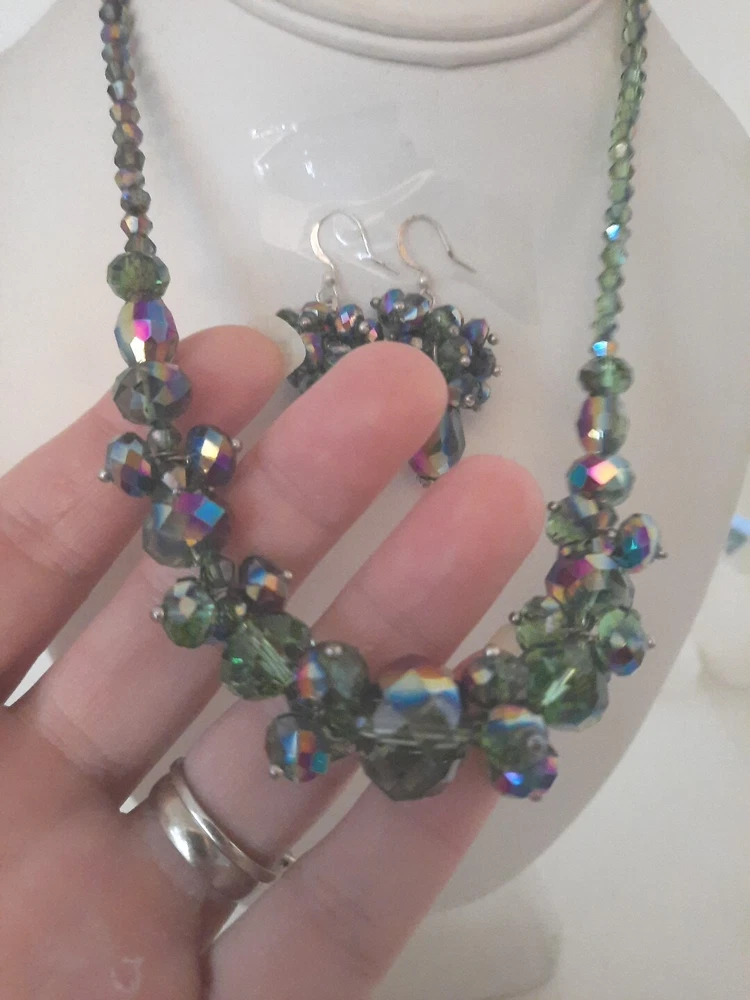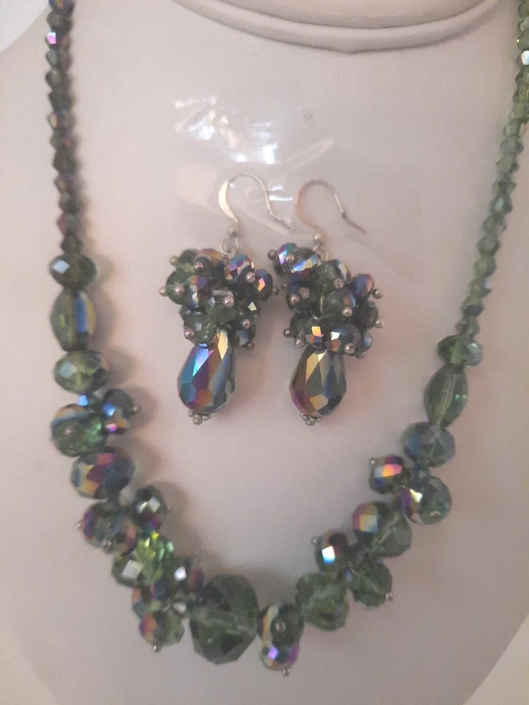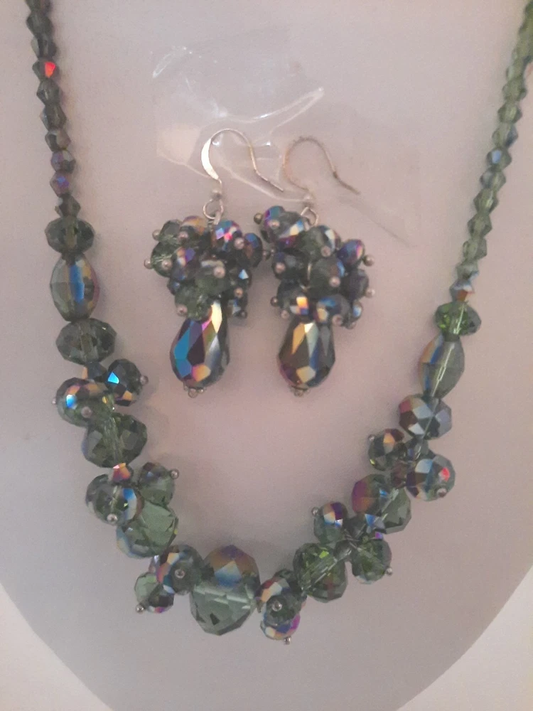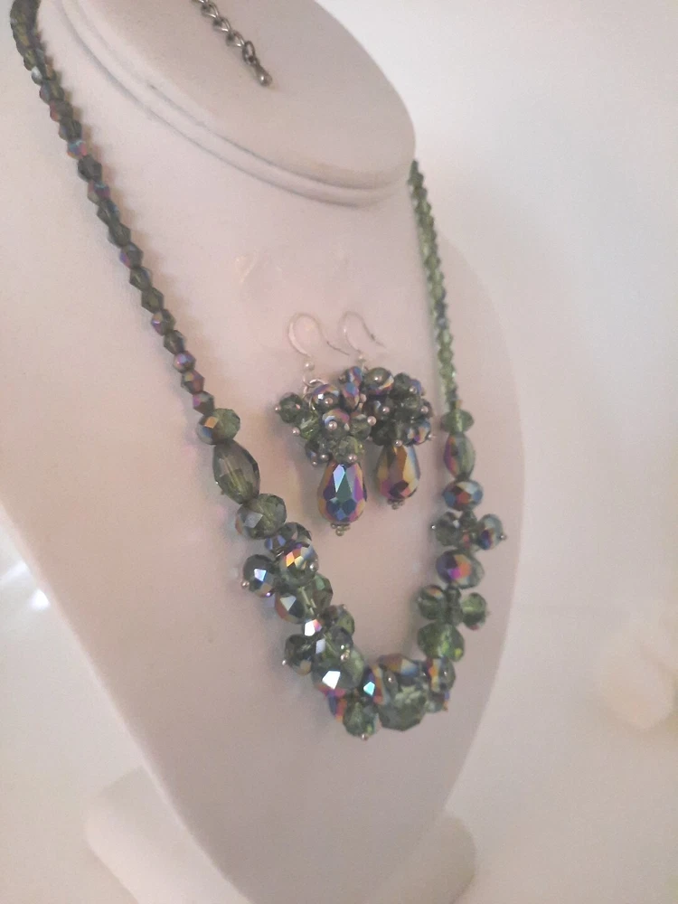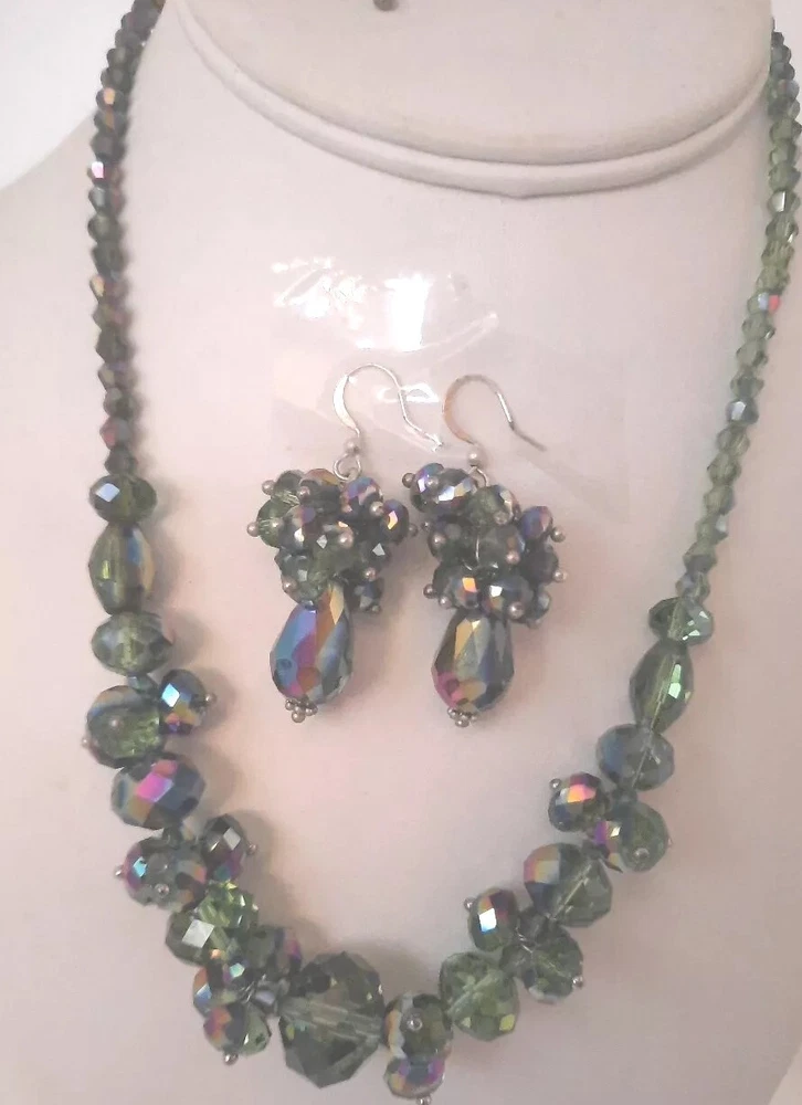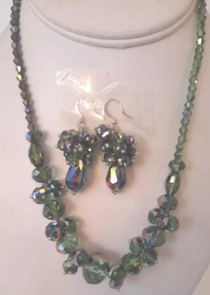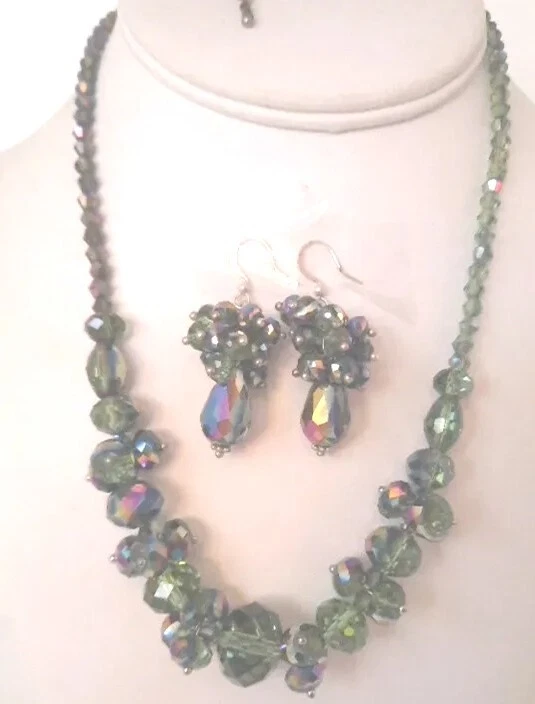 This vintage pink watermelon aurora borealis faceted crystal beaded necklace and earring set is a must-have for any fashion-forward woman. The Lobster closure ensures that the necklace stays securely around your neck, while the 16-inch necklace length is perfect for a comfortable fit. The Watermelon Borealis color of both the main stone and the metal of the necklace and earrings is absolutely stunning, making this set a true statement piece. The crystal beads are intricately crafted and the set is made of 925 silver, giving it a timeless and elegant feel. Whether you're dressing up for a night out or adding some glamour to your everyday look, this necklace and earring set is the perfect accessory.