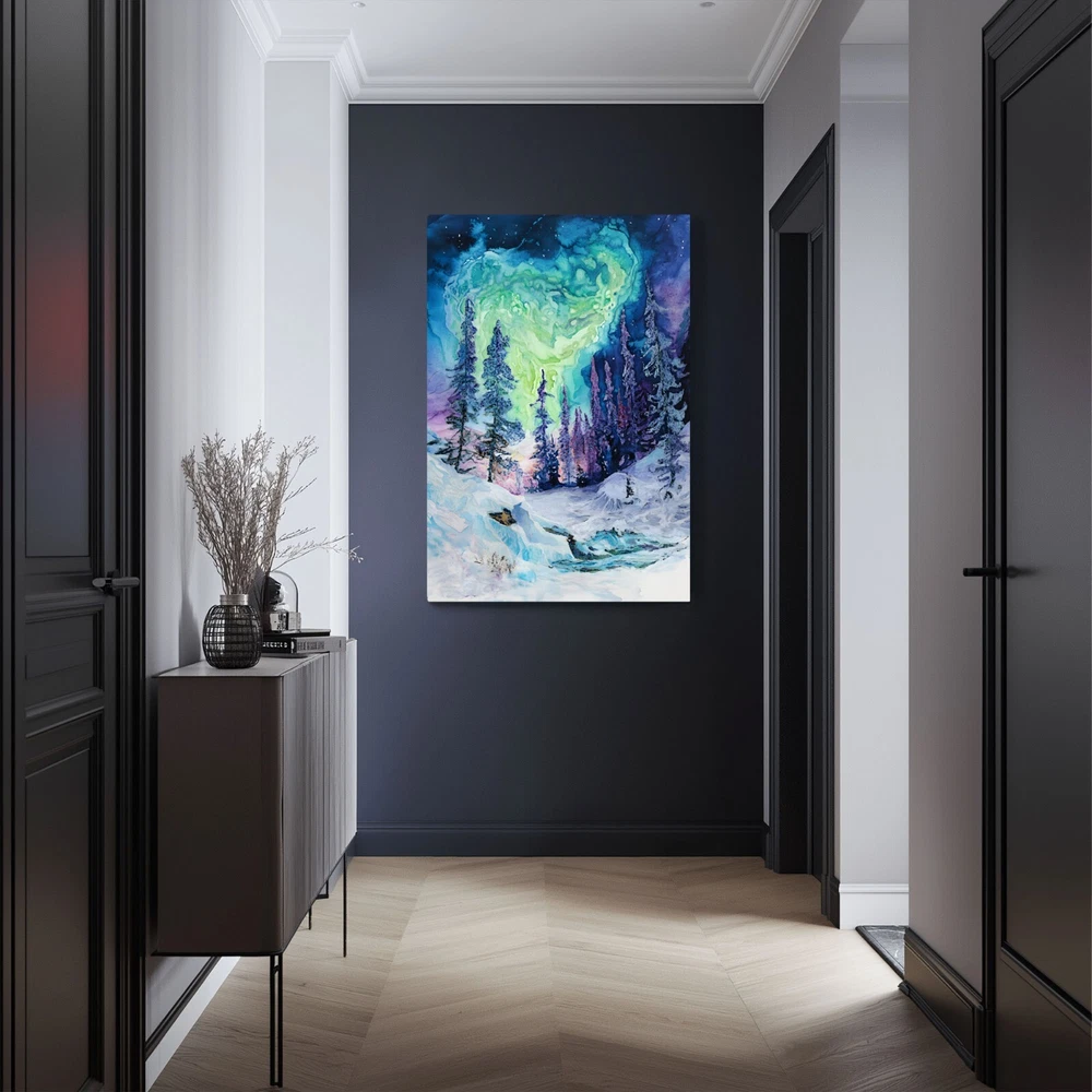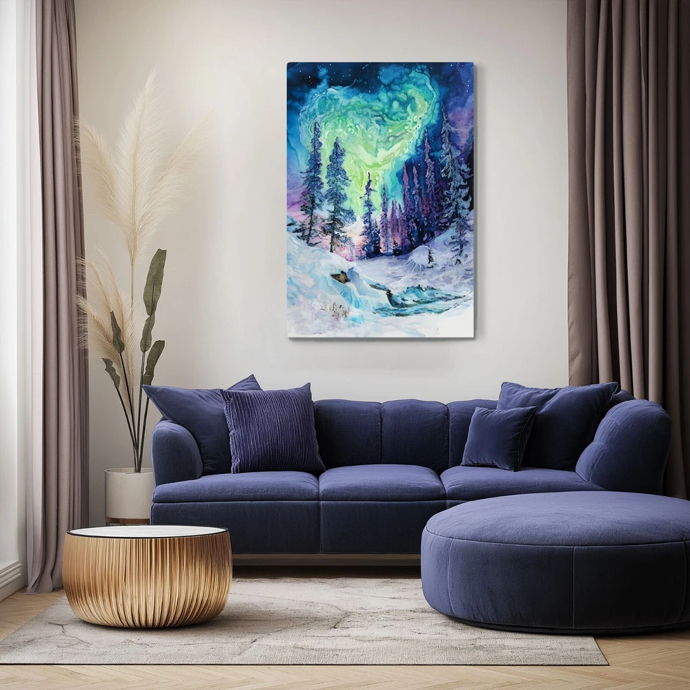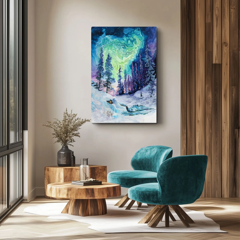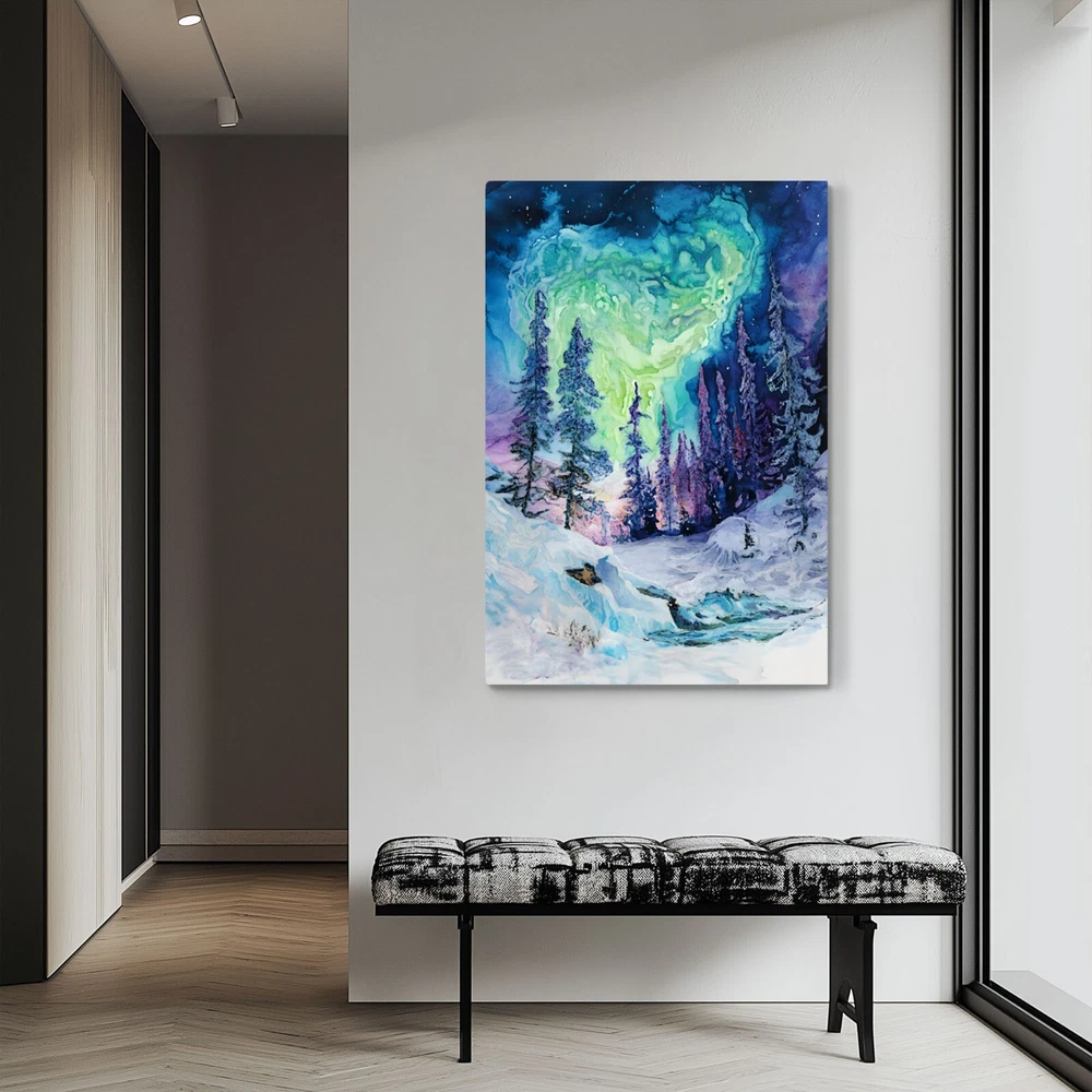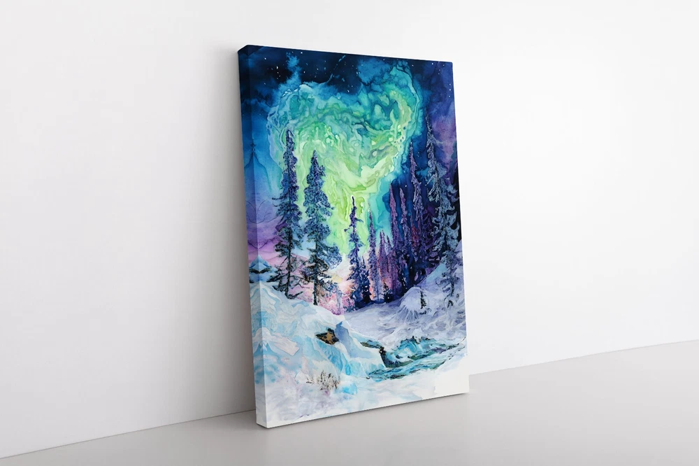 An abstract watercolor painting of a winter forest with the aurora borealis (northern lights) above on a framed and ready-to-hang canvas (reprint - not the original). This print puts a psychedelic spin on the magic of the northern wilderness. The canvas is wrapped around the outside of a wooden frame allowing the artwork to continue on the outside edges of the print. Our gallery quality canvas prints display vibrant artwork that is built to last. Printed with HP Latex Inks that are fade resistant. Inks are water based and solvent free so rest assured you are not bringing harsh chemicals in your home. Assembled with a thick wood frame and glued wood core stretcher bars. All canvas prints are wrapped and shipped in fitted packaging for maximum protection en-route to your home. * Framed - The canvas image wraps around the 3/4" thick wood frame (2cm) * Ready To Hang - Mounting hardware comes attached. * Leveling Bumpers Included - For wall protection. * Semi-Gloss Print - Increased vibrancy of artwork. * Beveled Wood Stretch Bars - Make frame less noticeable on front of canvas. * Industrial Strength Staples - Ensure a tight fit that won't stretch loose over time. PRODUCTION TIME: (time we need to make your canvas after you order): 2-5 days. WHERE WILL MY CANVAS SHIP FROM? We have production facilities in USA, Canada, UK, EU and Australia. Your canvas will ship from the closest facility. RETURN POLICY? - As these prints are made to order just for you, we cannot accept returns or exchanges. However, we fully back our product quality and if your order arrives damaged or not-as-described in some way we will happily replace the item or refund you. In this case, just send us a photo of the issue and also of the packing slip on the box if possible. CANCELLATION POLICY? - Please cancel your order within 5 hours of purchasing as it will be sent to production via our automated batching system and work will begin on the canvas immediately. Once the work begins, we have already dedicated the materials and time to your order. You can be confident that the image will be crisp and detailed even in the largest size because we take care to follow rigorous quality controls and have years of experience with canvas prints. If we wouldn't hang it in our home - it doesn't get listed!