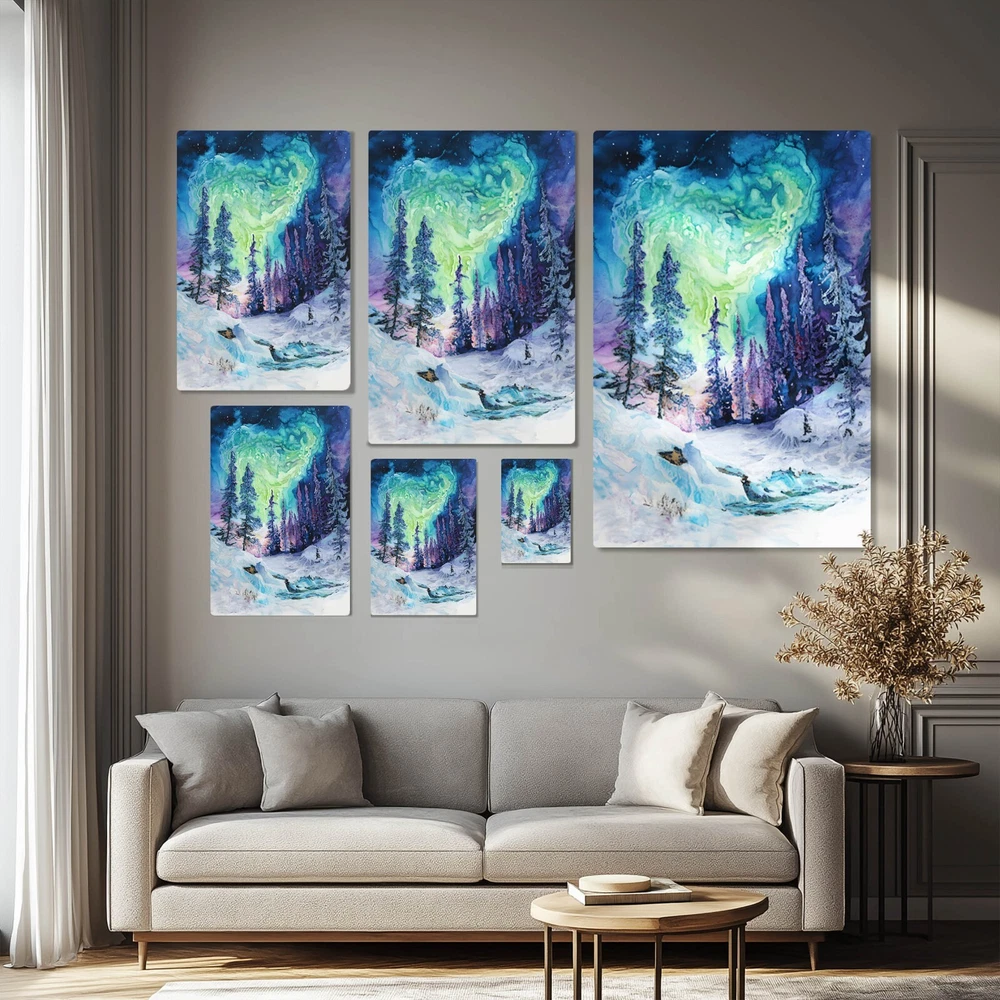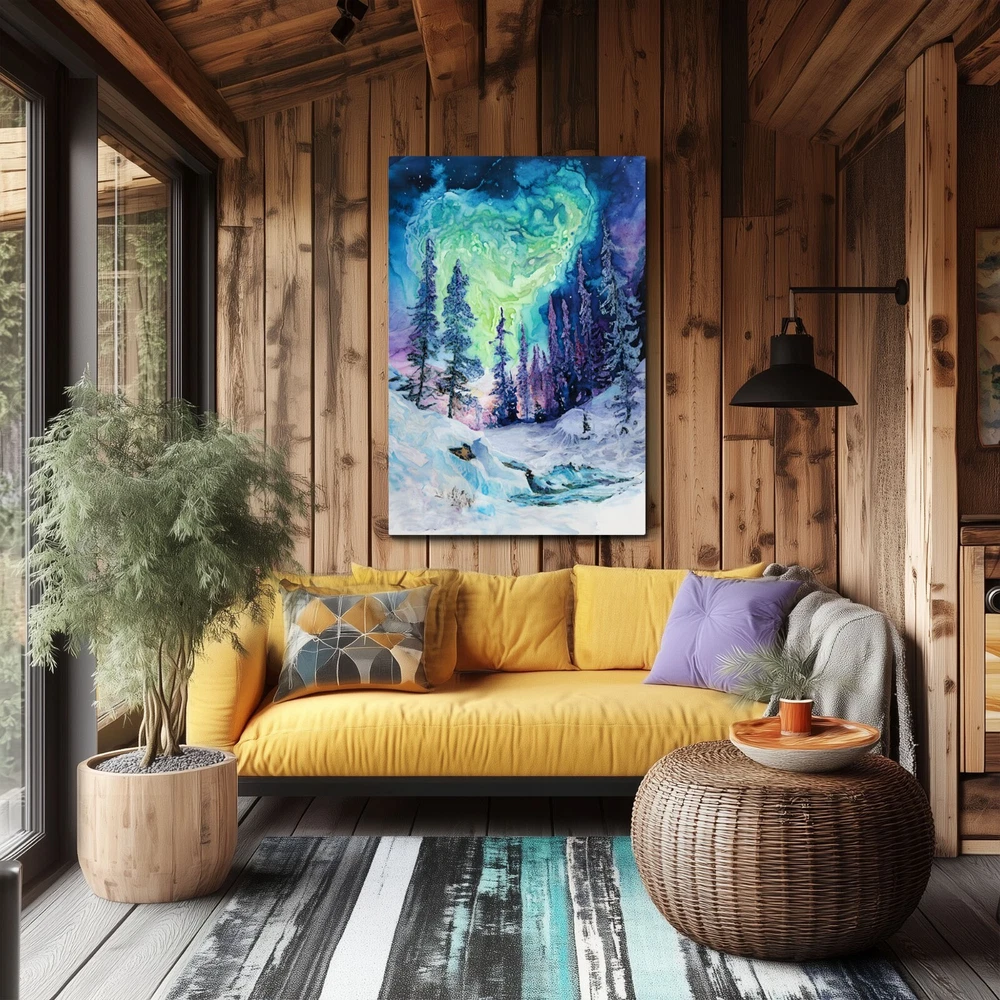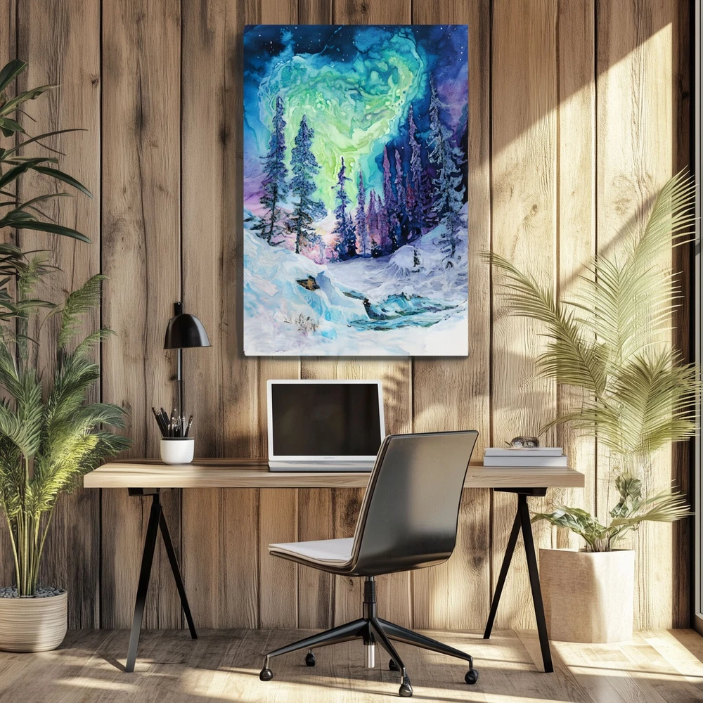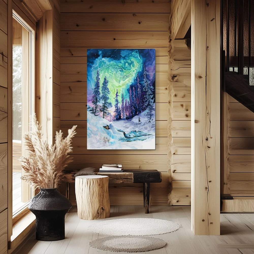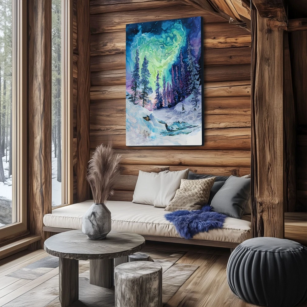 An abstract watercolor painting of a winter forest with the aurora borealis (northern lights) above on a framed and ready-to-hang canvas (reprint - not the original). This print puts a psychedelic spin on the magic of the northern wilderness. The canvas is wrapped around the outside of a wooden frame allowing the artwork to continue on the outside edges of the print. Our gallery quality canvas prints display vibrant artwork that is built to last. Printed with HP Latex Inks that are fade resistant. Inks are water based and solvent free so rest assured you are not bringing harsh chemicals in your home. Assembled with a thick wood frame and glued wood core stretcher bars. All canvas prints are wrapped and shipped in fitted packaging for maximum protection en-route to your home. * Framed - The canvas image wraps around the 3/4" thick wood frame (2cm) * Ready To Hang - Mounting hardware comes attached. * Leveling Bumpers Included - For wall protection. * Semi-Gloss Print - Increased vibrancy of artwork. * Beveled Wood Stretch Bars - Make frame less noticeable on front of canvas. * Industrial Strength Staples - Ensure a tight fit that won't stretch loose over time. PRODUCTION TIME: (time we need to make your canvas after you order): 2-5 days. WHERE WILL MY CANVAS SHIP FROM? We have production facilities in USA, Canada, UK, EU and Australia. Your canvas will ship from the closest facility. RETURN POLICY? - As these prints are made to order just for you, we cannot accept returns or exchanges. However, we fully back our product quality and if your order arrives damaged or not-as-described in some way we will happily replace the item or refund you. In this case, just send us a photo of the issue and also of the packing slip on the box if possible. CANCELLATION POLICY? - Please cancel your order within 5 hours of purchasing as it will be sent to production via our automated batching system and work will begin on the canvas immediately. Once the work begins, we have already dedicated the materials and time to your order. You can be confident that the image will be crisp and detailed even in the largest size because we take care to follow rigorous quality controls and have years of experience with canvas prints. If we wouldn't hang it in our home - it doesn't get listed!