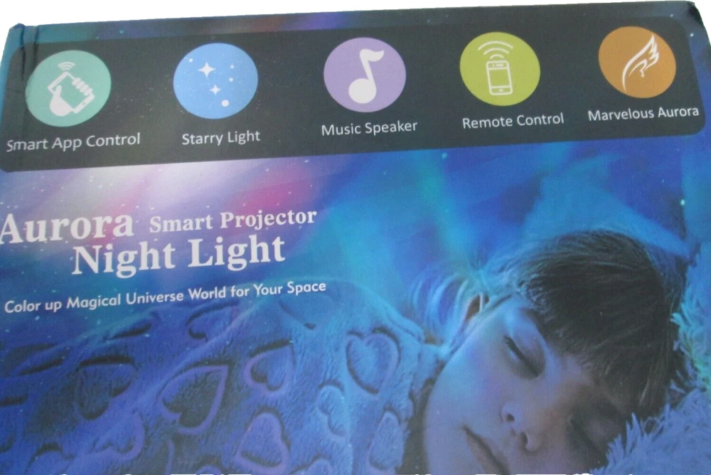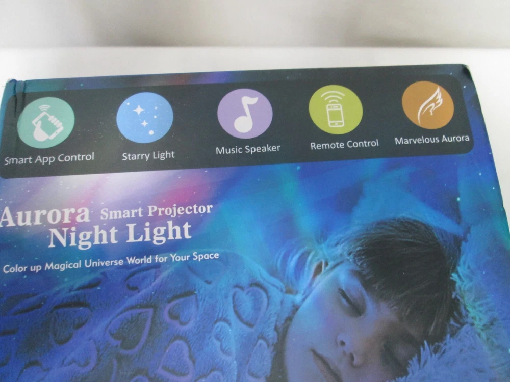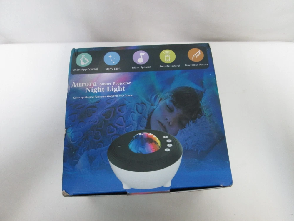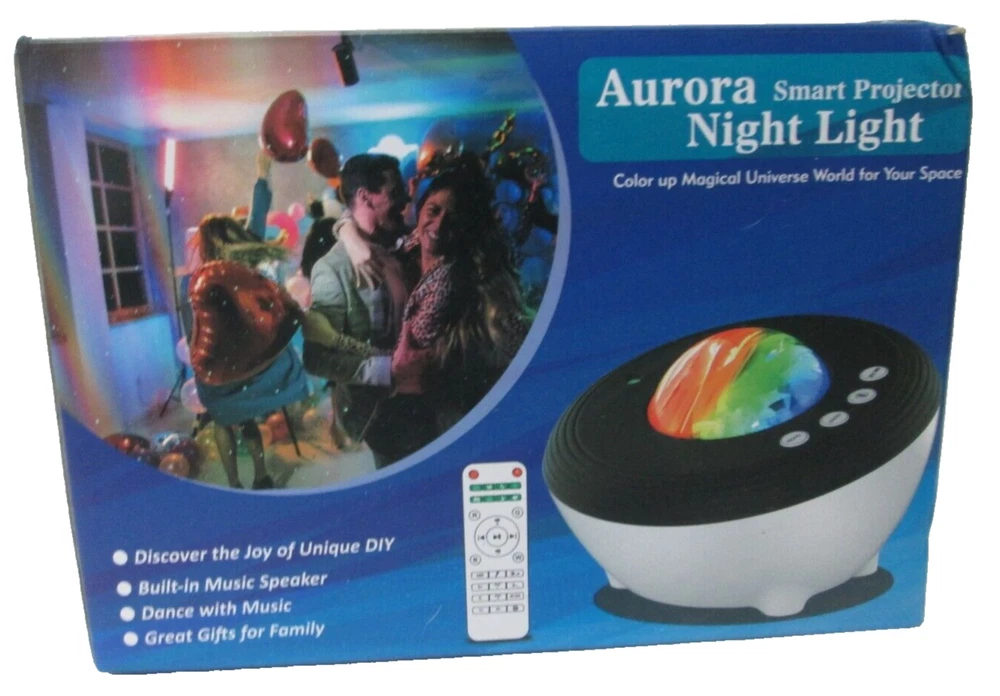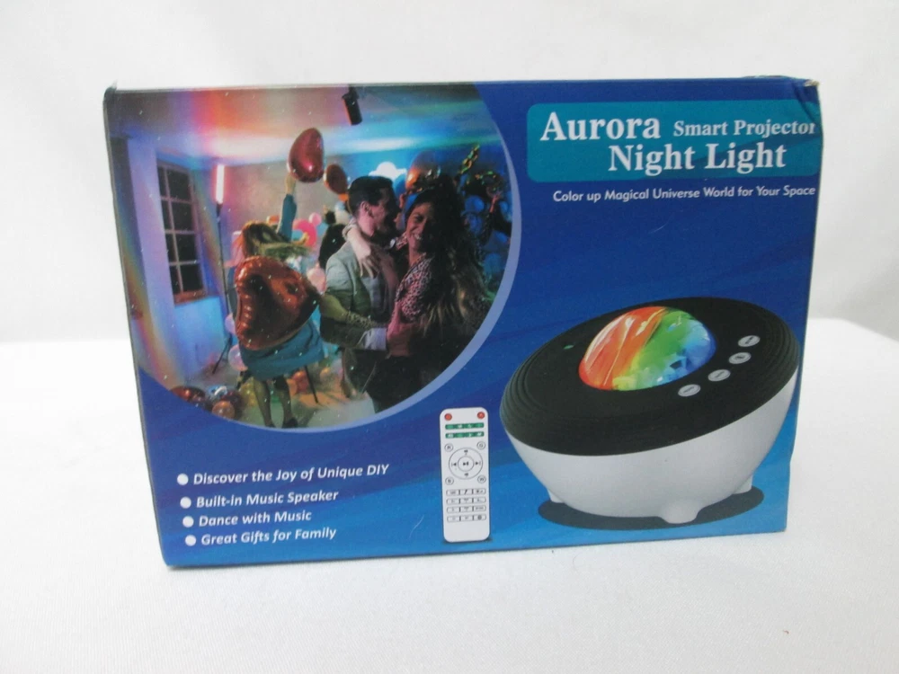 Brand New Aurora Night Light, LED, Remote, 8 Mode. Lighting Shows, Built in Speaker and Timing, Mood Relaxing Soothing Night Power Source Plug-in Electric Switch Style Remote Remote controller, Built-in 1 hr, 2 hrs, 4 hrs auto off timer, also it can stay on all night long. 3 brightness level adjustable (30% 60% 100%), Still or Rotation available. [2 Way Use & Amazing Aurora Light Show]- It is a little night light with dome cover on, a galaxy aurora projector when take off the cover. Project realistic aurora borealis and nebular light on ceiling or wall, create an enjoyable and relaxing bedtime experience for children, soothe and comfort kids to sleep, also perfect for adults to attain a relaxing and calming effect. [8 lighting projection modes & 45 degree titled adjustable]- red, blue, green and 3 colors [Built-in speaker] - volume adjustable, you can plug in an ipod, iphone, MP3 or other device with with the AUX cable in the package. Thank You.