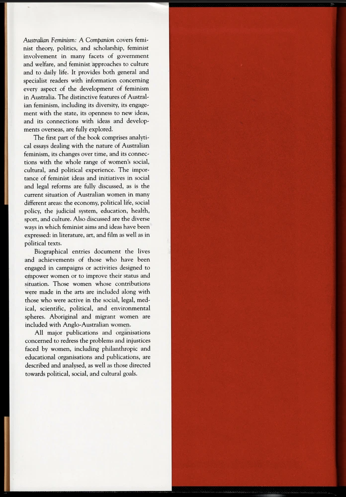 Australian Feminism - A Companion ; Barbara Caine editor - Oxford Hardcover Book Australian Feminism - A Companion ; Barbara Caine editor - Oxford Hardcover Book This copy is in VERY GOOD used condition overall. The dust-jacket has light wear. The boards and binding are in excellent order. There is a small name stamped on the first, free endpaper. The pages DO NOT have any marking of text. Click here to visit PATRICK ANDREAS QUALITY BOOKS Store Home Page . Listing and template services provided by inkFrog