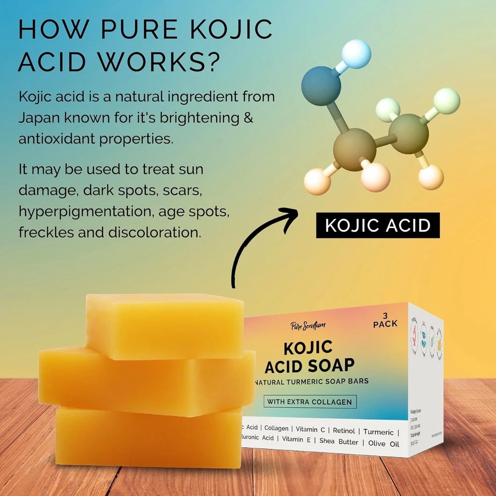 Pure Kojic Acid Skin Brightening Soap with Added Collagen Boost: Our turmeric-infused Kojic Acid soap is carefully crafted with pure, vegan ingredients and enhanced with extra collagen, ensuring the health, radiance, and a vibrant glow of your skin. Vegan, Paraben-Free, SLS-Free: All our ingredients work in harmony to benefit your skin. For a full list of ingredients, including Kojic Acid, turmeric, hyaluronic acid, shea butter, and more, refer to the product description below. Kojic acid, a natural ingredient originating from Japan, is renowned for its powerful brightening effects, aiding in dark spot correction, preventing hyperpigmentation, and promoting a more even skin tone. Experience the transformation with our pure Kojic Acid Turmeric Soap. Usage Instructions: Prior to use, conduct a spot test on your hand. Gently rub the brightening turmeric soap with water and massage it onto wet face and body. Rinse thoroughly. Detailed instructions can be found on the package. Suitable for your face, hands, neck, bikini area, inner thighs, and underarms. Nourish and Revitalize: Elevate your skin inside and out for radiant results. With your purchase of Kojic Acid Soap, receive an exclusive eBook: "Glowing Skin Diet Plan." For any inquiries, please contact our support team. Product Description Natural pure kojic acid soap with added collagen How to use kojic acid soap Usage Instructions: Prior to use, conduct a spot test on your hand. Gently rub the brightening turmeric soap with water and massage it onto wet face and body. Rinse thoroughly. Detailed instructions can be found on the package. Can I use this for body & face? Pure Scentum kojic acid soap is suitable for your face, hands, neck, bikini area, inner thighs, and underarms. Is it vegan? Out turmeric kojic acid soap is Vegan, Paraben-Free, SLS-Free. All our ingredients are pure and work in harmony to benefit your skin. How do I get the ebook? It will be sent to you automatically by email after your purchase. USA handmade bath bombs made from natural quality ingredients How many bath bombs? 4 giant XXL bath bombs How many bath bombs? 6 giant XXL bath bombs How many bath bombs? 6 giant XXL bath bombs Where are they made? Handmade in the USA Where are they made? Handmade in the USA Where are they made? Handmade in the USA