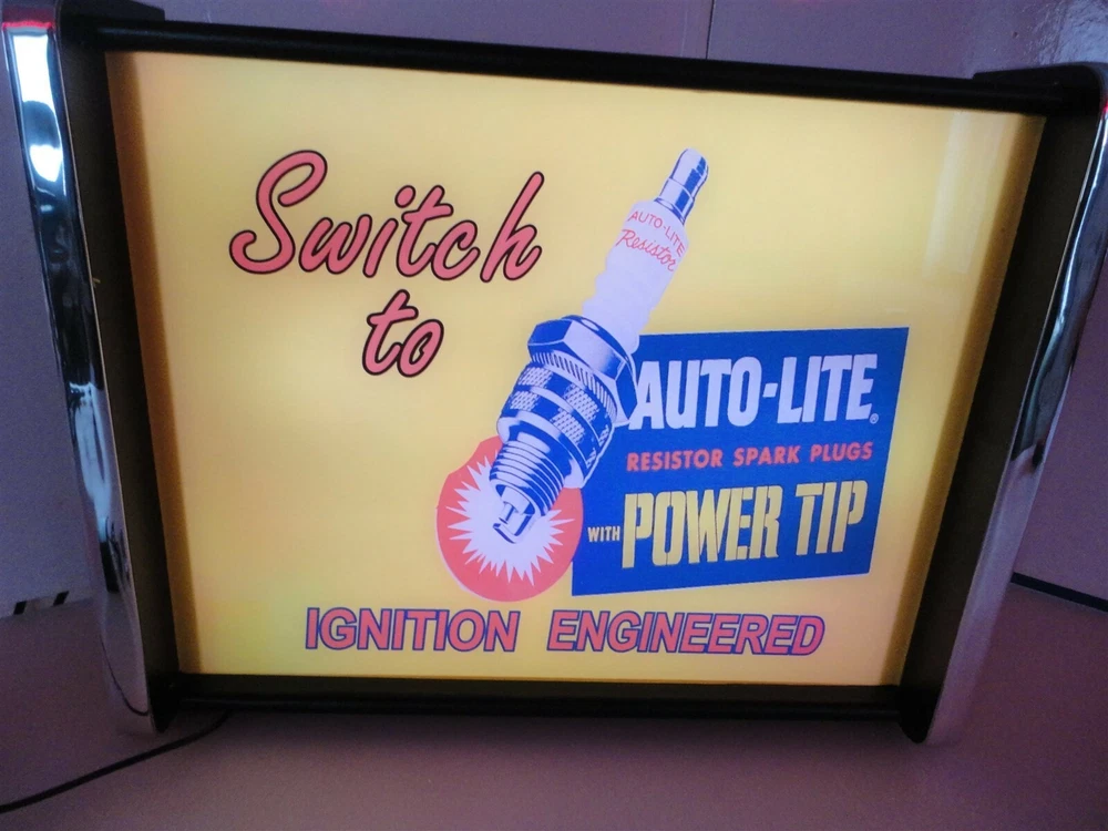 You are Bidding on a Auto Lite Spark Plug LED Display light sign box This sign has Vinyl Graphics applied to a plywood and Black melamine end caps AWESOME QUALITY It has a acrylic front sign panel that lights up with LED strip lights and a remote control to run them , they can change colors and flash and do all kinds of cool stuff It is 18" wide and 14" tall and 4 " deep It has a 110 volt power cord that run 12 volt LEDs I Will combine shipping on Multiple auctions We Do ship Internationally Powered by SixBit's eCommerce Solution