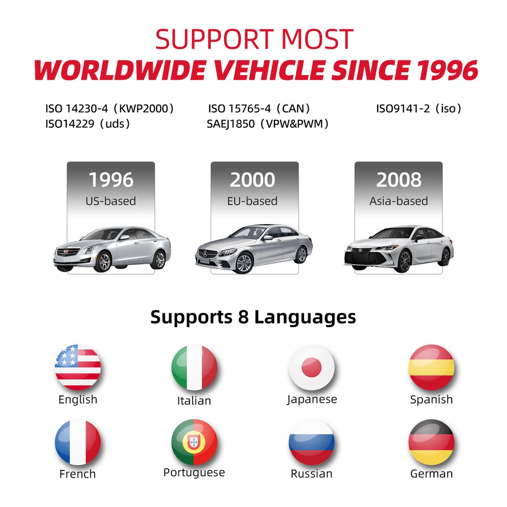 This device can only diagnose engine systems. THINKOBD 100 Description THINKOBD 100--DIY OBD2 Scanner:featuring all modes of OBDII functions, DTC Lookup, Plug and Play etc., it is truly the ultimate entry-level choice in ease and affordability, enabling DIY users to verify repairs, road test, check state emission monitor status and solve basic engine and driveability problems. Comprehensive OBD2 Function Read extensive current, pending and permanent codes in OBD system quickly Clear detected fault codes and turn off the Check Engine Light efficiently View graphical live data of vehicle's computer module(s) for easy analyses View the vehicle's operating parameters at the moment a DTC is detected Read I/M readiness status to have a vehicle inspected for state emissions compliance Perform O2 sensor test to check fuel efficiency and vehicle emissions Read the results of on-board diagnostic monitoring tests for specific components/systems Retrieve the vehicle information of VIN, CINs, and CVNs completely Perform the component Test by allowing initiating a leak test for the vehicle's EVAP system Reset Check Engine Light THINKOBD 100 enables you to clear the engine warning light, after completing the full obd2 diagnostics with ease. The main purpose of this tool is to: Scan the engine systems; Tell you about the nature of the issue; Give an accurate reason why the engine check light is on; Help to detect any potential problems; Avoid excessive costs for unnecessary repairs. The warning light does not turn off till you fix the issue. DTC Lookup Support: Get DTC's definition in no time with the DTC Lookup function. Never waste time on Google or taking your dictionary out when you want to know the meaning of any DTC. For vehicle compatibility, feel free to go for customer service. You'll get a satisfactory reply in a short time. Compatibility Vehicle Coverage: THINKOBD 100 is compatible with most American, European, and Asian models manufactured as from 1996. It supports all OBDII protocols: KWP2000, ISO9141, J1850 VPW, J1850 PWM and CAN (Controller Area Network). Support 8 Languages: It also supports 8 languages that include English, Portuguese, Russian, Italian, Spanish, French, German, Japanese Other User-Friendly Features Plug & Play You just need to connect the diagnostic cable into the vehicle's DLC socket, and the code reader gets the power directly from the vehicle. Easy-to-use Keypad The reader has 4 button keypad buttons that make the menu super easy to scroll. THINKOBD 100 users can operate up and down, press OK or use the enter button pretty easily, with a solid and effective touch to their delight. Compact Design The reader has a compact ergonomic design which makes it fit in the palm quite comfortably, especially made for people who don't want bulky devices. Full Functions&Cost-effective THINKOBD100 includes OBDII full functions and cost-effective.It is worth way more than it costs. PACKAGE LIST 1*Main Unit 1*Quick Start Guide Warranty: One Year Warranty