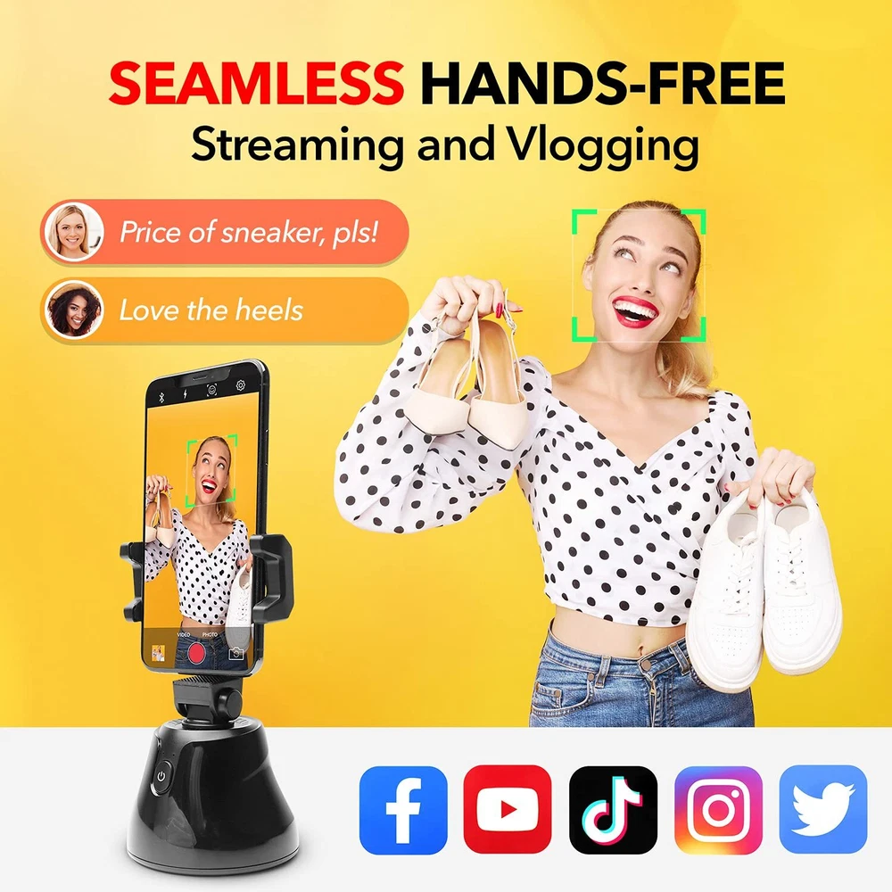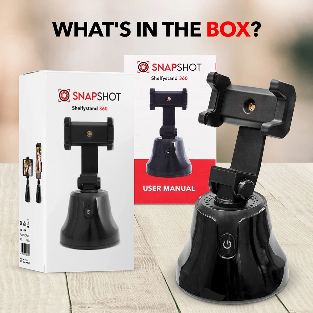 SHELFYSTAND 360 PHONE TRACKER TAKES YOUR PHOTOS AND VIDEOS TO THE NEXT LEVEL - Capture the perfect photo or live recording with the Shelfy Stand 360, equipped with a motorized motion sensored phone video tracker, manual tilting, and a Bluetooth shutter that connects to your smartphone. FACIAL TRACKING PHONE HOLDER UPGRADES YOUR CONTENT - Whether you’re going solo or snapping photos with friends, the 360 Stand auto tracking phone mount is the perfect companion to help you capture A plus content. The must-have motion tracking phone holder for TikTok and Instagram. AUTO TRACKING SMART SHOOTING HOLDER FOR EASE-OF-USE PHOTOGRAPHY - Holding your phone while you take videos and photos can be tiresome. This face tracking selfie stick and auto face tracking holder takes the effort out of taking videos and photos as it removes the need to hold your phone and guarantees a smooth, quality recording. PHONE HOLDER WITH SMART TRACKING TECHNOLOGY - This 360 tracking phone holder grips your phone firmly and uses 360 motion tracker phone technology to smoothly take recordings and photos. Never worry about shaky video recordings or blurry photos ever again with the auto tracking phone stand. EASY TO SET UP 360 SELFIE STAND - Simply install the autoface tracking phone holder app on your phone, turn on the auto tracking smart phone holder, and activate Bluetooth! Once the Apai Genie app is launched, follow the steps and choose your desired tracking mode. PORTABLE SMART TRACKING PHONE HOLDER - This 360 face tracking mount is ultra-portable so you can take it with you everywhere you go. Pop the 360 auto tracking phone holder in your purse or bag and make unbeatable content on the go! AUTOMATIC TRACKING TRIPOD WITH 360° AUTO-ROTATION - With 360° auto-rotation, the selfie stand lets you effortlessly achieve your desired angle for cool photos and videos. The motion tracking tripod tracks you so you're always at center focus. 3-SECOND COUNTDOWN TRACKING MOUNT - The portable phone mount face tracking stand's rotation auto face/body track mode has a 3-second countdown before it automatically snaps a photo, giving you plenty of time to strike the perfect pose. Perfect for taking multiple photos in a single sitting. 360 FACE TRACKING PHONE HOLDER GRIPS YOUR PHONE SECURELY - Featuring an auto-tension phone grip, this smart face tracking phone holder keeps your phone secure, no matter how big or small it is. Auto tracking tripod holds devices up to 117mm (4.5 inches) wide. TRACKING CELL PHONE HOLDER COMPATIBLE WITH TRIPOD - The motion tracker phone holder comes with a built-in camera tripod mount (standard 1/4” thread) that allows you to mount it to a tripod to extend height for a more professional touch.