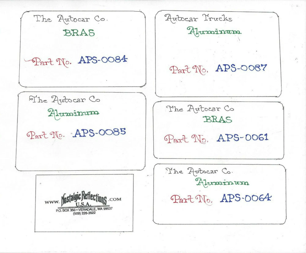 Here we have a "CHOICE" of Data Plate for a Vintage Autocar Truck Chassis.They have been deep acid etched in aluminum, & brass, and black enamel back filled. You are buying just ONE of these plates. When you click on the "Buy it Now" button, there is a place that you can send a note to the seller. Please let us know which plate you want by the part number, found on the picture with the legend. If the buyer is interested, Nostalgic Reflections can stamp your numbers for an additional $10.00 per pad. Count the number of pads on the plate that you want stamped. We would send the buyer another PayPal Invoice after the initial sale for the stamping. We will need to know your numbers at this time, and your email address. Part No. APS-0084 Measures 2 7/8" X 4 5/8" Part No. APS-0087 Measures 3 1/4" X 4 5/8" Part No. APS-0085 Measures 2 7/8" X 4 5/8" Part No. APS-0061 Measures 2 1/8" X 4 3/4" Part No. APS-0064 Measures 2 1/8" X 4 3/4" This Autocar Truck data plate is "ONE" of only "9" of each; that were custom made by Nostalgic Reflections of Veradale, Washington who makes custom "One Off" parts for their customers who own, and restore antique vehicles. Insured shipping and handling in the USA is $8.00 and International is $29.75 for "Registered" tracking mail. Check out our other listings for rare, hard to find, or unique items. Thank you! Jerry Turner Nostalgic Reflections