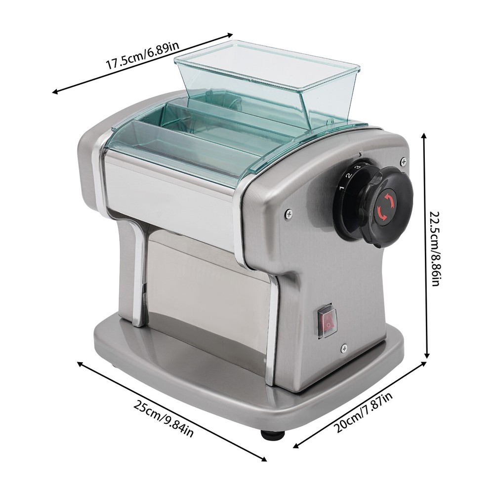 Noodle Machine Maker Tabletop Automatic Electric Noodle Making Machine 135W Welcome to our store^-^ Description A great automatic noodle machine can help you make noodles of different thicknesses and crusts of different thicknesses for you and your family to enjoy deliciously. Our product is made of high-quality stainless steel for durability, has a high power of 135W and offers 9 thickness adjustments so you can quickly make different sizes of pasta to really meet your needs. Come and bring it home! Key Features Sturdy and Durable: The item is made of high-quality 409# stainless steel, 201# stainless steel, ABS and 410# stainless steel materials with an electroplating process, making it resistant to deformation, oxidation, rust, and safe to use, so it can keep practical and beautiful without frequent replacement. High Efficiency: The 135W powerful aluminum motor and chain drive design make the product run more stably, so you can make noodles faster and more efficiently to provide delicious food for your family. Adjustable Thickness: You can use the thickness knob to cycle through 9 gears to make crusts of 0.5mm and 5mm(1st gear is the thickest while 9th gear is the thinnest), facilitating dough preparation. Thoughtful Design: The blade thickness (2 mm) is convenient for making crusts and thin noodles, giving you more options. Moreover, its press and cut knob allow you to make better different sizes of noodles. Complete Set: The product also includes a brush for oiling the dough, and molds for making dumplings as well as a tool for cutting the dough, so you don't have to buy extra, saving you time and effort. High Safety : Uniform heat dissipation holes on the bottom ensure smooth operation and increase safety during use. In addition, the ABS protective cover prevents the risk of scratches for added safety. Easy to Clean: Thanks to its smooth surface and removable shield, you can clean the product more easily with a rag or a brush ( not included ). Details Practical Brush: It helps you clean the product better and can be used to apply vegetable oil(not included) to the rotating parts for better lubrication. 4 Anti-slip Pads: The anti-slip silicone pads on the bottom of the product dampen vibration, reduce noise and ensure stability when in use. Power Switch: The one-touch power switch and the outer protective barrier are waterproof and dustproof , which are convenient for you to operate and improve the safety of use. Application It can be used in homes, breakfast stores, restaurants, noodle shops, etc. It can be used with gluten flour, spelling flour, etc. and used to make spaghetti, lasagna, spaghetti and dumplings. How to Use 1. Mix the flour(not included) and water about 4:1. 2. Cut the dough into small pieces. 3. Turn the knob to pressing mode. 4. Adjust the thickness settings. 5. Press the dough repeatedly. 6. Turn the knob to cutting mode. 7. Cut noodles. Specifications Color: Silver Material: 409# Stainless Steel, 201# Stainless Steel, 410# Stainless Steel, ABS Process: Electroplating Assembly Required: Yes Mounting Type: Tabletop Power Source: Corded Plug Type: US Standard Motor Type: Aluminum Motor Operation Mode: Automatic Power: 135W Voltage: 110V Gears: 9 Gears Is Dishwasher Safe: No Adjustable Thickness Range: 0.5-5mm/0.02-0.2in Adapted Noodle Size: 2mm/0.08in Gross Weight: 8.5kg/18.74lbs Net Weight: 7.5kg/16.53lbs Top Width: 17.5cm/6.89in Overall Product Size: 25*20*22.5cm/9.84*7.87*8.86in Package Size: 32.3*32*27cm/12.72*12.6*10.63in Package Included 1* Automatic Noodle Machine 1* Brush 1*Dough Cutter 4*Non-slip Foot Pads All Accessories for Assembly Notes Please add some flour(not included) on both sides of the dough when pressing the dough to prevent the dough from being too sticky and attached to the machine. Please note that this product does not include items such as flour. The machine cannot be disassembled and do not clean the machine directly with water. Please use a brush and wet dishcloth to clean the machine after each use. Please store the machine in a dry place to reduce corrosion. The machine is used for pressing and cutting noodles, not for polymer clay, pizza, or bread. It can not be used for over an hour. Please check the power cord frequently to reduce leakage and injury. Please often inject a little vegetable oil (not included) into the rotating parts to ensure lubrication. Please allow the slight color difference caused by the shooting light and 1-3cm error due to manual measurement, and make sure you do not mind before you order. Payment Delivery details Terms of sales About us Contact us Payment We accept ebay payment 。 Fees such as import duties, taxes are not included in the item price or shipping costs. These charges are the buyer's responsibility. Delivery details Shipping: 2-9 working days to: USA Terms of sales We maintain high standards of excellence and strive for hundred percent customer satisfaction. Feedback is very important to us. We hope that you contact us immediately before you give neutral or negative feedback, so that we can address your concerns. It is impossible to address issues if we do not know about them! About us Your satis faction is our ultimate goal. We work hard to earn your trust and future business. Our certified technicians have tested each item before shipping. The unit comes with 1 year limited warranty on all manufacturing defects. a) If you receive a defective item, you may return it or ask for a discount. Please contact us within 14 days after you receive the package. b) What you returned must be intact and in its original packaging as re? u. Customer is responsible for shipping costs of the returned item. c) We will cover the cost of shipping back t with the shipping rate indicated in the registration page. We will send you a new unit or refund the full payment you paid. Thank you. Contact us Business Hour Business Hour: Monday To Friday: 8:30 AM to 5:00 PM (Beijing China time) Due to time zones, our reply to yo