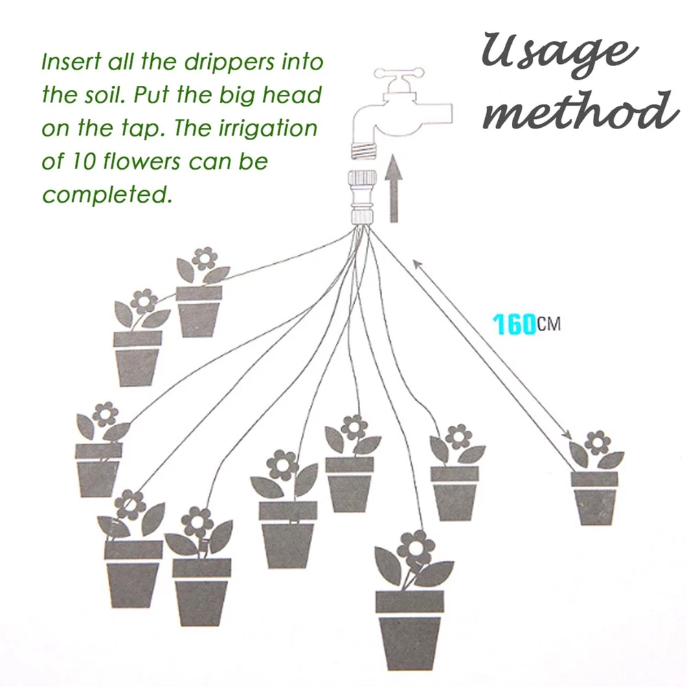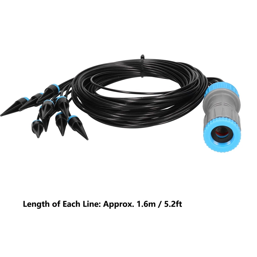 Item Type: Drip Irrigation Material: ABS, PP Length of Each Line: Approx. 1.6m / 5.2ft Connection Mode: G1/2 G3/4 Female Thread Connection Object: G1/2 G3/4 Male Thread Taps Scope of Application: Public green space, family gardens, agricultural production, gardening and horticultural production, etc.