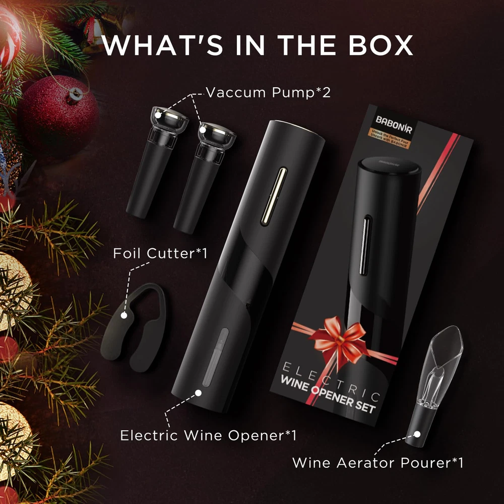 ELEGANTLY DESIGNED PRESENT SET: The Electric Wine Opener Present Set is thoughtfully designed to impress. It includes an exquisite greeting card, making it a perfect present for wine lovers on occasions like New Year, Valentine's Day, Anniversaries, Christmas, Thanksgiving, Mother's Day, Father's Day, Graduations, Birthdays, and more. ALL-IN-ONE WINE LOVER'S SET: Our automatic wine opener set covers all your needs in one package. It includes a foil cutter to effortlessly remove tin foil covers, a wine aerator pourer for enhanced wine flavor, and two vacuum stoppers to preserve the freshness of your red wine for 7 days. With the wine bottle opener set, you can savor every drop of your favorite wine. EFFORTLESS CORK REMOVAL: Say goodbye to struggling with traditional corkscrews. With 's automatic electric wine corkscrew, simply press the extract button and wait for 5 to 7 seconds to effortlessly remove the cork while keeping it intact. Then, press the release button to remove the cork from the opener. It's easy and convenient, suitable for all, including the elderly and those with arthritis. LONG-LASTING BATTERY LIFE: This electronic wine opener operates on 4 AA ALKALINE batteries (NOT INCLUDED) and can open up to 80 wine bottles on a single set of batteries. It's the perfect choice for special occasions like Mother’s Day, Christmas celebrations, anniversaries, Halloween parties, and weddings. Note: The built-in strap is designed for easy battery swapping. LIGHTWEIGHT AND STYLISH: Our electric wine opener boasts a compact design, making it portable for picnics or gatherings. Crafted from sleek black frosted material with a smooth surface, it's comfortable to hold and visually appealing. Its simple lines and unique design add a touch of elegance to any occasion.