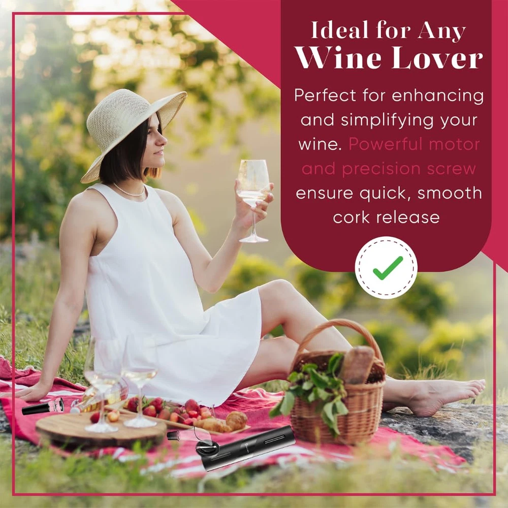 Complete 4-in-1 Kit: Our complete electric wine bottle opener set offers everything you need to enjoy, including electric wine opener, foil cutter, aerator pourer, and vacuum stopper. Effortless Cork Removal: Our wine opener electric features powerful and fast cork removal. Powerful motor and precision screw ensure quick, smooth cork release. It is silent, fast, simple and easy for anyone to use. Elegant Design: Our automatic wine opener design adds a touch of elegance to your wine experience and the ergonomic grip ensures easy handling. The superior quality materials make it durable and easy to clean. Enhanced Wine Tasting: Our wine opener set allows you to enjoy the delicious taste of quality wine with every sip, included 2-in-1 aerator and pourer helps to keep the wine in contact with the air, vacuum stopper preserves freshness. Ideal for Any Wine Lover: This 4-in-1 electric bottle opener combination fulfils all your wine opening, pouring and storage needs, making it the perfect gift for wine lovers; ideal for home, kitchen bar, party, wedding and more.