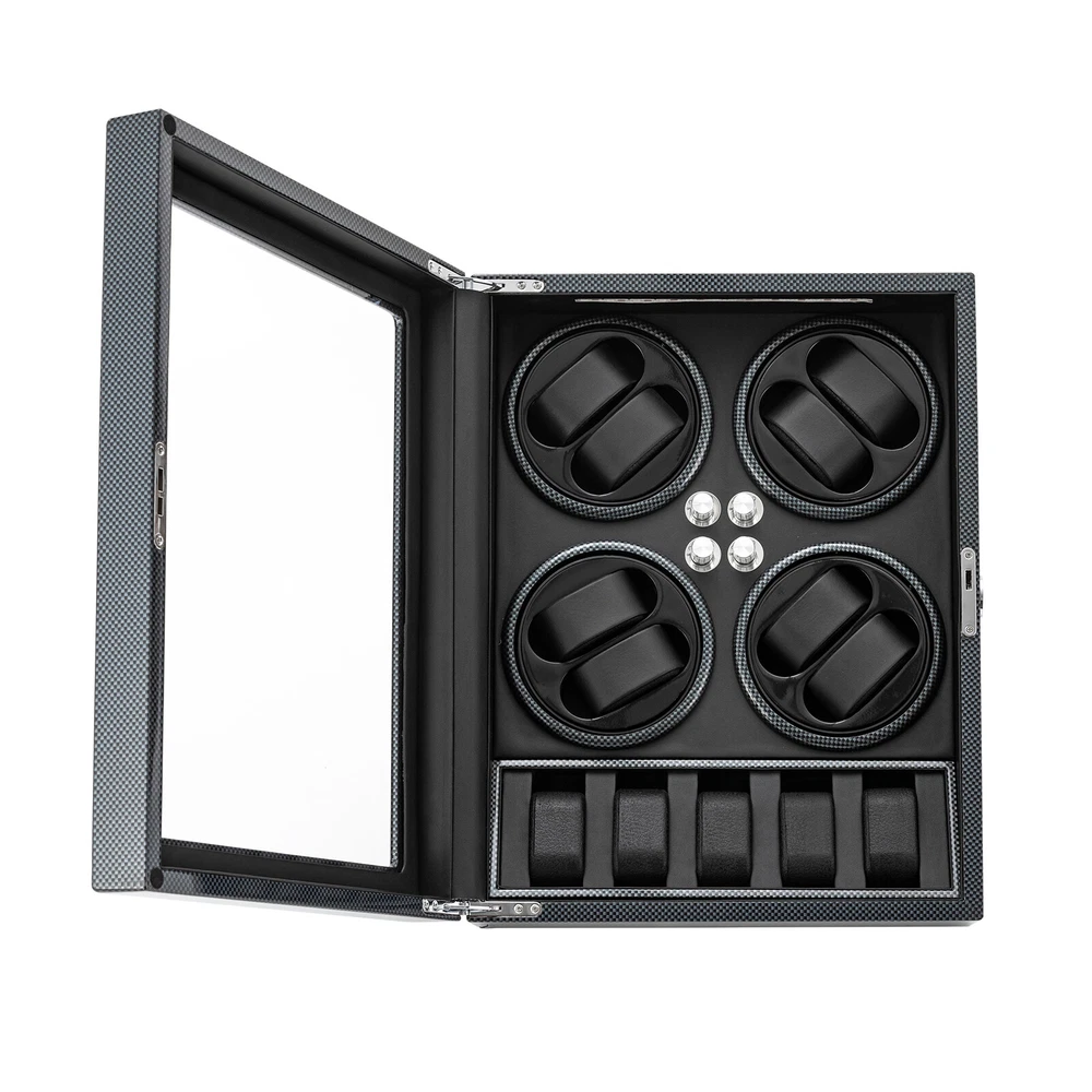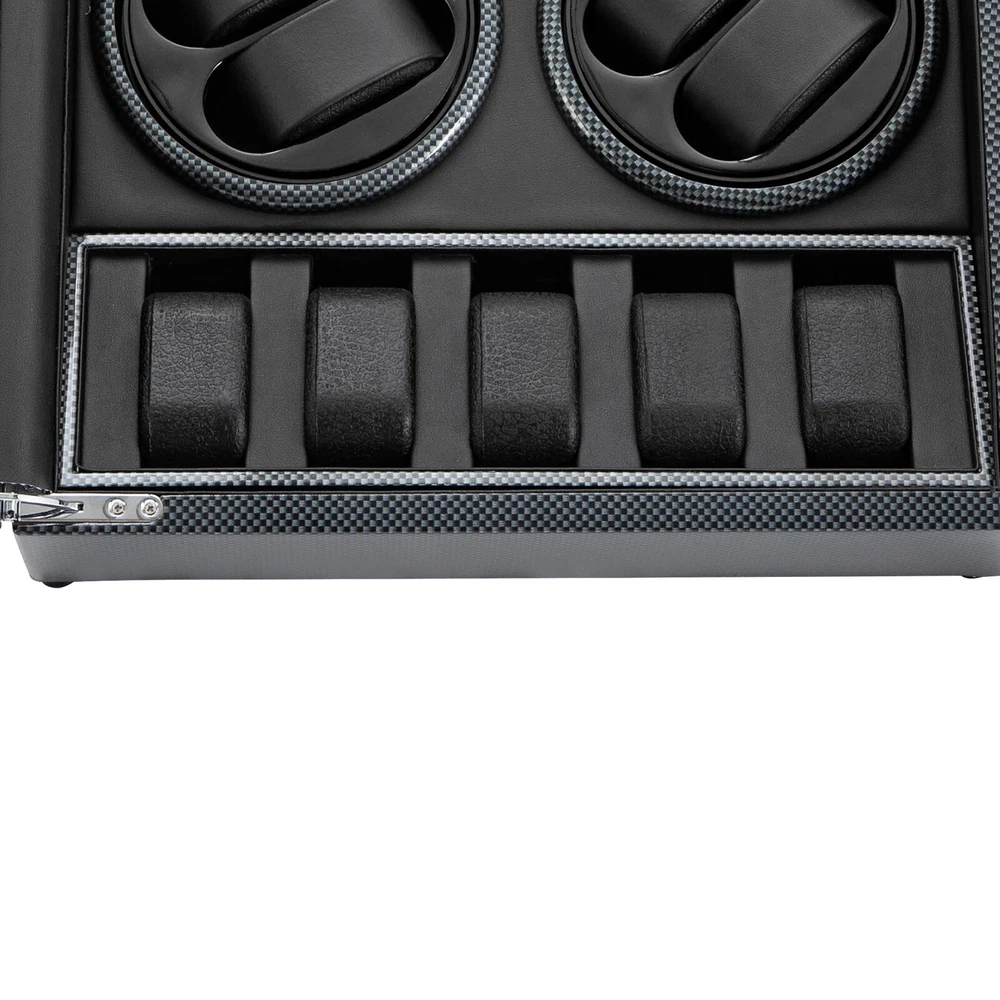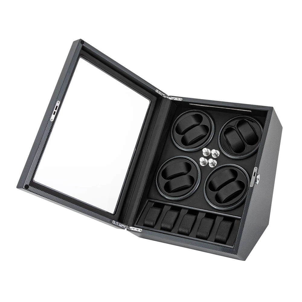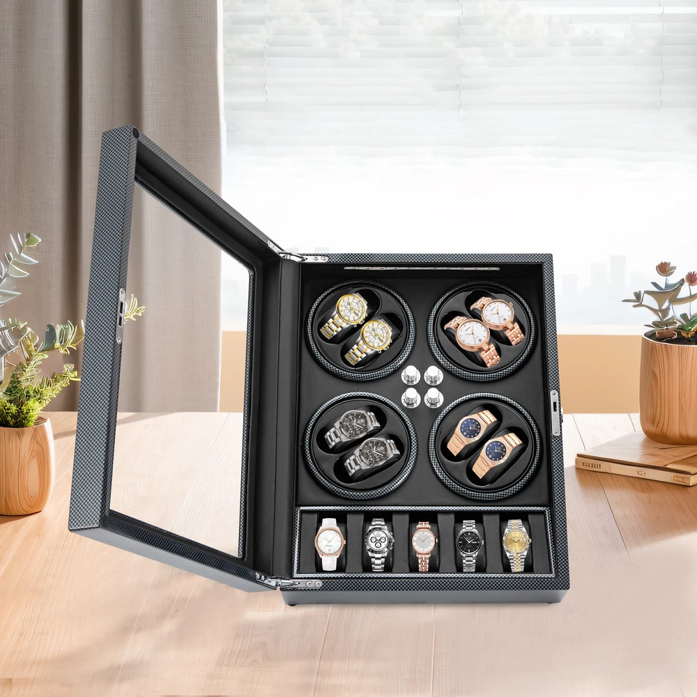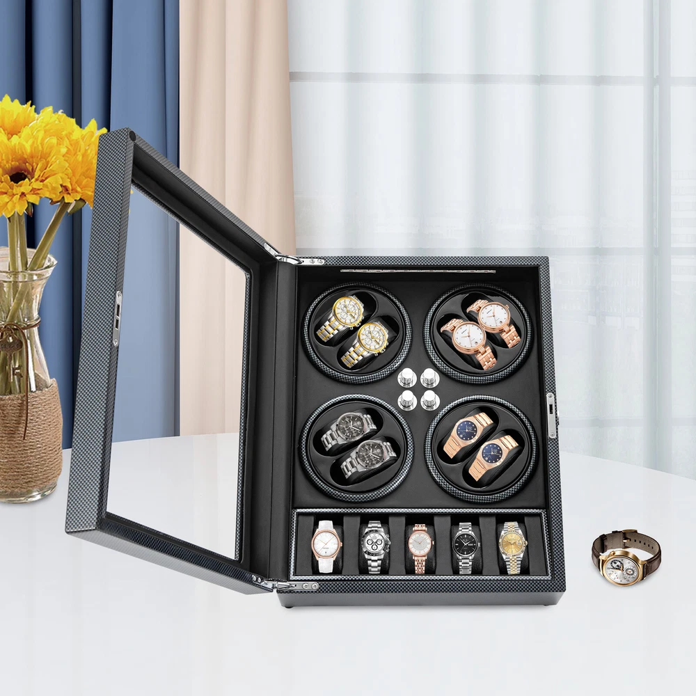 Automatic Rotation 8 Watch Winder Box w/5 Watches Display Storage Case LED Light Automatic Rotation 8+5 Watch Winder Box Watch Display Box Storage Case With Lock Description Mechanical watches require frequent energy storage on the chain to maintain the lubrication and operation of mechanical gears, extend the service life of mechanical watches, and ensure accurate timing. Therefore, it is important to choose the right watch winder. Our product boasts exquisite workmanship, a clear window, a lock&key design, soft watch pillows, and 8+5 slots, storing and displaying your watches safely and elegantly. Key Features Sturdy and Soft: The high-quality acrylic and hardware and baking varnish technology make it resistant to rust, corrosion, deformation, tear, and wear, ensuring high durability. The PU lining provides a soft feeling as if you're gently touching a baby's face when you rest your hand on the surface and pillow. Strong Protection : It helps maintain mechanical kinetic energy sufficient to maintain normal operation, protect your watches from stains and scratches, and extend the service life of your watches. The anti-magnetic d esign also ensures your watch movement remains unaffected by magnetic fields, keeping your watch accurate and on time at all times. Self-stop Function : Its open-lid self-stop function can reduce the damage caused by the forced blocking of the movement every time you take the w atch, making it convenient for you to replace the mechanical watch and making it faster and more efficient for you to use it in daily life. Low Noise : It boasts a quiet motor with a double ball bearing, ensuring a smooth, silent, and low-consumption operation and allowing you to enjoy a peaceful night's sleep or work without interruptions. Luxury Appearance: The black with texture, selected hardware accessories with glossiness, and finely polished paint baking process make them more textured and luxurious. The built-in blue LED lights enhance the texture and style of the watch under the illumination of light and shadow, providing a better visual experience for those who love the watch on hazy nights. Large Storage Space : It comes with eight rotating slots and five storage slots to accommodate a range of watches, making it very suitable for watch collectors, those with many watches, and watch shops. Exquisite Gift : As an exquisite decoration and practical tool, it is an ideal gift for your families, friends, colleagues, or business partners on a birthday, Thanksgiving, Christmas, Valentine's Day, Birthday, anniversary, Father's Day, or celebration day. Effortless to Operate: The 5-level chain-up mode allows it alternate clockwise and counterclockwise and cycle the chain-up, which can be set in one go without the need for further operation. The red button is the light switch and the black button is the power switch, together with a power supply socket and a long power adapter, you can easily use this product with less time and energy. Protective Package : To prevent the product from being damaged during transportation, we packed it with foam to protect your products to the maximum extent possible. Guaranteed Customer Service : We aim to provide quality products and services. If you have problems, please feel free to contact us. We will reply and solve the problem for you as soon as possible. Details Telescopic Watch Pillow: The watch pillows adopt an ergonomic design and can be easily placed at 360 ° without dead corners. They fit different sizes of women's and men's watches while protecting your watches from scratches. Clear Lid: The humanized lid adopts a visible window for elegantly displaying your watches while protecting your watches from dust and allowing you to view your favorite watches anytime. Its sturdy hinges ensure easy and smooth opening and closing of the lid. Anti-slip Feet: Four anti-slip feet can provide additional support to better maintain the stability of the product, raise the bottom to avoid moisture, and protect your countertop from scratches. Lock & Key : They can help you lock the watch winder to prevent accidental loss and increase security Cleaning Cloth : You can use it to wipe fingerprints and dust on the watch for better maintenance. How to Mode Mode 1: OFF operation switch. Mode 2: Rotate clockwise for 4 minutes and 30 seconds, rest for 55 minutes and 30 seconds, and cycle. Mode 3: Rotate counterclockwise for 4 minutes and 30 seconds, rest for 55 minutes and 30 seconds, and cycle. Mode 4: Rotate clockwise for 4 minutes, rest for 26 minutes, rotate counterclockwise for 4 minutes, rest for 26 minutes, and cycle. Mode 5: Rotate clockwise for 6 minutes, stop for 24 minutes (work for 4 hours, stop for 8 hours) , rotate the banknote clock counterclockwise for 4 minutes and 30 seconds, stop for 55 minutes and 30 seconds (work for 4 hours, stop for 8 hours), and cycle. Application It can be placed in the bedroom, living room, office, study, showcase, dressing table, shop, etc. to store and display different brands and sizes of watches. Specification Material: PU, Acrylic, Hardware, Carbon Fiber Sticker Surface Treatment: Baking Varnish Color: Black Style: Modern Numbers of Items: 1 Noise: About 10db Light Color: Blue Shape: Rectangular Display Type: Analog Capacity: 8+5 Watches Operation Mode: 5 Modes Power Source: Corded Electric Plug Type: US Standard Light Type: LED(Included) Input: 100-240V, 50/60Hz, 0.5A Output: 3.0V, 1.2A, 3.6W Product Size: 40*32*32cm/15.75*12.6*12.6in Package Size: 49*39*35cm/19.3* 15.35 * 13.78 in Gross Weight: 6.5kg/14.3 lbs Package Included 1* Watch Winder 1* Key 1* Power Adapter 1* Cleaning Cloth Notes The power adapter is usually placed in the gap of foam, please pay attention to find it. Please allow the slight color difference caused by the shooting light and 1-3cm error due to manual measurement and make sure you do not mind before ordering. Payment Delivery details Terms of sales About us Contact us Payment We accept ebay payment