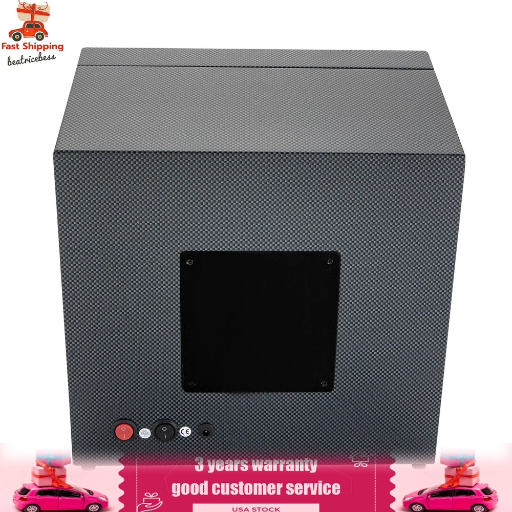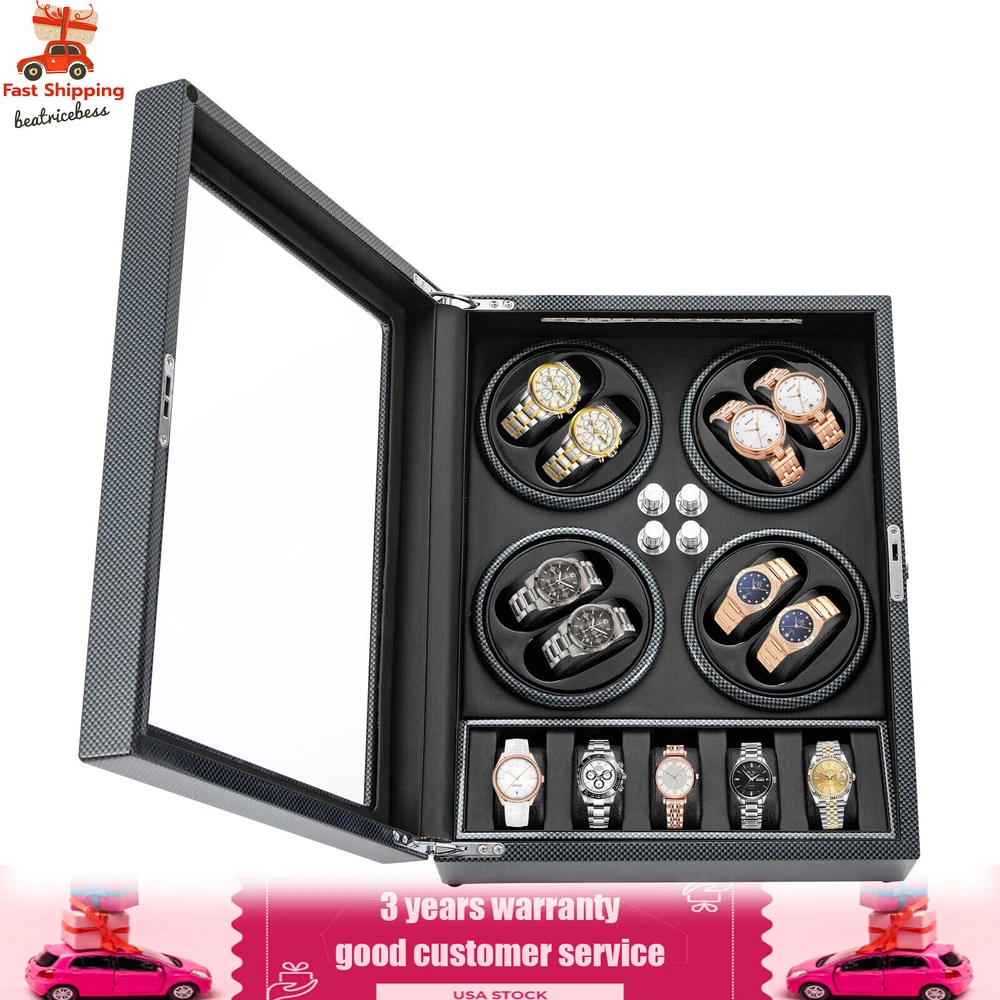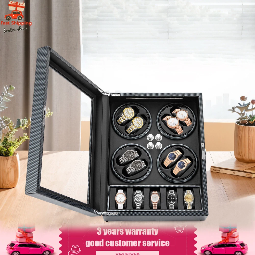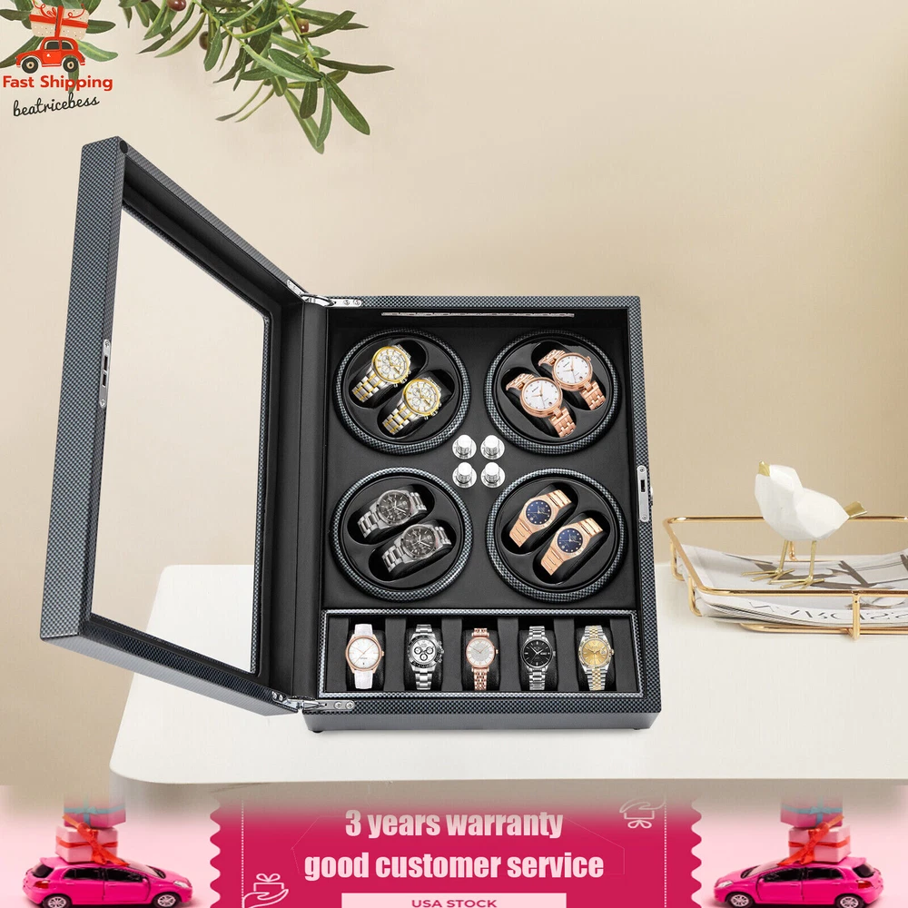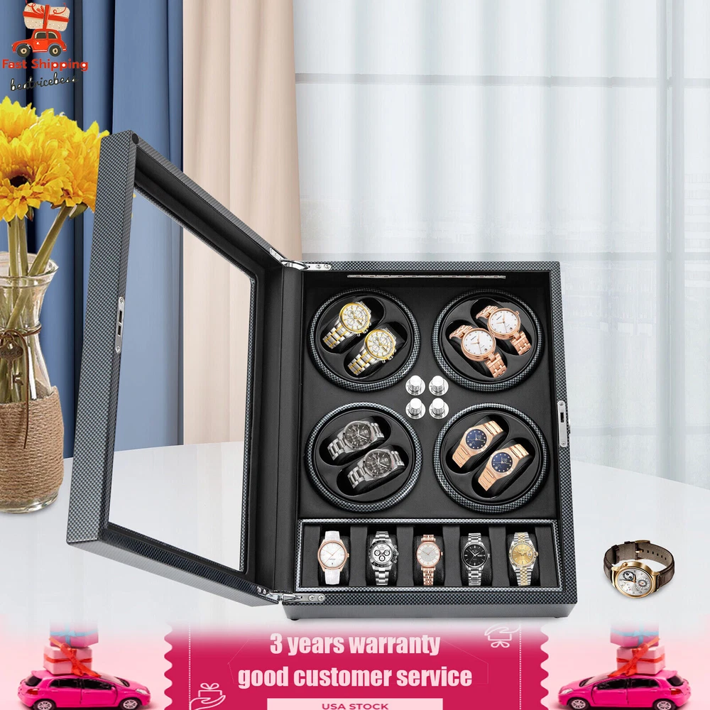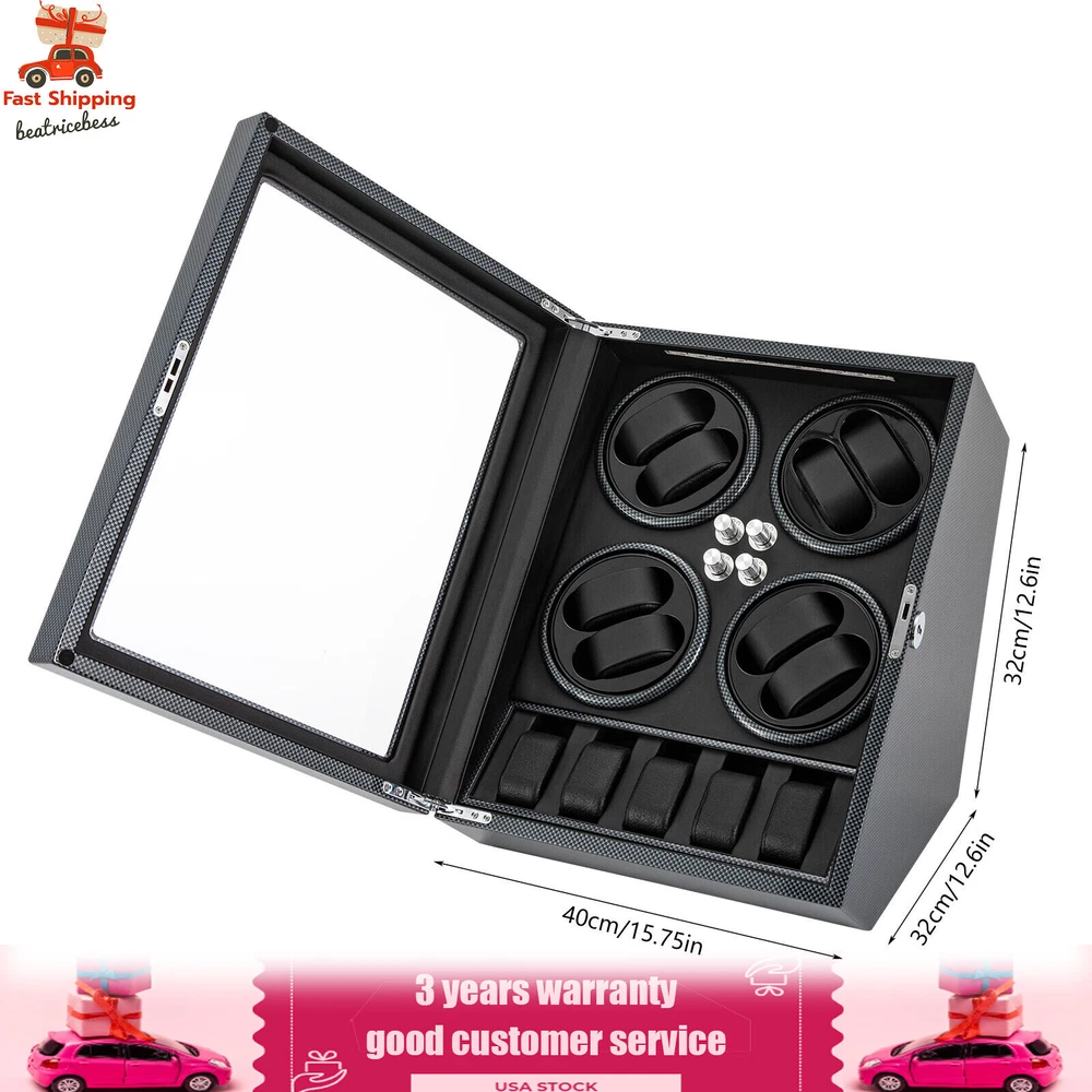 Automatic Rotation 8 Watch Winder Box w/5 Watches Display Storage Case Light LED Automatic Rotation 8+5 Watch Winder Box Watch Display Box Storage Case With Lock Description Mechanical watches require frequent energy storage on the chain to maintain the lubrication and operation of mechanical gears, extend the service life of mechanical watches, and ensure accurate timing. Therefore, it is important to choose the right watch winder. Our product boasts exquisite workmanship, a clear window, a lock&key design, soft watch pillows, and 8+5 slots, storing and displaying your watches safely and elegantly. Key Features Sturdy and Soft: The high-quality acrylic and hardware and baking varnish technology make it resistant to rust, corrosion, deformation, tear, and wear, ensuring high durability. The PU lining provides a soft feeling as if you're gently touching a baby's face when you rest your hand on the surface and pillow. Strong Protection : It helps maintain mechanical kinetic energy sufficient to maintain normal operation, protect your watches from stains and scratches, and extend the service life of your watches. The anti-magnetic d esign also ensures your watch movement remains unaffected by magnetic fields, keeping your watch accurate and on time at all times. Self-stop Function : Its open-lid self-stop function can reduce the damage caused by the forced blocking of the movement every time you take the w atch, making it convenient for you to replace the mechanical watch and making it faster and more efficient for you to use it in daily life. Low Noise : It boasts a quiet motor with a double ball bearing, ensuring a smooth, silent, and low-consumption operation and allowing you to enjoy a peaceful night's sleep or work without interruptions. Luxury Appearance: The black with texture, selected hardware accessories with glossiness, and finely polished paint baking process make them more textured and luxurious. The built-in blue LED lights enhance the texture and style of the watch under the illumination of light and shadow, providing a better visual experience for those who love the watch on hazy nights. Large Storage Space : It comes with eight rotating slots and five storage slots to accommodate a range of watches, making it very suitable for watch collectors, those with many watches, and watch shops. Exquisite Gift : As an exquisite decoration and practical tool, it is an ideal gift for your families, friends, colleagues, or business partners on a birthday, Thanksgiving, Christmas, Valentine's Day, Birthday, anniversary, Father's Day, or celebration day. Effortless to Operate: The 5-level chain-up mode allows it alternate clockwise and counterclockwise and cycle the chain-up, which can be set in one go without the need for further operation. The red button is the light switch and the black button is the power switch, together with a power supply socket and a long power adapter, you can easily use this product with less time and energy. Protective Package : To prevent the product from being damaged during transportation, we packed it with foam to protect your products to the maximum extent possible. Guaranteed Customer Service : We aim to provide quality products and services. If you have problems, please feel free to contact us. We will reply and solve the problem for you as soon as possible. Details Telescopic Watch Pillow: The watch pillows adopt an ergonomic design and can be easily placed at 360 ° without dead corners. They fit different sizes of women's and men's watches while protecting your watches from scratches. Clear Lid: The humanized lid adopts a visible window for elegantly displaying your watches while protecting your watches from dust and allowing you to view your favorite watches anytime. Its sturdy hinges ensure easy and smooth opening and closing of the lid. Anti-slip Feet: Four anti-slip feet can provide additional support to better maintain the stability of the product, raise the bottom to avoid moisture, and protect your countertop from scratches. Lock & Key : They can help you lock the watch winder to prevent accidental loss and increase security Cleaning Cloth : You can use it to wipe fingerprints and dust on the watch for better maintenance. How to Mode Mode 1: OFF operation switch. Mode 2: Rotate clockwise for 4 minutes and 30 seconds, rest for 55 minutes and 30 seconds, and cycle. Mode 3: Rotate counterclockwise for 4 minutes and 30 seconds, rest for 55 minutes and 30 seconds, and cycle. Mode 4: Rotate clockwise for 4 minutes, rest for 26 minutes, rotate counterclockwise for 4 minutes, rest for 26 minutes, and cycle. Mode 5: Rotate clockwise for 6 minutes, stop for 24 minutes (work for 4 hours, stop for 8 hours) , rotate the banknote clock counterclockwise for 4 minutes and 30 seconds, stop for 55 minutes and 30 seconds (work for 4 hours, stop for 8 hours), and cycle. Application It can be placed in the bedroom, living room, office, study, showcase, dressing table, shop, etc. to store and display different brands and sizes of watches. Specification Material: PU, Acrylic, Hardware, Carbon Fiber Sticker Surface Treatment: Baking Varnish Color: Black Style: Modern Numbers of Items: 1 Noise: About 10db Light Color: Blue Shape: Rectangular Display Type: Analog Capacity: 8+5 Watches Operation Mode: 5 Modes Power Source: Corded Electric Plug Type: US Standard Light Type: LED(Included) Input: 100-240V, 50/60Hz, 0.5A Output: 3.0V, 1.2A, 3.6W Product Size: 40*32*32cm/15.75*12.6*12.6in Package Size: 49*39*35cm/19.3* 15.35 * 13.78 in Gross Weight: 6.5kg/14.3 lbs Package Included 1* Watch Winder 1* Key 1* Power Adapter 1* Cleaning Cloth Notes The power adapter is usually placed in the gap of foam, please pay attention to find it. Please allow the slight color difference caused by the shooting light and 1-3cm error due to manual measurement and make sure you do not mind before ordering. Payment Delivery details Terms of sales About us Contact us Payment We accept ebay payment