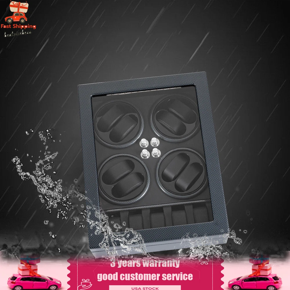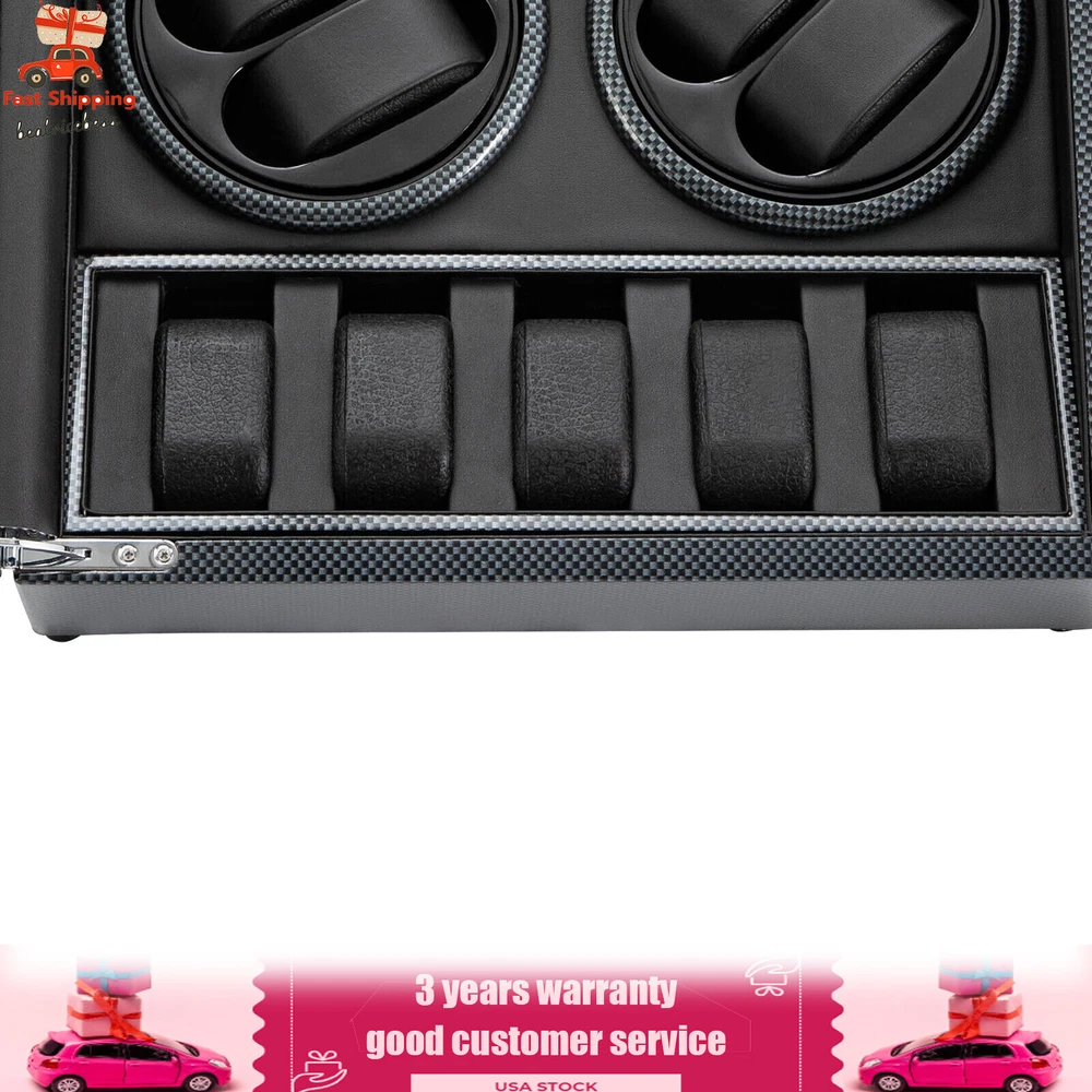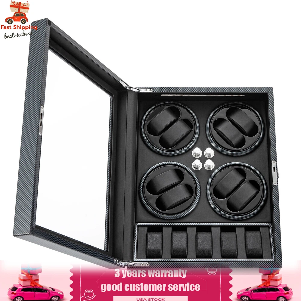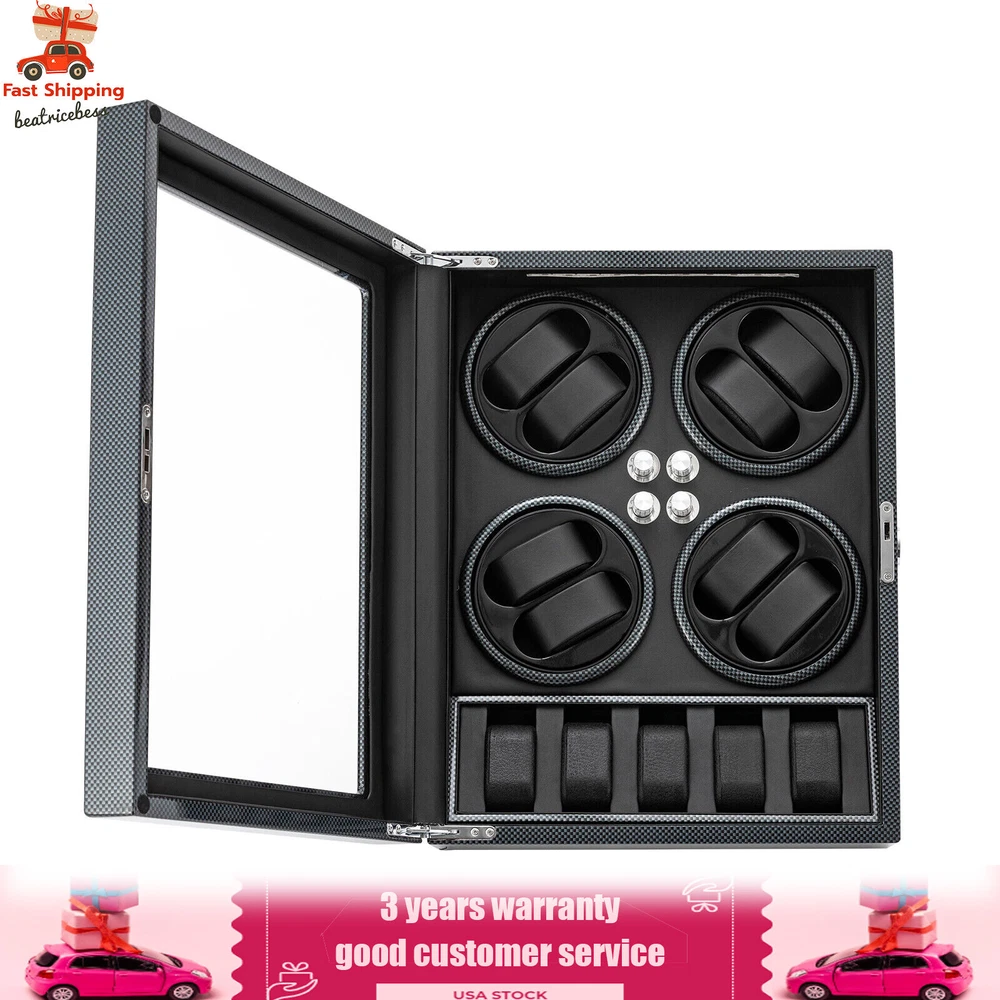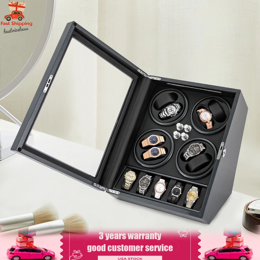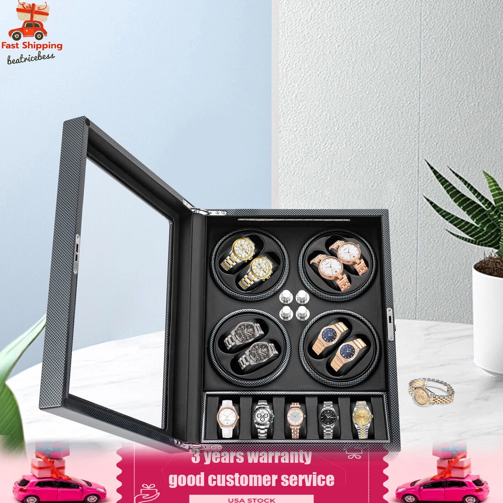 Automatic Rotation 8 Watch Winder Box w/5 Watches Display Storage Case Light LED Automatic Rotation 8+5 Watch Winder Box Watch Display Box Storage Case With Lock Description Mechanical watches require frequent energy storage on the chain to maintain the lubrication and operation of mechanical gears, extend the service life of mechanical watches, and ensure accurate timing. Therefore, it is important to choose the right watch winder. Our product boasts exquisite workmanship, a clear window, a lock&key design, soft watch pillows, and 8+5 slots, storing and displaying your watches safely and elegantly. Key Features Sturdy and Soft: The high-quality acrylic and hardware and baking varnish technology make it resistant to rust, corrosion, deformation, tear, and wear, ensuring high durability. The PU lining provides a soft feeling as if you're gently touching a baby's face when you rest your hand on the surface and pillow. Strong Protection : It helps maintain mechanical kinetic energy sufficient to maintain normal operation, protect your watches from stains and scratches, and extend the service life of your watches. The anti-magnetic d esign also ensures your watch movement remains unaffected by magnetic fields, keeping your watch accurate and on time at all times. Self-stop Function : Its open-lid self-stop function can reduce the damage caused by the forced blocking of the movement every time you take the w atch, making it convenient for you to replace the mechanical watch and making it faster and more efficient for you to use it in daily life. Low Noise : It boasts a quiet motor with a double ball bearing, ensuring a smooth, silent, and low-consumption operation and allowing you to enjoy a peaceful night's sleep or work without interruptions. Luxury Appearance: The black with texture, selected hardware accessories with glossiness, and finely polished paint baking process make them more textured and luxurious. The built-in blue LED lights enhance the texture and style of the watch under the illumination of light and shadow, providing a better visual experience for those who love the watch on hazy nights. Large Storage Space : It comes with eight rotating slots and five storage slots to accommodate a range of watches, making it very suitable for watch collectors, those with many watches, and watch shops. Exquisite Gift : As an exquisite decoration and practical tool, it is an ideal gift for your families, friends, colleagues, or business partners on a birthday, Thanksgiving, Christmas, Valentine's Day, Birthday, anniversary, Father's Day, or celebration day. Effortless to Operate: The 5-level chain-up mode allows it alternate clockwise and counterclockwise and cycle the chain-up, which can be set in one go without the need for further operation. The red button is the light switch and the black button is the power switch, together with a power supply socket and a long power adapter, you can easily use this product with less time and energy. Protective Package : To prevent the product from being damaged during transportation, we packed it with foam to protect your products to the maximum extent possible. Guaranteed Customer Service : We aim to provide quality products and services. If you have problems, please feel free to contact us. We will reply and solve the problem for you as soon as possible. Details Telescopic Watch Pillow: The watch pillows adopt an ergonomic design and can be easily placed at 360 ° without dead corners. They fit different sizes of women's and men's watches while protecting your watches from scratches. Clear Lid: The humanized lid adopts a visible window for elegantly displaying your watches while protecting your watches from dust and allowing you to view your favorite watches anytime. Its sturdy hinges ensure easy and smooth opening and closing of the lid. Anti-slip Feet: Four anti-slip feet can provide additional support to better maintain the stability of the product, raise the bottom to avoid moisture, and protect your countertop from scratches. Lock & Key : They can help you lock the watch winder to prevent accidental loss and increase security Cleaning Cloth : You can use it to wipe fingerprints and dust on the watch for better maintenance. How to Mode Mode 1: OFF operation switch. Mode 2: Rotate clockwise for 4 minutes and 30 seconds, rest for 55 minutes and 30 seconds, and cycle. Mode 3: Rotate counterclockwise for 4 minutes and 30 seconds, rest for 55 minutes and 30 seconds, and cycle. Mode 4: Rotate clockwise for 4 minutes, rest for 26 minutes, rotate counterclockwise for 4 minutes, rest for 26 minutes, and cycle. Mode 5: Rotate clockwise for 6 minutes, stop for 24 minutes (work for 4 hours, stop for 8 hours) , rotate the banknote clock counterclockwise for 4 minutes and 30 seconds, stop for 55 minutes and 30 seconds (work for 4 hours, stop for 8 hours), and cycle. Application It can be placed in the bedroom, living room, office, study, showcase, dressing table, shop, etc. to store and display different brands and sizes of watches. Specification Material: PU, Acrylic, Hardware, Carbon Fiber Sticker Surface Treatment: Baking Varnish Color: Black Style: Modern Numbers of Items: 1 Noise: About 10db Light Color: Blue Shape: Rectangular Display Type: Analog Capacity: 8+5 Watches Operation Mode: 5 Modes Power Source: Corded Electric Plug Type: US Standard Light Type: LED(Included) Input: 100-240V, 50/60Hz, 0.5A Output: 3.0V, 1.2A, 3.6W Product Size: 40*32*32cm/15.75*12.6*12.6in Package Size: 49*39*35cm/19.3* 15.35 * 13.78 in Gross Weight: 6.5kg/14.3 lbs Package Included 1* Watch Winder 1* Key 1* Power Adapter 1* Cleaning Cloth Notes The power adapter is usually placed in the gap of foam, please pay attention to find it. Please allow the slight color difference caused by the shooting light and 1-3cm error due to manual measurement and make sure you do not mind before ordering. Payment Delivery details Terms of sales About us Contact us Payment We accept ebay payment