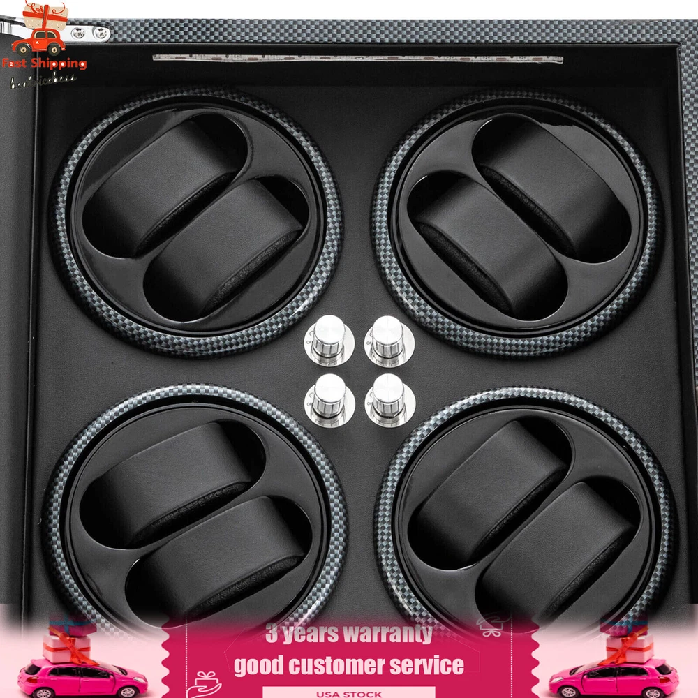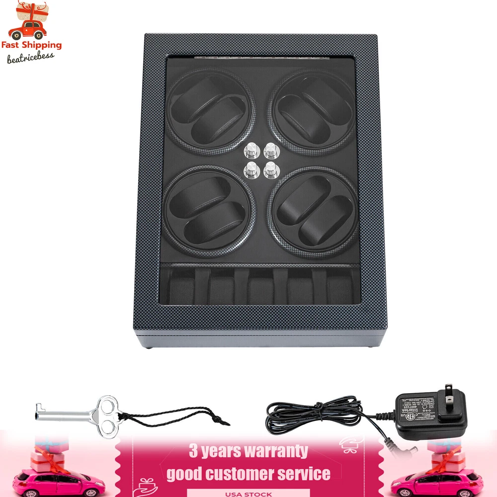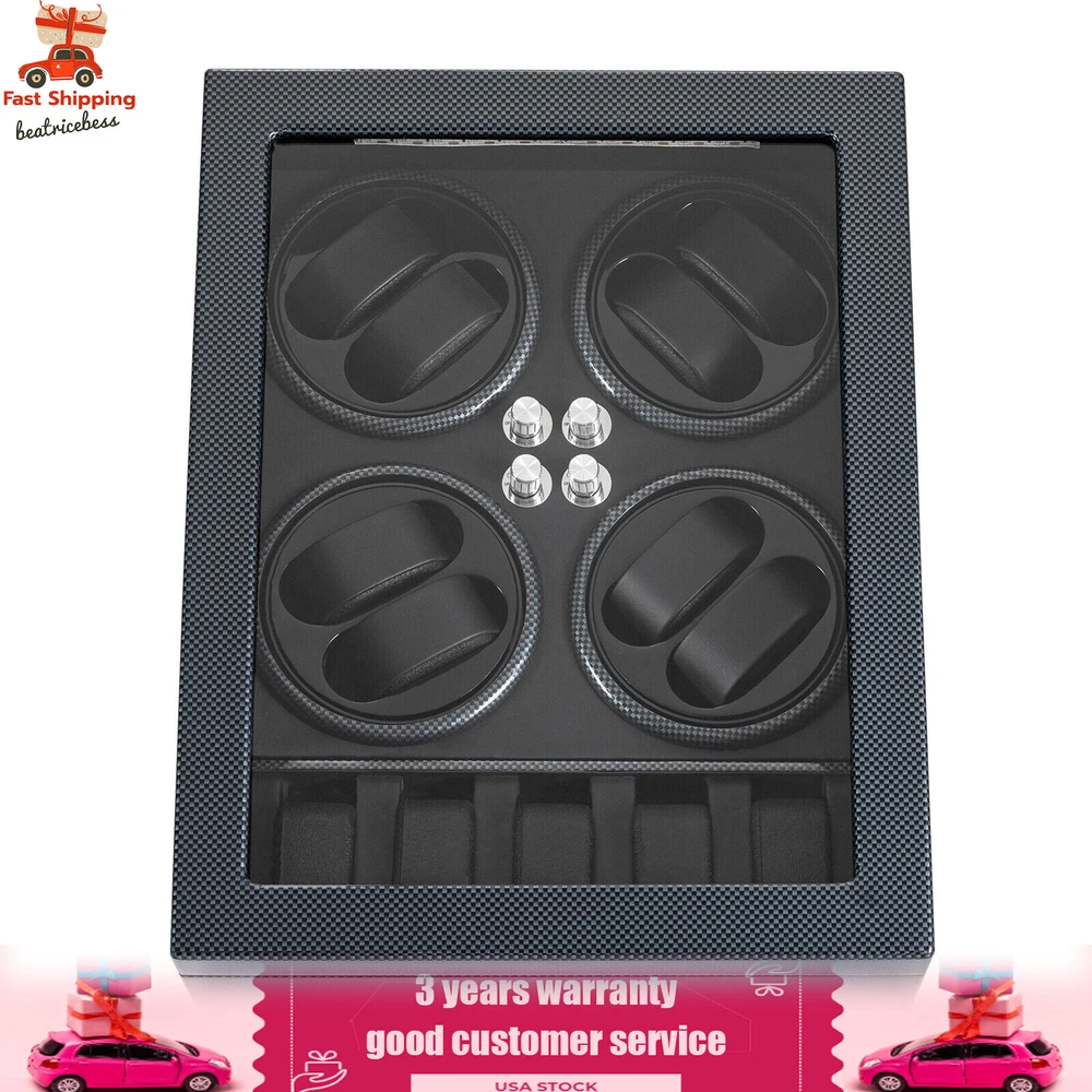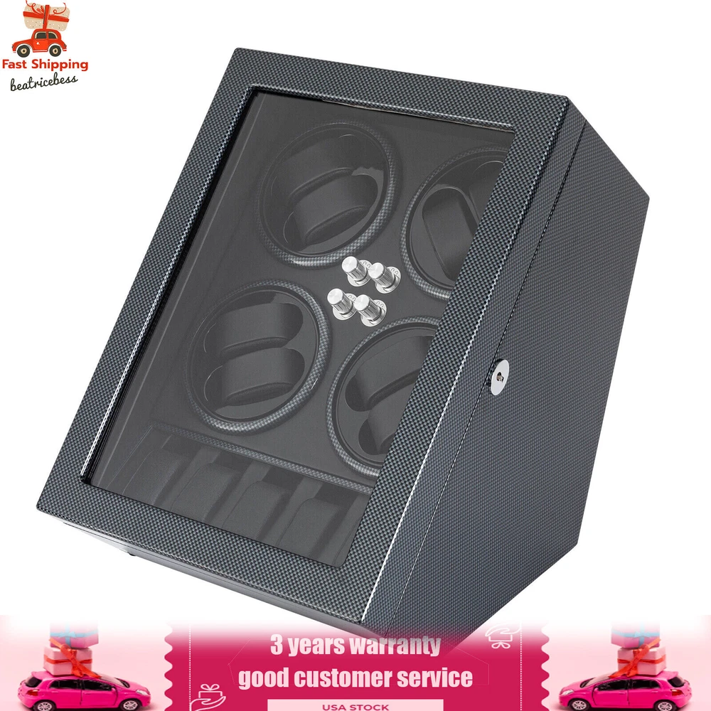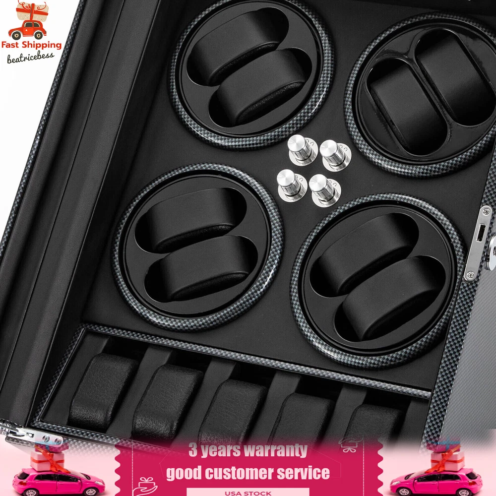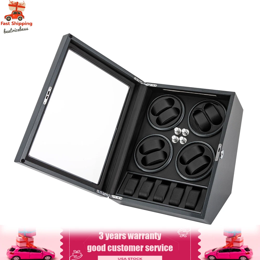 Automatic Rotation 8 Watch Winder Box w/5 Watches Display Storage Case Light LED Automatic Rotation 8+5 Watch Winder Box Watch Display Box Storage Case With Lock Description Mechanical watches require frequent energy storage on the chain to maintain the lubrication and operation of mechanical gears, extend the service life of mechanical watches, and ensure accurate timing. Therefore, it is important to choose the right watch winder. Our product boasts exquisite workmanship, a clear window, a lock&key design, soft watch pillows, and 8+5 slots, storing and displaying your watches safely and elegantly. Key Features Sturdy and Soft: The high-quality acrylic and hardware and baking varnish technology make it resistant to rust, corrosion, deformation, tear, and wear, ensuring high durability. The PU lining provides a soft feeling as if you're gently touching a baby's face when you rest your hand on the surface and pillow. Strong Protection : It helps maintain mechanical kinetic energy sufficient to maintain normal operation, protect your watches from stains and scratches, and extend the service life of your watches. The anti-magnetic d esign also ensures your watch movement remains unaffected by magnetic fields, keeping your watch accurate and on time at all times. Self-stop Function : Its open-lid self-stop function can reduce the damage caused by the forced blocking of the movement every time you take the w atch, making it convenient for you to replace the mechanical watch and making it faster and more efficient for you to use it in daily life. Low Noise : It boasts a quiet motor with a double ball bearing, ensuring a smooth, silent, and low-consumption operation and allowing you to enjoy a peaceful night's sleep or work without interruptions. Luxury Appearance: The black with texture, selected hardware accessories with glossiness, and finely polished paint baking process make them more textured and luxurious. The built-in blue LED lights enhance the texture and style of the watch under the illumination of light and shadow, providing a better visual experience for those who love the watch on hazy nights. Large Storage Space : It comes with eight rotating slots and five storage slots to accommodate a range of watches, making it very suitable for watch collectors, those with many watches, and watch shops. Exquisite Gift : As an exquisite decoration and practical tool, it is an ideal gift for your families, friends, colleagues, or business partners on a birthday, Thanksgiving, Christmas, Valentine's Day, Birthday, anniversary, Father's Day, or celebration day. Effortless to Operate: The 5-level chain-up mode allows it alternate clockwise and counterclockwise and cycle the chain-up, which can be set in one go without the need for further operation. The red button is the light switch and the black button is the power switch, together with a power supply socket and a long power adapter, you can easily use this product with less time and energy. Protective Package : To prevent the product from being damaged during transportation, we packed it with foam to protect your products to the maximum extent possible. Guaranteed Customer Service : We aim to provide quality products and services. If you have problems, please feel free to contact us. We will reply and solve the problem for you as soon as possible. Details Telescopic Watch Pillow: The watch pillows adopt an ergonomic design and can be easily placed at 360 ° without dead corners. They fit different sizes of women's and men's watches while protecting your watches from scratches. Clear Lid: The humanized lid adopts a visible window for elegantly displaying your watches while protecting your watches from dust and allowing you to view your favorite watches anytime. Its sturdy hinges ensure easy and smooth opening and closing of the lid. Anti-slip Feet: Four anti-slip feet can provide additional support to better maintain the stability of the product, raise the bottom to avoid moisture, and protect your countertop from scratches. Lock & Key : They can help you lock the watch winder to prevent accidental loss and increase security Cleaning Cloth : You can use it to wipe fingerprints and dust on the watch for better maintenance. How to Mode Mode 1: OFF operation switch. Mode 2: Rotate clockwise for 4 minutes and 30 seconds, rest for 55 minutes and 30 seconds, and cycle. Mode 3: Rotate counterclockwise for 4 minutes and 30 seconds, rest for 55 minutes and 30 seconds, and cycle. Mode 4: Rotate clockwise for 4 minutes, rest for 26 minutes, rotate counterclockwise for 4 minutes, rest for 26 minutes, and cycle. Mode 5: Rotate clockwise for 6 minutes, stop for 24 minutes (work for 4 hours, stop for 8 hours) , rotate the banknote clock counterclockwise for 4 minutes and 30 seconds, stop for 55 minutes and 30 seconds (work for 4 hours, stop for 8 hours), and cycle. Application It can be placed in the bedroom, living room, office, study, showcase, dressing table, shop, etc. to store and display different brands and sizes of watches. Specification Material: PU, Acrylic, Hardware, Carbon Fiber Sticker Surface Treatment: Baking Varnish Color: Black Style: Modern Numbers of Items: 1 Noise: About 10db Light Color: Blue Shape: Rectangular Display Type: Analog Capacity: 8+5 Watches Operation Mode: 5 Modes Power Source: Corded Electric Plug Type: US Standard Light Type: LED(Included) Input: 100-240V, 50/60Hz, 0.5A Output: 3.0V, 1.2A, 3.6W Product Size: 40*32*32cm/15.75*12.6*12.6in Package Size: 49*39*35cm/19.3* 15.35 * 13.78 in Gross Weight: 6.5kg/14.3 lbs Package Included 1* Watch Winder 1* Key 1* Power Adapter 1* Cleaning Cloth Notes The power adapter is usually placed in the gap of foam, please pay attention to find it. Please allow the slight color difference caused by the shooting light and 1-3cm error due to manual measurement and make sure you do not mind before ordering. Payment Delivery details Terms of sales About us Contact us Payment We accept ebay payment