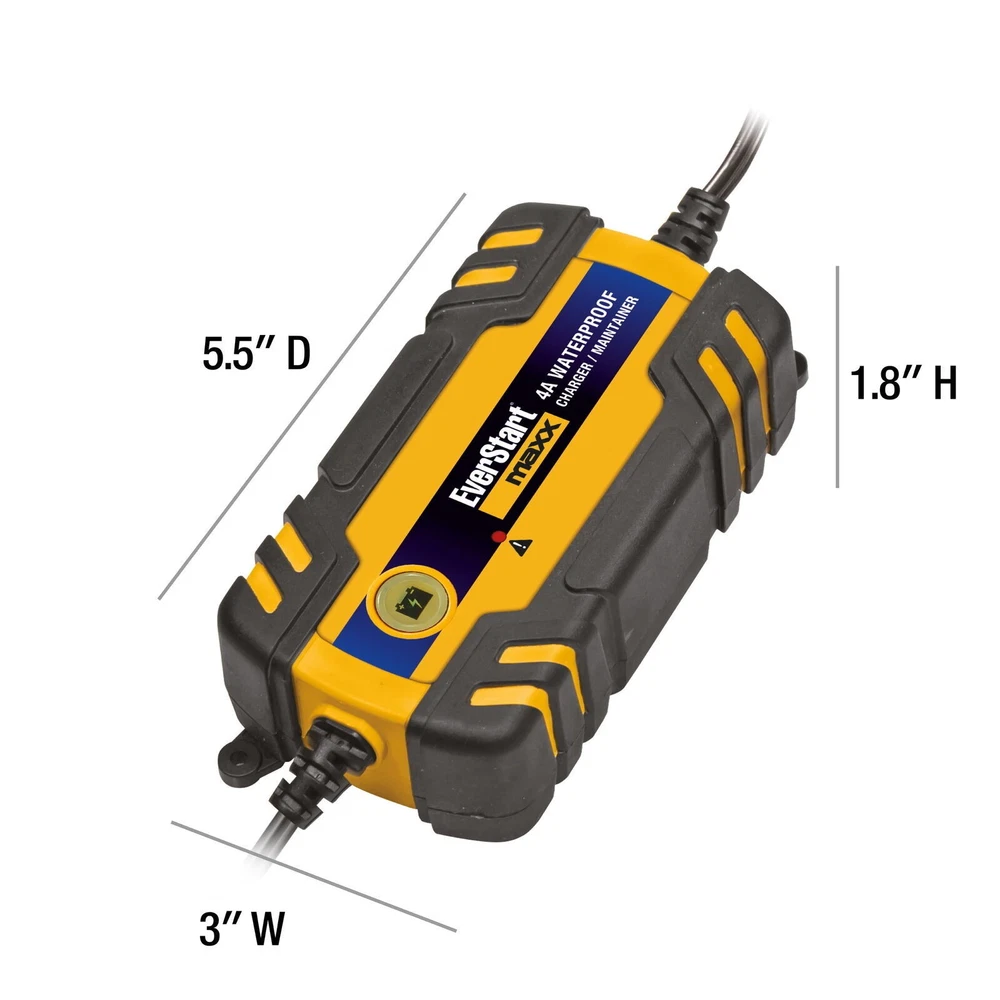 You may also like 4A Waterproof 12V Charger Maintainer AGM GEL WET Batteries W/ Circuit Protection 63.73 USD Free shipping Fully Automatic 6V 12V Battery Charger Maintainer 15A Motorcycles Auto Tester US 59.4 USD 62.53 USD Free shipping 5% off 6-in-1 Portable Power Station Jump Starter Air Compressor Inverter Work Light US 236.8 USD Free shipping 3 Amp 6V 12V Battery Charger Maintainer Automatic Microprocessor Protection New 37.55 USD Free shipping The Everstart BC4WE 4 Amp Waterproof Charger/Maintainer is completely sealed to protect against moisture, corrosion, dust and oil. Its fully automatic operation charges and maintains battery charge levels. The smart charge microprocessor automatically selects charge rate and adjusts from rapid charge to maintainer to maximize and maintain battery life. Compatible with any AGM, GEL, or WET 12 Volt battery. Includes battery clamps and battery terminal rings. Built in circuit protection and reverse polarity, with AC low-voltage compensation. 4 Amp Automatic 12V Charging for automotive/marine applications Fully waterproof, impact-resistant polymer housing Comes with battery clips and o-rings for convenient connection Extra-long cables for extended reach ETL certified with built-in protection against overvoltage and reverse polarity You may also like 10-Pack Fire Starters Outdoor Fire Pits Quick Easy Light Bonfire Campfire New 33.02 USD Free shipping Soft Chewy Dog Treats Beef Filet Mignon Recipe Chuck Roast 25oz Snacks All Sizes 24.62 USD Free shipping A-Frame Trailer Jack 2000lbs Topwind Heavy Duty Weld-on Bolt-on 14in Travel New 43.06 USD Free shipping 4 Slice Waffle Maker Nonstick Removable Plates Cool Touch Handle Indicator Light 60.05 USD Free shipping Full Synthetic 5W-40 Diesel Engine Oil Triple Protection Enhanced Fuel Economy 41.81 USD Free shipping Lutein Zeaxanthin Softgels 20mg Supports Eye Health Vision 90 Count Adults New 25.3 USD Free shipping Microfiber Flip Mop Dry Wet Use 2in1 Dust Mop 360° Rotating Lightweight Washable 18.46 USD Free shipping Heavy Duty Retractable Extension Cord Reel 4 Outlet W/ Circuit Breaker 25ft New 39.52 USD Free shipping S'mores Protein Energy Bars 13g Protein 5 Count Crispy Wafer Snack Bar New 11.9 USD Free shipping Modern Adjustable Desk Lamp Mixed Metal Task Light 180 Degree Rotating Shade New 38.13 USD Free shipping Fishing Tackle Backpack 27L W/ Utility Boxes Rod Holder Unisex Outdoor Gear New 47.94 USD Free shipping 2-Prong 15ft Indoor Extension Cord 3 Outlets Child Safety Kink-Free 16 Gauge New 12.97 USD Free shipping