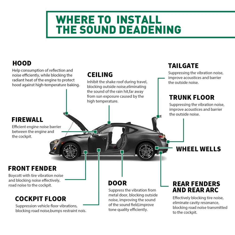 Specifications: Condition: 100% brand new Features: Car heat / sound insulation Placement on Vehicle: Front/Rear/Left/Right Reinforced / Crush Resistant: Yes Mildew & Mold Resistant: Yes Water resistant: Yes Non-toxic: Yes Material: Aluminum & Foam & Adhesive Backing Size:1m*2.4m=39INCH*94INCH=26sq.ft Thickness: 5mm=197mil=1/4INCH Feature: Yetkole Best choice of motor parts Automotive Noise Reduction 39"x94" Fireproof & Self-Adhesive Sound Deadener Pad Specifications: Condition: 100% brand new Features: Car heat / sound insulation Placement on Vehicle: Front/Rear/Left/Right Reinforced / Crush Resistant: Yes Mildew & Mold Resistant: Yes Water resistant: Yes Non-toxic: Yes Material: Aluminum & Foam & Adhesive Backing Size:1m*2.4m=39INCH*94INCH=26sq.ft Thickness: 5mm=197mil=1/4INCH Feature: 1. Durable housing for harsh environments 2. Easy to cut and fit, with strong adhesion 3. Due to its excellent load resistance, it is very suitable for underfloor applications 4. High temperature resistance, high noise reduction and insulation performance, non combustible and flame retardant 5. Easy to install, suitable for various car models, simply trim piece s to fit, peel and place and hand roll to ensure good adhesion. No messy spray paint or adhesive is required to install this product. 6. Can be used for the entire interior of any vehicle including: floor panel, door, carpet under/seat, headliner/roof, trunk, trunk lid, firewall (internal side). 7. By reducing or suppressing the sound vibration of the metal plate, you can eliminate road noise. 8. This car insulation is used in many applications, such as muscle cars, hot rods, light cruisers, imports, tuners, street rods, mouse rods, classic cars, racing cars, stock cars, old antique cars, pickups, trucks, low rider and many more. We even have customers using it on their SUVs, vans, RVs, luxury cars, campers, yachts, RVs and school buses. Features & Details: 【Reduce road noise】If you often drive on uneven roads or on noisy highways, sound insulation can bring you more comfort. It will reduce the noise of roads and other drivers. It will make your driving smoother and have the added benefit of better media listening 【Enhance the music】Use sound insulation to make your radio clearer. You will no longer have to turn it up because of traffic noise. Not only is it good for music, but audio books and telephones will sound better, too 【Improve privacy】If you don't want other people on the road to hear what you're listening to, the sound insulation prevents the noise from escaping. Sound insulation will help you 【Warm in winter and cool in summer】The car insulation will help reduce your interior temperature in the summer, and in winter, the heat insulation can keep you warm in the car, which is conducive to warmth reduce engine/tunnel/console 【Protect car paint】In summer, the temperature is too high, the engine runs at high speed and accelerates for a long time, and generates heat, which can easily cause the aging and fading of the car paint; the heat insulation pad can protect it 【Increase the life of the car】In summer, due to high temperature and long-term driving, it is easy to cause the cabin to heat up and cause a fire, which may seriously damage your car. Using heat insulation pads can extend the life of the car Installation: 1. Please clean the surface you want to paste. 2. Make insulation materials and sheet metal firm fit, and play best adhesive, damping performance. 3. It is best not to repeatedly tear and paste during the successful installation process, otherwise the paste effect will be destroyed. Package included: 1x Heat Sound Deadener Insulation Mat 1x Rollers 4x Installation Tools (Please allow 1-3cm difference due to manual measurement.) Important Note: Please allow slight dimension difference due to different manual measurement. Due to the light and screen setting difference, the item's color may be slightly different from the pictures. If you have any questions about quality, shipping or other problems, please contact me first via eBay message. I will give you a satisfy solution. Note:Some sizes might be folded for delivery due to dimension limit. Item Specifics Brand Modigt Type Carpet Mat, Heat Sound Deadener Insulation Material Aluminum & Foam & Adhesive Placement on Vehicle Cargo/Trunk/Bonnet/Dashboard/Under Seat/Doors Color Silver Features Easy to install, waterproof, fireproof, mildew proof Universal Fitment Yes Manufacturer Warranty 2 Years Function Noise Reduction, Easy to Cut, Self-Adhesive Function 1 Protects Paint from Blistering Function 2 Reduce the road/ Engine/ Wind noise Function 3 Dustproof, Waterproof, Anti-moisture Application1 Turbo,Front Fender,Rear Fender Application2 Hood,Firewall,Doors,Floor,Roof Application3 Trunk Lid,Trunk Room,Engines,Tailgate Application4 Ceiling,underneath bonnets,Underfelt Application5 Classic Car,Race Car,Stock Car,Old Vintage Car,Pickup,SUV,Caravan Application6 Cockpit Floor, Tailgate, Firewall U Type Wall Application7 For Use in The Application Of Any Sound Application8 Car& Home Interior Heat Sound Deadener Application9 Car& Home Interior Heat Sound Deadener Insulation Thickness 5mm=197mil =1/4INCH NOTE with free rollers Manufacturer Part Number Car Heat / Sound Insulaiton Deadener Superseded Part Number Heat Sound Deadener Insulation Mat Interchange Part Number Deadening Material Insulation Cars & Truck Fitment Type Direct Replacement Finish Matte Size 1m*2.4m=39INCH*95INCH=26sq.ft Payment 1. It will be much appreciated that you finish your payment asap or it will make UPI (unpaid item case) on your account leading to be suspended or restricted by eBay when those UPI cases carry over to certain amount. 2. Any problems please contact us for more details. Shipping 1. All items will be shipped to buyer's ebay address. 2. All items will be shipped within 24-48 working hours upon receipt of payment, and multiple items will be combined shipping. 3. In most cases, deli