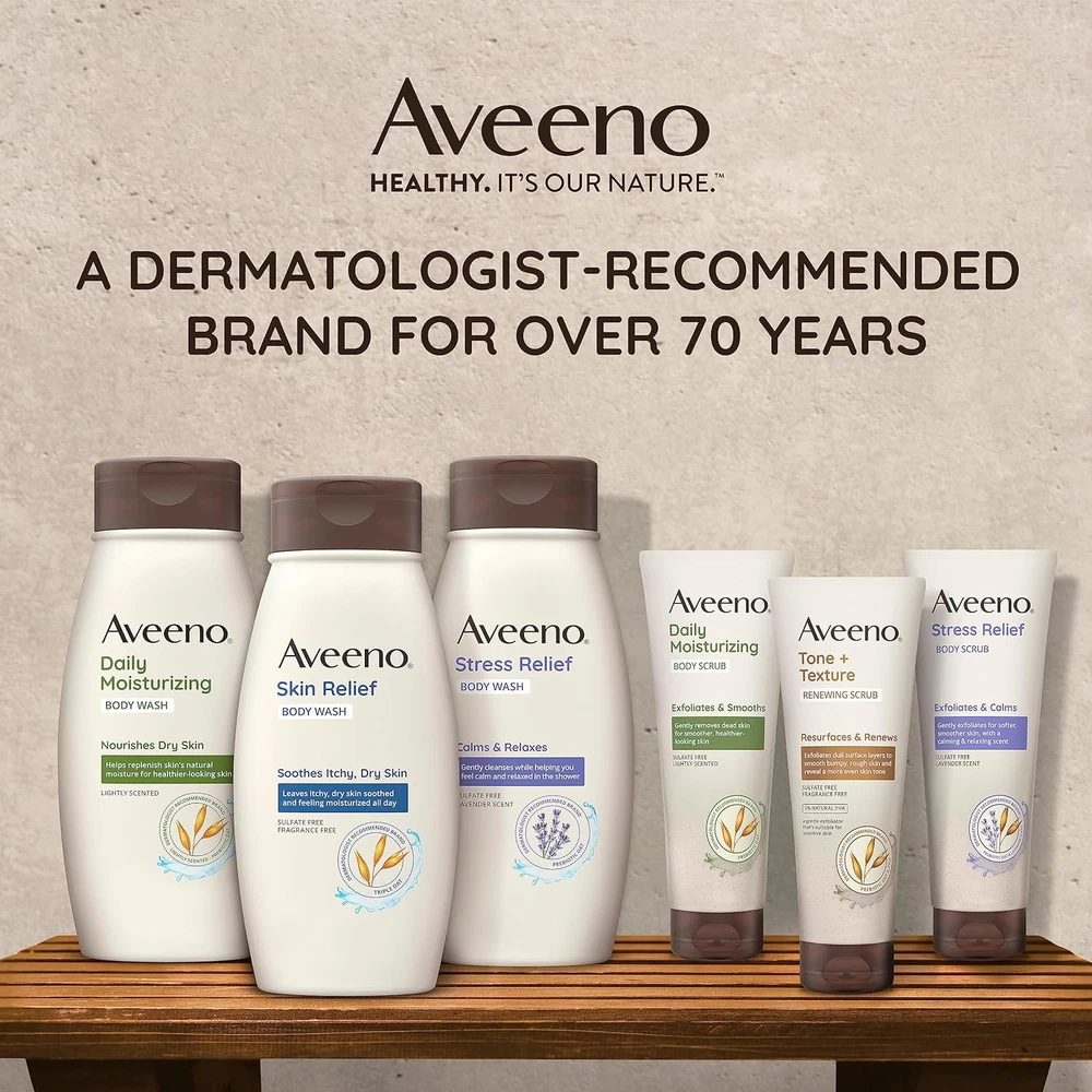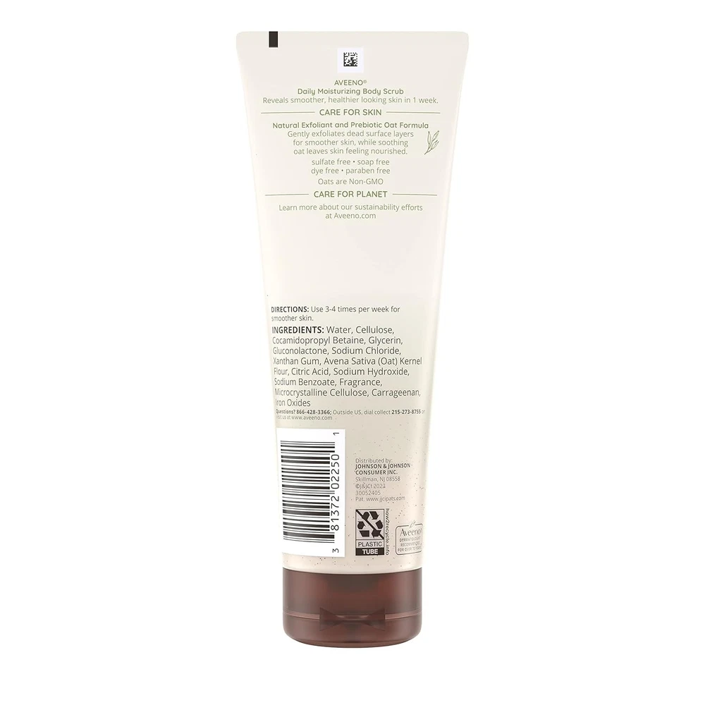 Aveeno Daily Moisturizing Body Scrub, Exfoliating 8 Fl Oz (Pack of 1) Product Details Product Dimensions : 7.9 x 3 x 1.95 inches; 8.64 ounces Item model number : CUNYAX Manufacturer : Kenvue Country of Origin : USA Brand: Aveeno Item Form: Cream Skin Type: Dry Product Benefits: Exfoliating,Moisturizing Material Feature: Natural 8-ounce tube of Aveeno Daily Moisturizing Body Scrub gently exfoliates and removes dead skin for smoother, healthier looking skin in just one week The natural exfoliant works to gently exfoliate dead surface layers for smoother skin, while soothing prebiotic oat formula leaves skin feeling nourished This gentle body scrub is lightly scented, features a formula made with prebiotic oat and is free of sulfates, parabens, dyes, and soaps To use, squeeze body scrub onto a wet washcloth or hands, work into a rich, creamy lather and rinse. Use 3-4 times per week for smoother skin From the dermatologist-recommended brand for over 70 years, Aveeno uses the goodness of nature and the power of science to keep skin healthy and balanced Gently exfoliate and remove dead skin with Aveeno Daily Moisturizing Body Scrub. This exfoliating body scrub from a dermatologist-recommended skin care brand for over 70 years works to exfoliate dead surface layers for smoother, healthier looking skin in just one week. Formulated with prebiotic oat to leave skin feeling nourished, the lightly scented, body scrub with moisturizing ingredients is soap-, sulfate-, paraben-, and dye-free. To use, squeeze the body scrub onto a wet washcloth or hands, work into a rich, creamy lather, and rinse. For results, use 3-4 times per week.