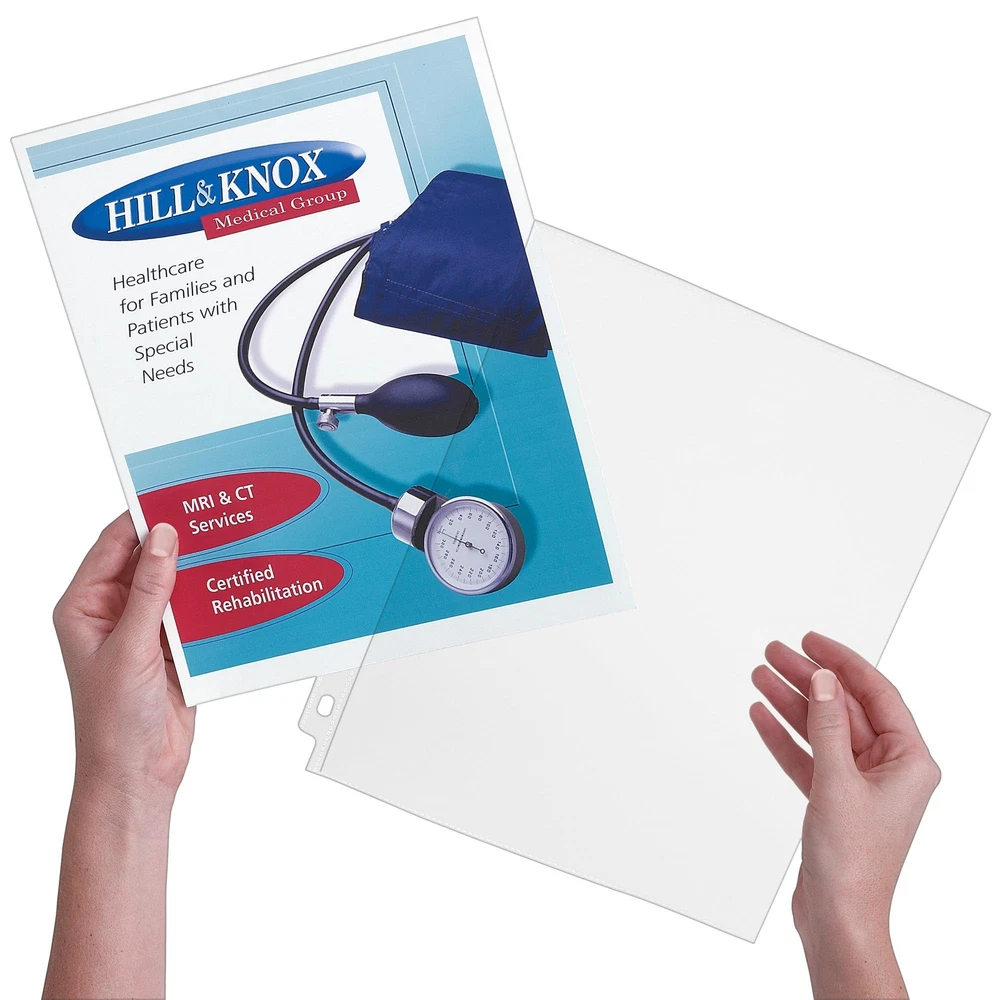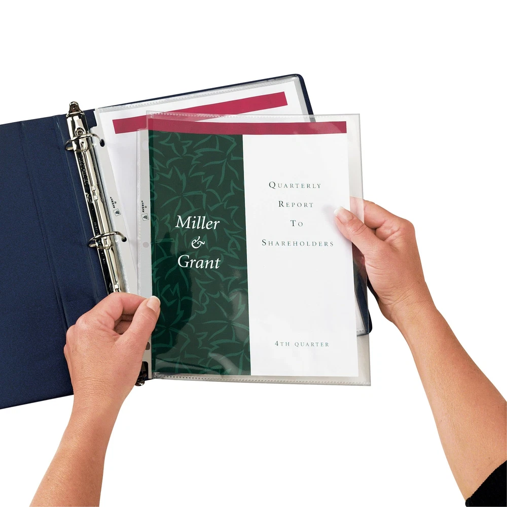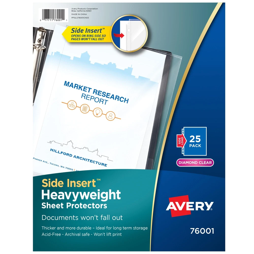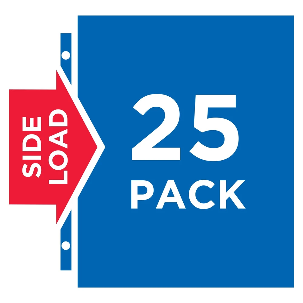 Make sure your papers are secure for safe keeping with diamond clear Side Insert Sheet Protectors. The side-load opening, which enables you to load your papers from the side of the protector, faces the binder’s rings so your important documents stay secure. These heavy duty page protectors are designed to both protect your papers and show them off impressively with diamond-clear material that delivers a crisp view of your documents, scrapbooking pages, recipes and more. Each plastic sheet protector holds sheets up to 8.5" x 11" and is made from acid-free and archival safe polypropylene that won't lift print. You can even use your clear plastic page protectors for 3 ring binders as a dry erase board. Jot down notes, check off items on your list, create practice lessons for kids or cross out tasks on your schedule by writing directly on the sheet protector with dry erase markers. When done, simply wipe the page protectors clean and reuse again and again. Give your frequently used documents, reports, recipes, photos and other important items the long-term protection and preservation they deserve with this pack of 25 diamond clear sheet protectors for 3 ring binders. Important documents stay secure in the durable sheet protector for 3 ring binders with side-load opening that faces the rings of your binder Get a crisp, clear view of the contents of your documents with diamond clear page protectors featuring a polished finish for high clarity Ideal for long term storage, papers and photos stay neat and clean with non-stick polypropylene material that is acid-free, archival-safe and won't lift or transfer ink from your documents Keep your important documents protected with thick and durable heavyweight sheet protectors perfect for frequently referenced documents Great for protecting and displaying important documents, recipes, photos, scrapbooking pages and more; item includes 25 clear sheet protectors