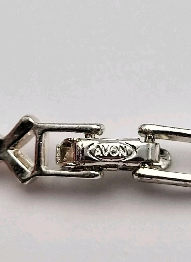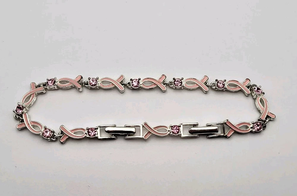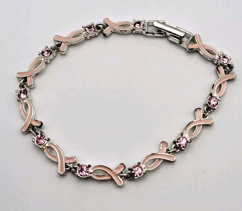 Show your support for breast cancer awareness with this stunning silver tone bracelet from Avon. Adorned with pink rhinestones and enamel pink ribbons, this bracelet is in great condition. Bracelet is 7” long & has 1.5“ extra link extender (if you need longer length)