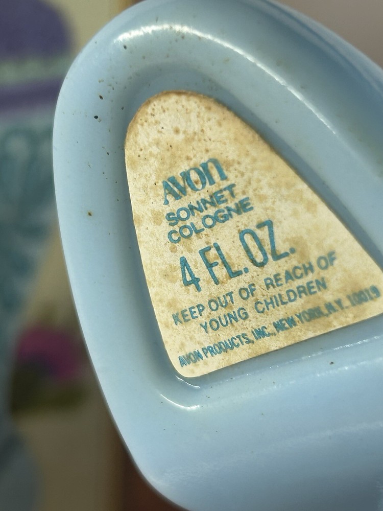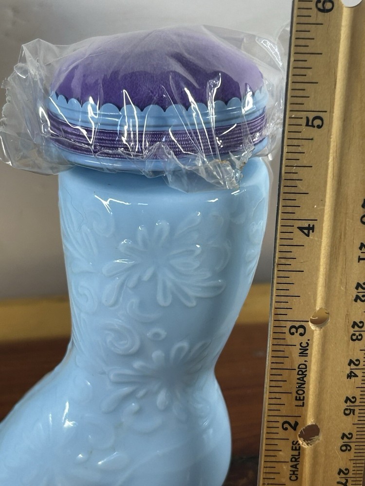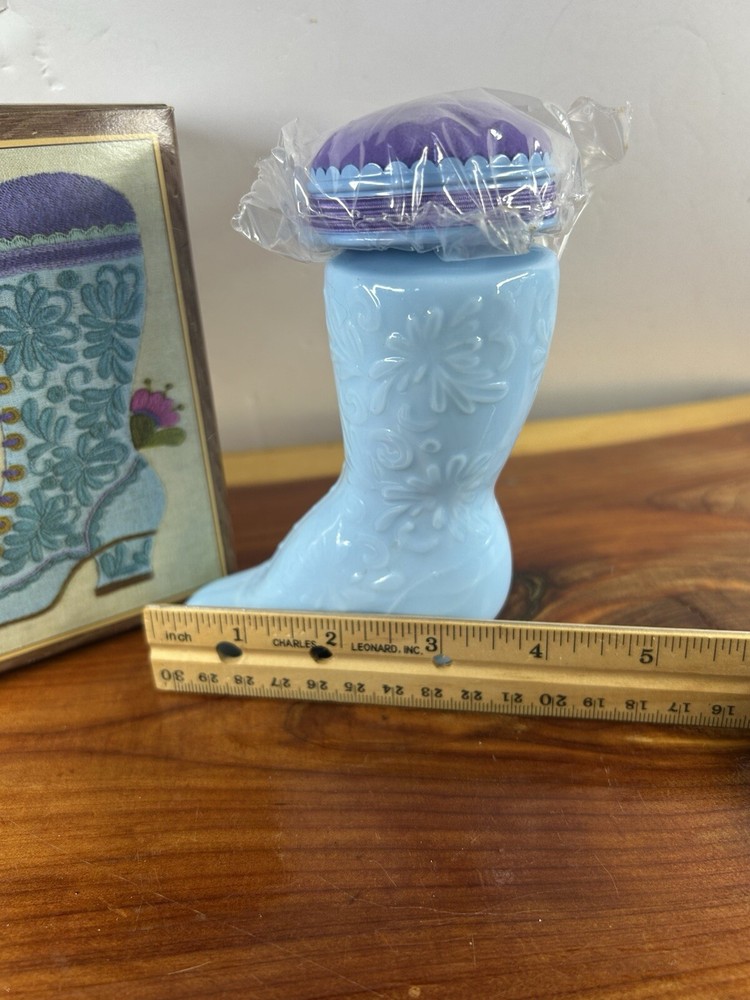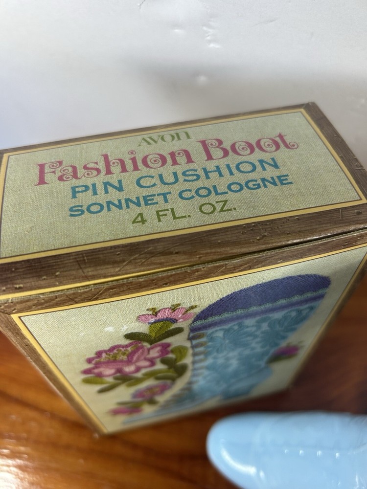 This Avon collectible item is a Fashion Boot Pin Cushion with Cologne, presented in its original box. The bottle is made of glass and features a blue color, with the Avon branding visible. This piece is part of the Avon collection and is an original, never-before-used item. Perfect for all occasions, this decorative bottle would make a unique addition to any collector's display.