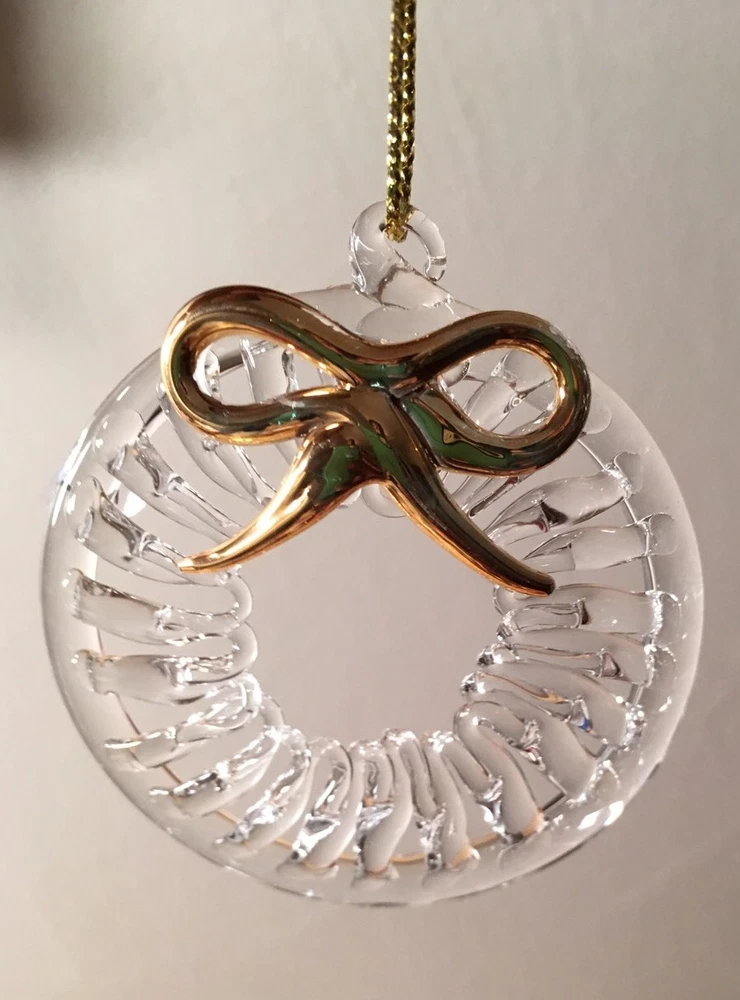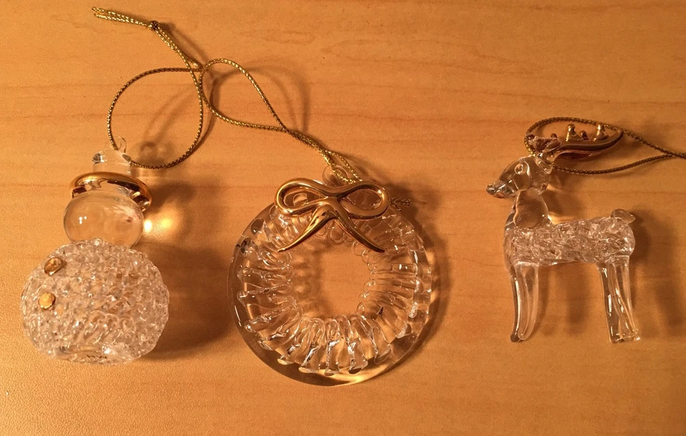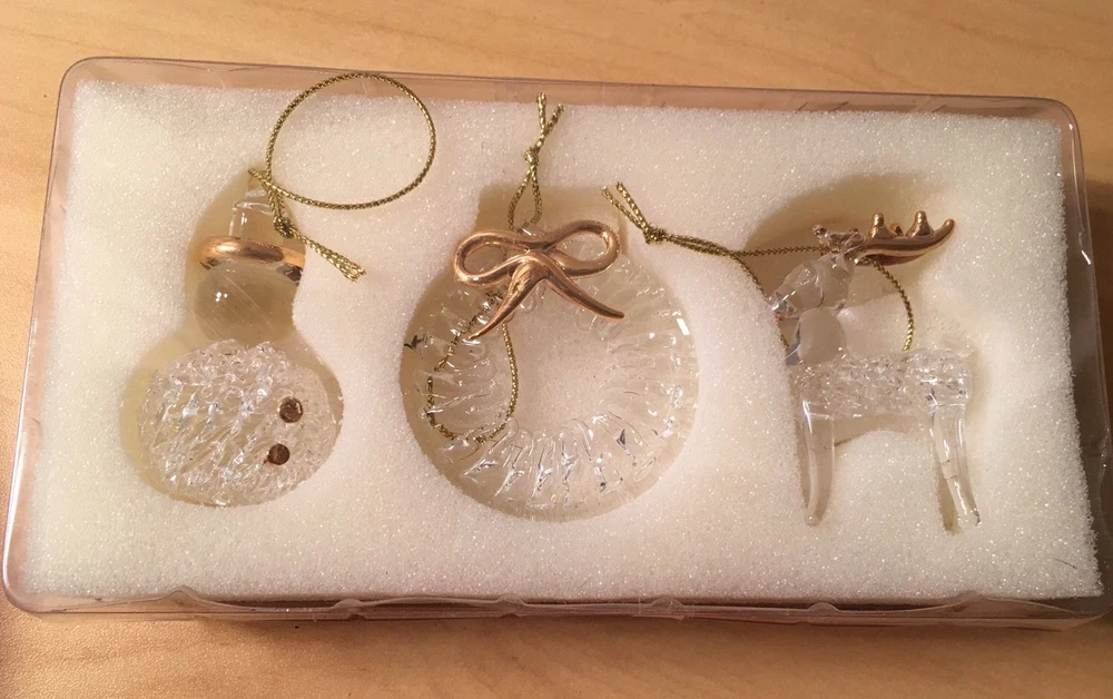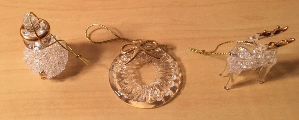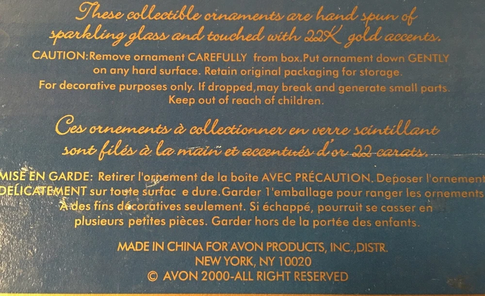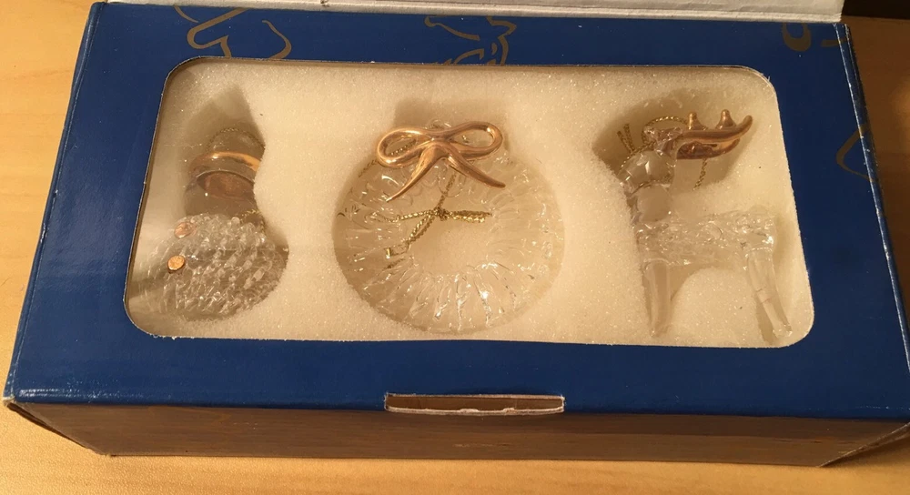 3 pcs. Set of collectible hand spun sparkling glass touched w/ 22K gold accents by Avon. New is original packaging. Box slightly scuffed from storage . Any green you see reflected off the gold is just that, a reflection. My phone which I took the pics is green.