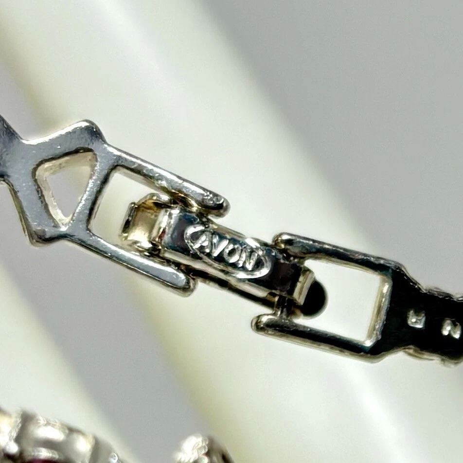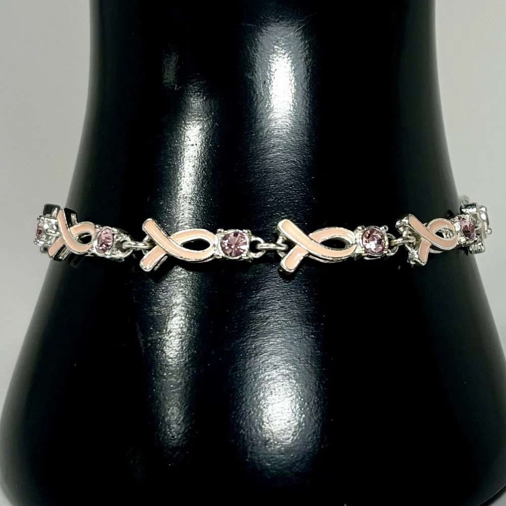 Avon Pink Ribbon Tennis Bracelet Breast Cancer Awareness Pink Rhinestones Size 7 Very good condition! There is a very small amount of discoloration on the clasp, otherwise the silver tone finish is intact and bright, as is the enamel finish on the ribbons. The pink rhinestones are clean and shiny. Please see pictures for details and message me with any questions.