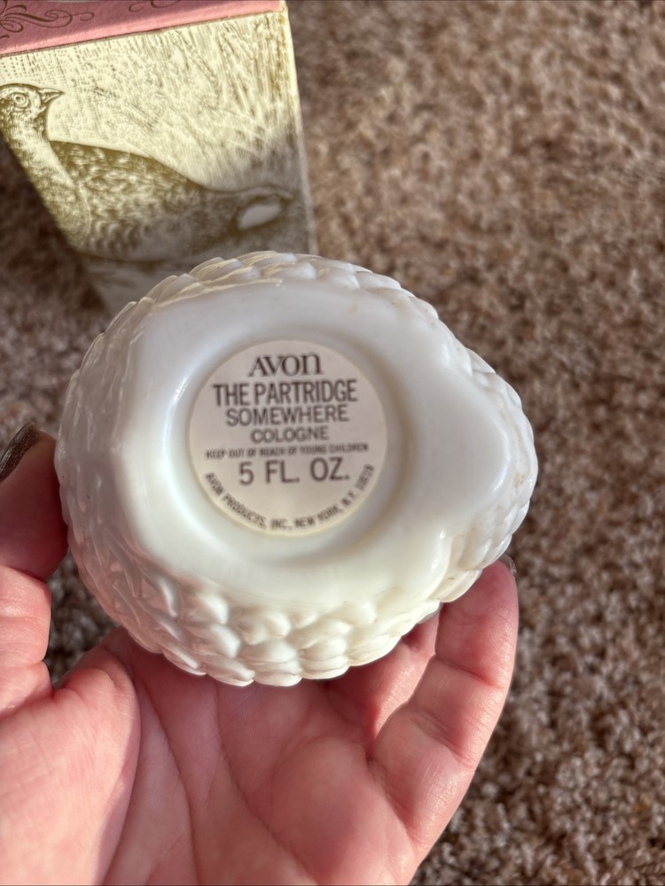 The Avon the Partridge Somewhere Cologne bottle is a vintage item from the 1970s, standing at 5 fl oz in size and made of milk glass with a glossy finish. This medium-sized bottle features a partridge character design, perfect for all occasions and suitable for any room in the house. The nostalgic 1970s style and bird theme make it a unique addition to any collection, with the Avon brand name adding a touch of authenticity to this original piece of advertising memorabilia. Made in the United States, this unboxed bottle is a charming relic of the late 20th century.