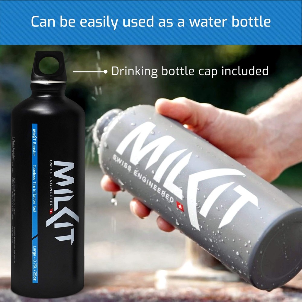 🏆 The Booster won an Eurobike Award as an innovative, high-quality mountain bike accessory, with judges calling the product a “must for mountain bikers”. 🚲 takes the installation of tubeless tires to the next level with the Booster. You don't need to invest in an air compressor or buy a tubeless floor pump. 🚲 The Booster is compact and lightweight (only 150 grams / 5.3 oz!) and can be brought along on the ride or easily stored in a small space at home. Without hoses or additional valves, full air pressure can be applied directly to the valve, making it more efficient than other inflators. With pressures up to 11 bar / 160 psi it can easily inflate tires up to 29 plus. 🚲 The Booster does not have a button that you need to press - it simply works by pushing it onto the valve stem which will action a spring valve. The booster is an inflation help to seat tubeless tires on your rim - it's not supposed to inflate the tire to full pressure (you do that with your pump afterward). It works with most Presta valves (doesn't work with Schrader valves) and the valve stem has to protrude at least 0.5in/13mm from the valve nut so it can open the internal slider in the booster head. 🚲 The Booster can be used with a bicycle pump and is compatible with most tubeless valves. For best results, use the valves to keep the air in the tire even with the valve cores removed - thanks to their patented rubber flaps. 🚲 2-in-1 product: The Booster can also be used as a water bottle, making it the perfect 2-in-1 product for your ride. No need to take wasteful and pricey single-use CO2 cartridges on rides anymore! 🚲 The 0.75L / 25 oz bottle fits into a bottle cage and is still large enough to inflate even the most stubborn tires. A drinking bottle cap is included as well as a drawstring bag to store your booster head safely. QUICK AND EASY TIRE INFLATION: Just press the Booster directly on the valve and BOOST! The Booster is the most efficient solution for seating a tubeless tire on a rim. No air compressor needed and works with any bike air pump! INFLATE TIRES WITH A BOOST: Without hoses or additional valves, full air pressure of up to 11 bar / 160 psi is applied directly to the valve, successfully seating even the most stubborn tubeless tires on the rim. PERFECT 2-IN-1 ACCESSORY: Use the Booster as a water bottle and tubeless bike pump on your ride. Compact, light and easy to store, the Booster fits into a bottle cage. NO MORE CO2 CARTRIDGES: Save money and be more environmentally friendly. With the Booster, CO2 bike tire inflator cartridges are a thing of the past, saving you money and reducing waste. THE PERFECT CYCLING GIFT: The versatility and unique features of this product make it one of the best gifts and cycling accessories for cyclists you can find!