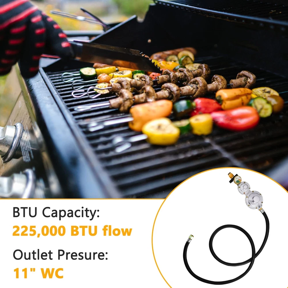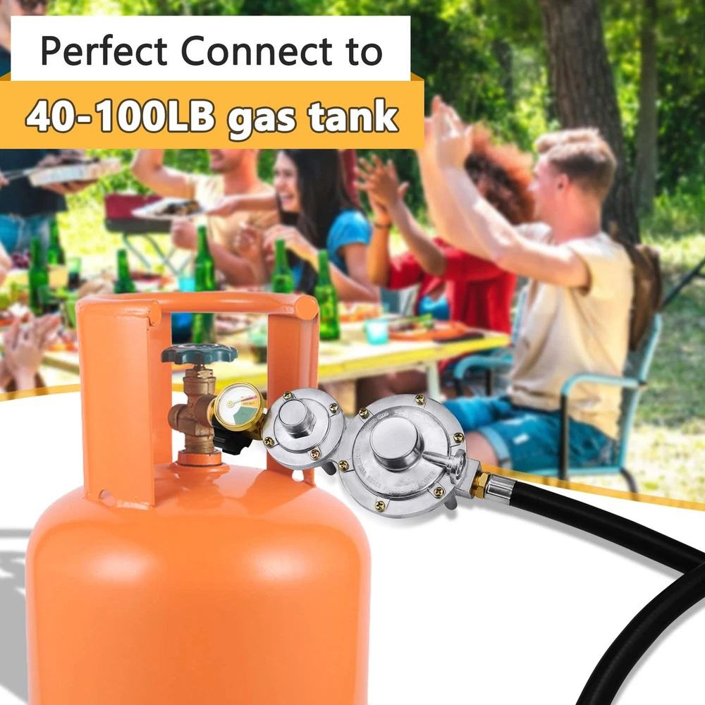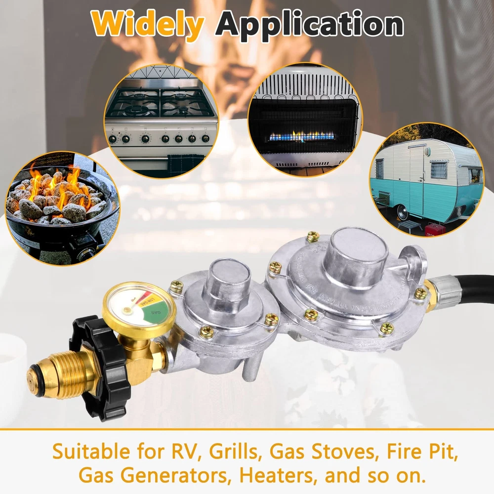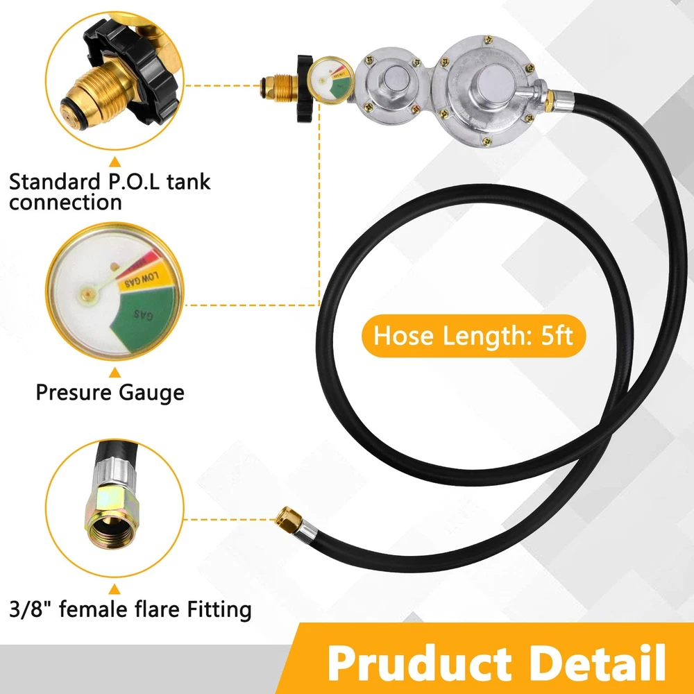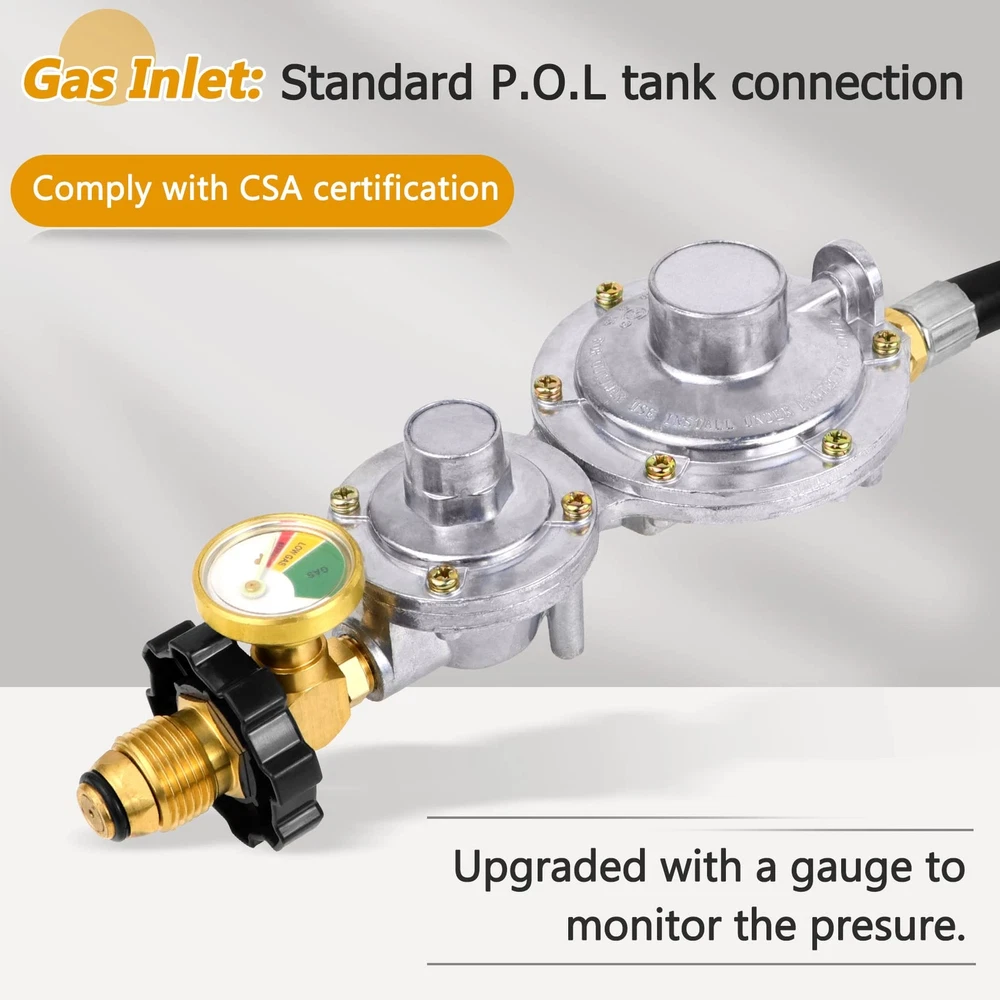 【Two-stage regulator】Two-stage regulator can secure a consistent inlet pressure between the first and second stage, and allow a smoother and greater propane gas flow in to the appliances. Perfect replacement for single stage regulator! WE UPGRADED THE DESIGN OF THE REGULATOR, AND SOLVED THE PROBLEM OF GAS LEACKAGE! 【Upgraded with Gauge】This 2 stage propane regulator with hose is upgraded with a gauge, so that you can easily monitor the gas pressure! 【Inlet & Outlet】Inlet: Standard P.O.L. tank connection, BTU Capacity: 150000BTU/hr. The outlet of this 2 stage propane hose has an inside 3/8 inch flare fitting and has an outside diameter of 5/8 inches, fits for RV, grill, heaters, fire pit, gas generator, gas stove/range, propane fireplace and so on. 【Good Quality】The 5FT 2 stage propane regulator with hose is made of high quality rubber, and the connectors are made of 100% heavy duty solid brass, providing a secure and sealed connection. Comply with CSA certification. 【Excellent Service】We are confident with our two stage propane regulator with hose, so we provide one year Service! If you have any questions, Please feel free to email us. We will give you a satisfactory answer within 12 hours.