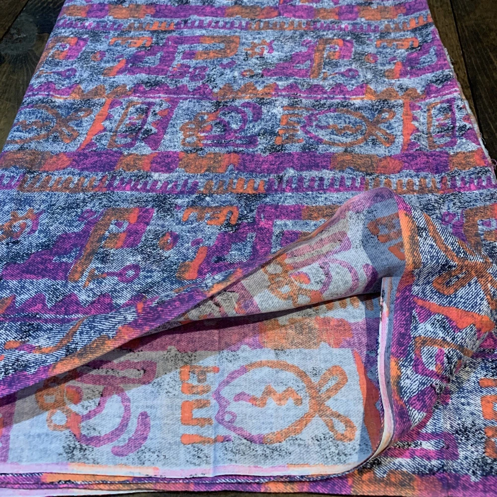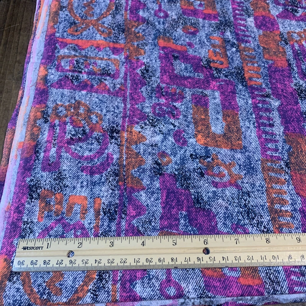 Very cool pattern orange and pink design on a blue denim looking background. The pattern is cross between Aztec / Abstract / Graffiti. Total yardage is 4 yards 17 inches x 44" wide.