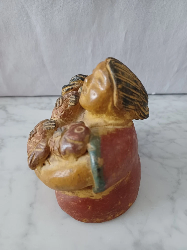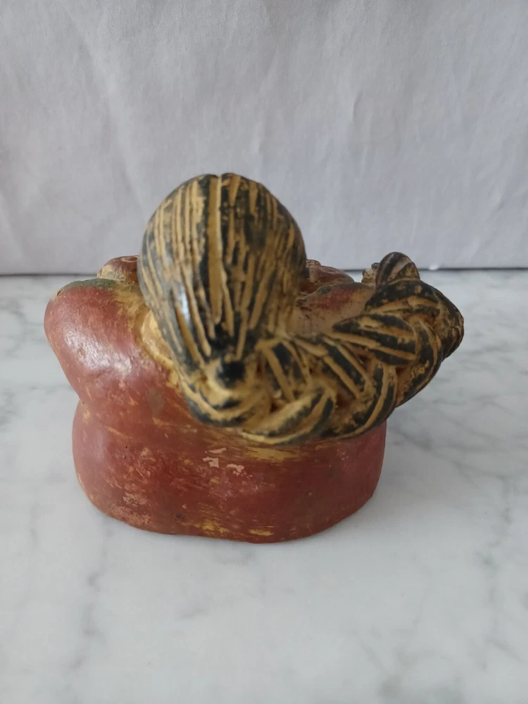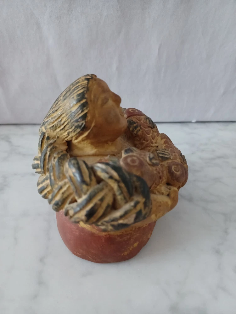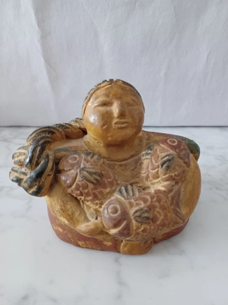 This unique statue embodies the rich cultural heritage of Mexico and Central America, featuring intricate Aztec-style details and rustic charm. Crafted by skilled artisans, this folk art piece stands at 4x4.5 inches and depicts an abuela (grandmother) in a primitive style. Perfect for collectors of Latin American cultures and folk art enthusiasts, this statue is a beautiful addition to any home decor. Its carefully crafted details and vibrant colors showcase the unique traditions of Mexican art. Add this one-of-a-kind piece to your collection and enjoy the beauty and history it brings.