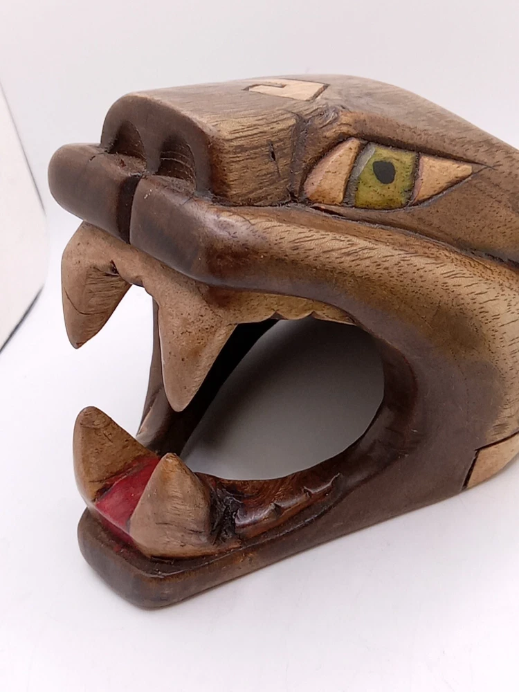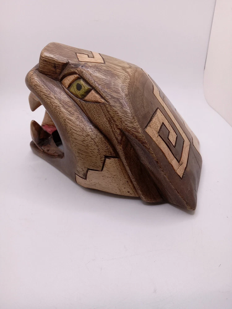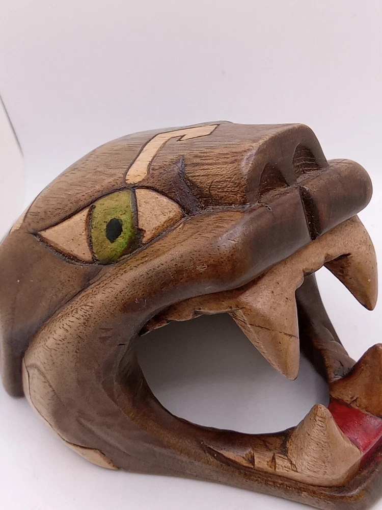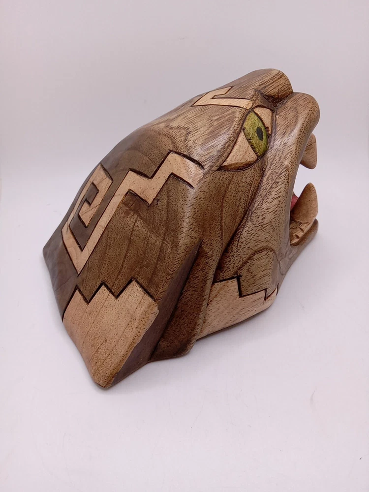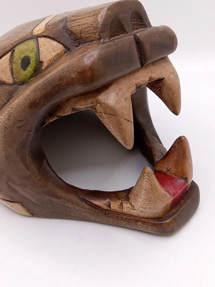This stunning Aztec/Mayan MCM hand-carved jaguar head is a one-of-a-kind piece of Latin American folk art. The intricate details of the jaguar head are a testament to the skilled artisans who created it. The piece is perfect for collectors of Latin American culture and artifacts. The jaguar head is a symbol of strength, power, and protection in the Aztec and Mayan cultures. This piece is a unique and cool addition to any collection or home décor. Its authenticity and quality are guaranteed. Add a touch of Latin American heritage to your collection with this beautiful piece. Please see my other auctions for my other thrift store finds.