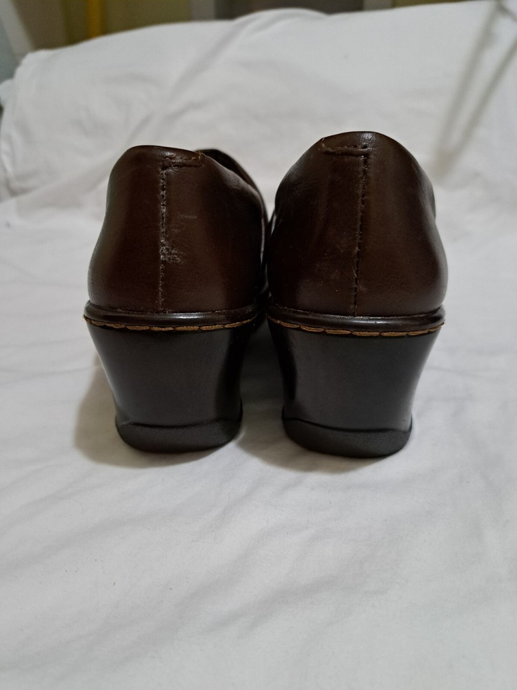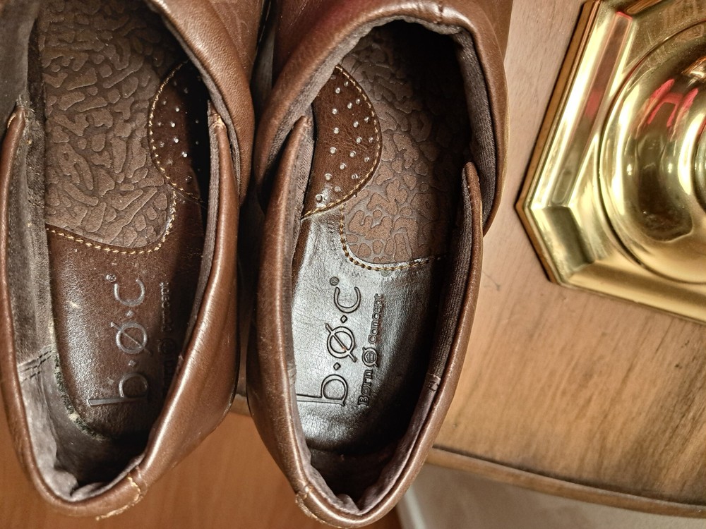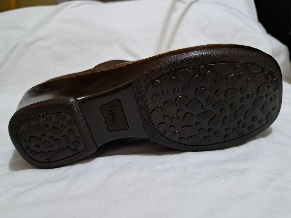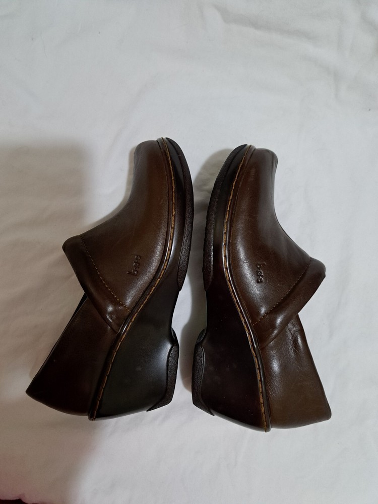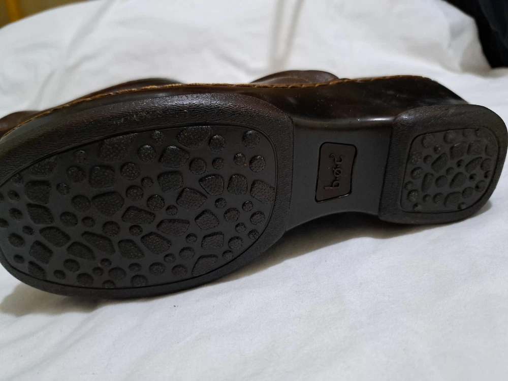Introducing the BØC Born Concept Peggy clog mule, a stylish and comfortable shoe perfect for casual occasions. Excellent used condition. Crafted with high-quality brown leather and faux leather lining, this shoe features a closed toe and slip-on closure for easy wear. The cushioned insole and non-slip outsole make it a great choice for walking in winter, fall, or spring. With a mid-height block heel and low top shoe shaft style, this shoe is both classic and modern. The solid pattern and brown color make it a versatile addition to any wardrobe. Available in US shoe size 7.5 and AU shoe size 8, this Børn brand shoe is a must-have for women who value comfort and style.