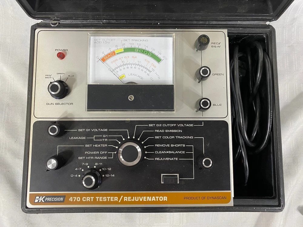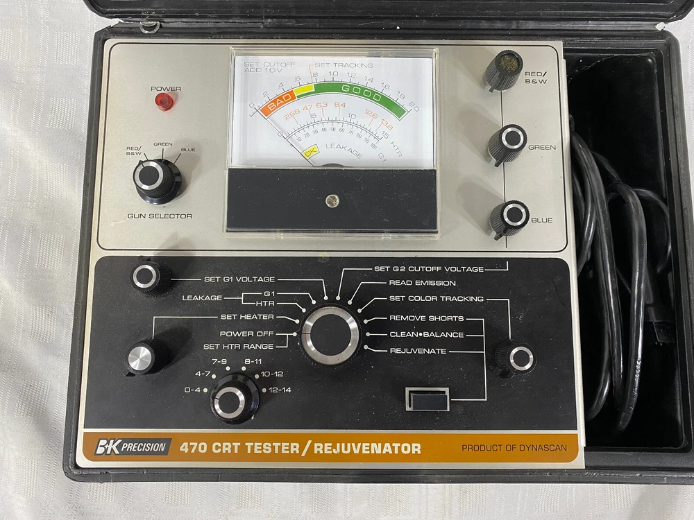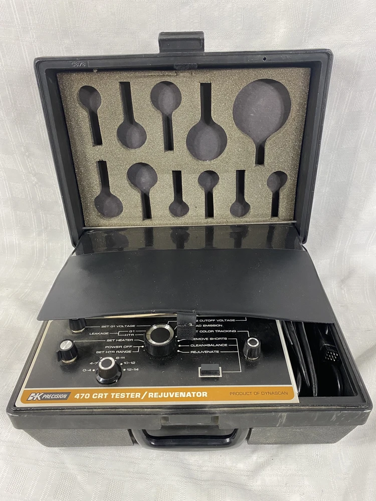 You are purchasing the 470 Picture Tube Tester / Rejuvenator by BK Precision, a product of Dynascan Corporation. This picture tube tester has been tested to power on, but no further testing has been performed. This unit has been garage kept for some time, so it is a little bit dusty. Other than that, it is in fantastic condition. Please take a minute to review the pictures, you will be receiving exactly what you see. Please feel free to contact me if you have any questions.