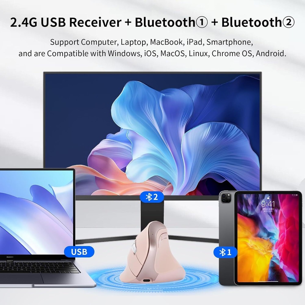 B310 Ergonomic Mouse, Vertical Wireless Mouse, 2.4G USB Receiver and Two Bluetooth, RGB Light, Rechargeable Multi Devices Mouse for Computer, Laptop, iPad, MacBook Pro/Air (Pink) The lengthened "ramp" design is ergonomic, allowing for a more natural grip, reducing the friction between the wrist and the desk, reducing muscle soreness, and avoiding the blackening of the wrist skin due to long-term friction. 8 adjustable light modes, with light adjustment button, Type-C charging port, charge for two hours can be used for 60 days (light-off mode), if you keep the lights on, you need to charge them every 1-2 days. Three wireless connection channels, suitable for multiple devices (2.4G USB receiver, Bluetooth 1, Bluetooth 2), support multi-device switching. All buttons are silent, whether it is working or playing games, it will not disturb others. Support for Desktop, Laptop, MacBook, iPad and Smartphone, compatible with Windows, MacOS, iOS, Android, Linux and Chrome OS. B310 Ergonomic Mouse, Vertical Wireless Mouse, 2.4G USB Receiver and Two Bluetooth, RGB Light, Rechargeable Multi Devices Mouse for Computer, Laptop, iPad, MacBook Pro/Air (Pink) The lengthened "ramp" design is ergonomic, allowing for a more natural grip, reducing the friction between the wrist and the desk, reducing muscle soreness, and avoiding the blackening of the wrist skin due to long-term friction. 8 adjustable light modes, with light adjustment button, Type-C charging port, charge for two hours can be uséd for 60 days (light-off mode), if you keep the lights on, you need to charge them every 1-2 days. Three wireless connection channels, suitable for multiple devices (2.4G USB receiver, Bluetooth 1, Bluetooth 2), support multi-device switching. All buttons are silent, whether it is working or playing games, it will not disturb others. Support for Desktop, Laptop, MacBook, iPad and Smartphone, compatible with Windows, MacOS, iOS, Android, Linux and Chrome OS. × × × × × × × Buy now and save! Shipping info Click the Shipping & Payments tab above the listing description for more info Click the Shipping & Payments tab above the listing description for more info! Additional delivery notes PICK UP OPTION Sorry, our items are NOT available for pick-up. PAYMENT Immediate payment is required upon selecting "Buy It Now" or upon checking out through the cart. We accept payment via U.S. PayPal accounts and all Major Credit Cards, Debit Cards & Google Pay. We are legally required to collect sales tax in those states and localities where we maintain a physical presence (nexus). The applicable amount of sales tax charged to an order will be calculated based on the shipment destination's state and local sales tax laws. Thank you for shopping with us on eBay! Additional Information No additional information at this time Ask seller a question You might also like Jingle all the Way! 4.5" Square Shadow Box Rite Lite 2 pack wooden Dreidel Rite Lite The Dreidel Game Chanukah Painted Wooden Dreidels Set of 4 - Hanukkah Aurora Marius Nutcracker Bear Blue Contact To contact our Customer Service Team, simply click the button here and our Customer Service team will be happy to assist. Ask seller a question © Morning Glory Resale Shipping & Payments Click the Shipping & Payments tab above the listing description for more info Payment Accepted Payment Methods Immediate payment is required upon selecting "Buy It Now" or upon checking out through the cart. We accept payment via U.S. PayPal accounts and all Major Credit Cards, Debit Cards & Google Pay. We are legally required to collect sales tax in those states and localities where we maintain a physical presence (nexus). The applicable amount of sales tax charged to an order will be calculated based on the shipment destination's state and local sales tax laws. Thank you for shopping with us on eBay! Returns Returns are not accepted Seller will pay for return shipping. eBay integration by