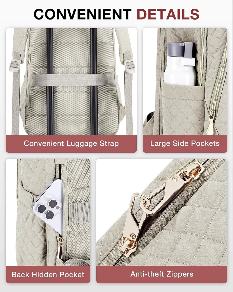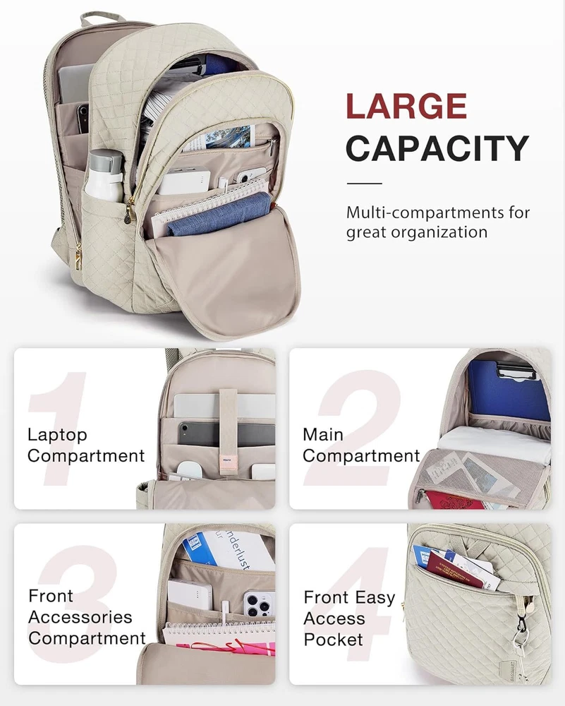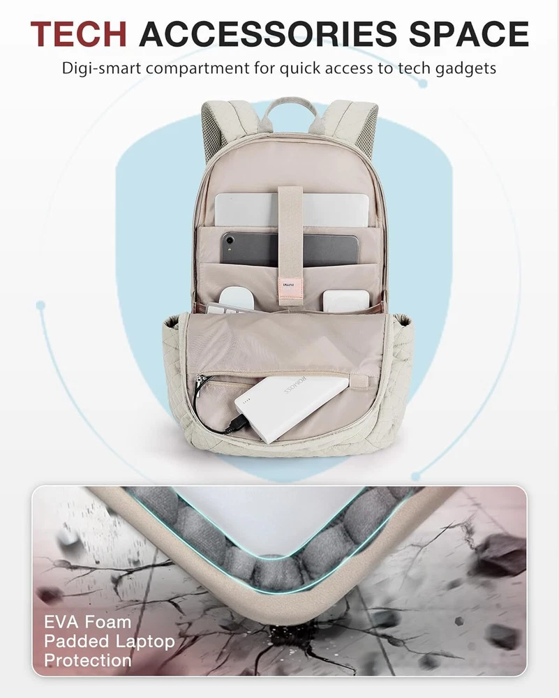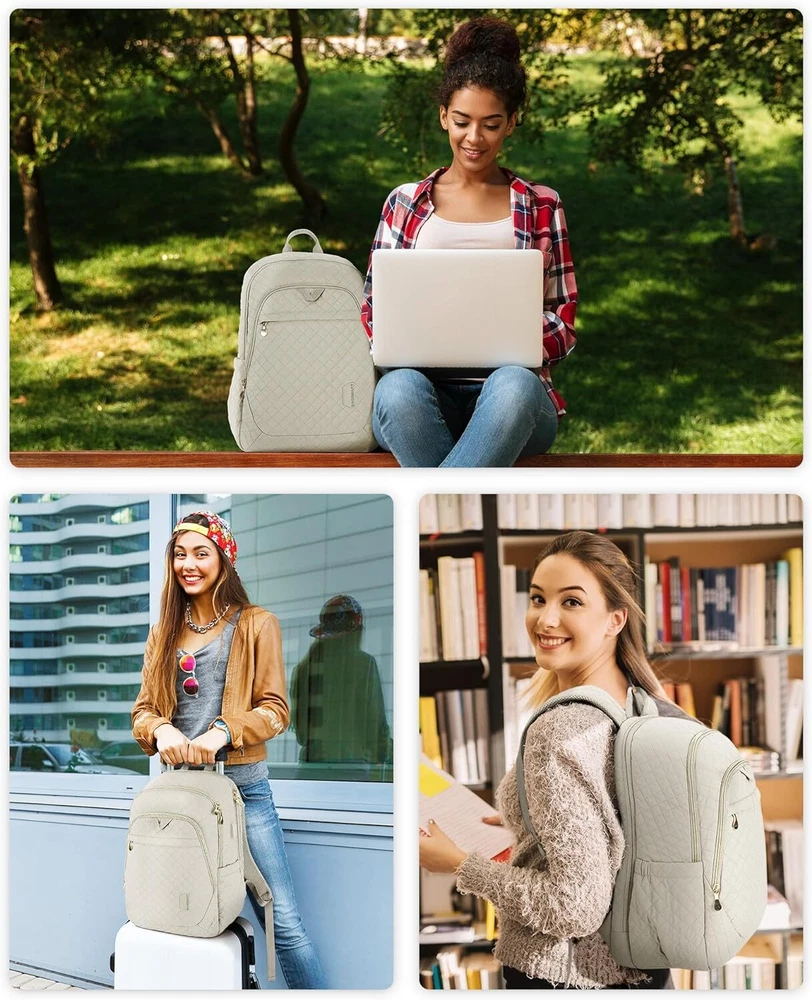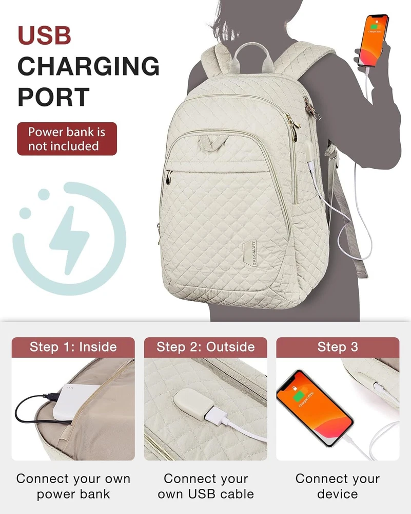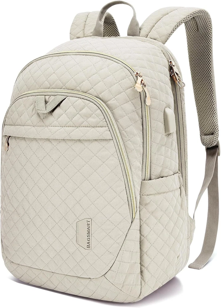 BAGSMART Travel Laptop Backpack Women, 15.6 Inch Anti Theft Beige Product Details Standing screen display size: 15.6 Inches Large Capacity: Dimensions 18.5 * 12.5 * 7 inches, The laptop backpack has multiple divider pockets, The laptop compartment with anti-theft zippers is suitable for a laptop up to 15.6", padded with EVA foam can offer optimal protection for your laptop. Tablet slot fits up to 12.9’’ iPad. Mesh pockets for mouse, adapter, and charging cord. Large main compartment roomy for daily necessities, such as A4 folders, textbooks, magazines, chargers, power bank and clothes Convenient Pocket: Front zippered pocket of the travel backpack allows you to put your small items in an organized manner. With a hidden anti theft pocket on the back protect your valuable items from thieves. Side pockets for water bottle or umbrella make your items organized and easier to find Comfy & Convenient: Ergonomic shoulder straps with a breathable mesh back panel can relieve pressure on the shoulders. Durable handles makes you more comfortable when gripping the back pack. Luggage strap allows backpack to slide over the luggage tube for easier carry-on travel USB Charging Port: With an inside charging cable and an outside USB port, the backpack offers an easy way to charge your devices. No need to keep power bank on the hand while walking or cycling. Also offers easy access to earphone usage Long-lasting Durability: BAGSMART bookbag for women is really brings out the best of our quilting process. Metal double-way zippers make opening/closing simple and fast. Many padding on the back and 2 ‘S’ curve padded shoulder straps make it comfortable to wear. The luggage strap ensure the backpack stand upright and easy to slide. Bagsmart backpack made of durable polyester fabric, ensures long-lasting usage